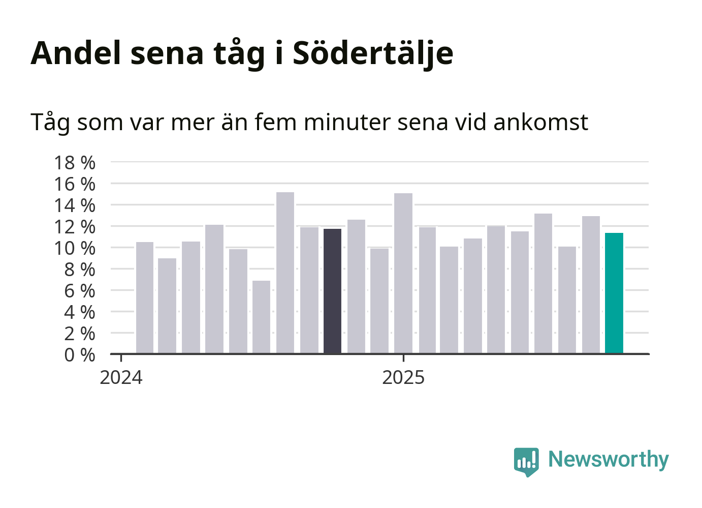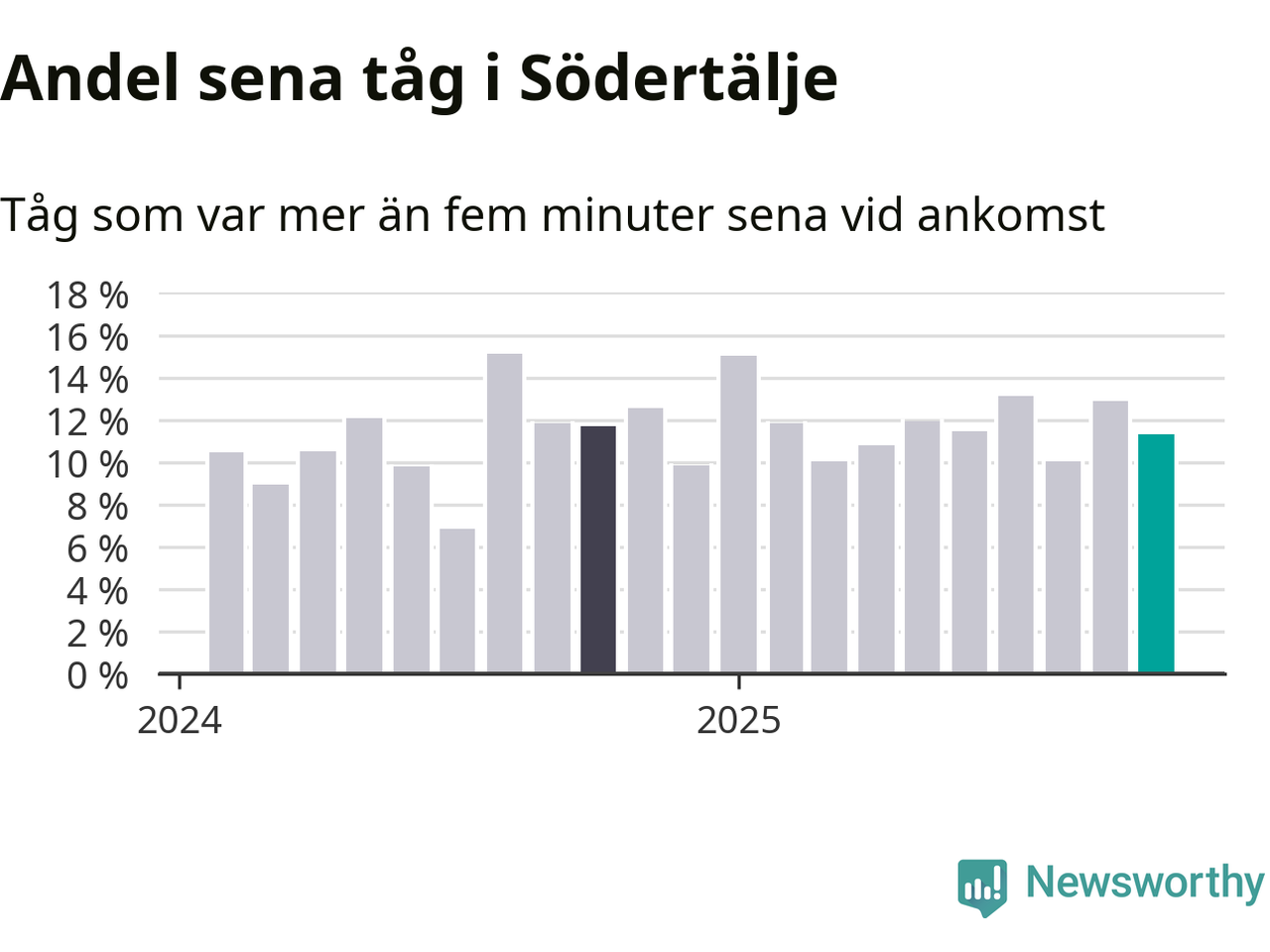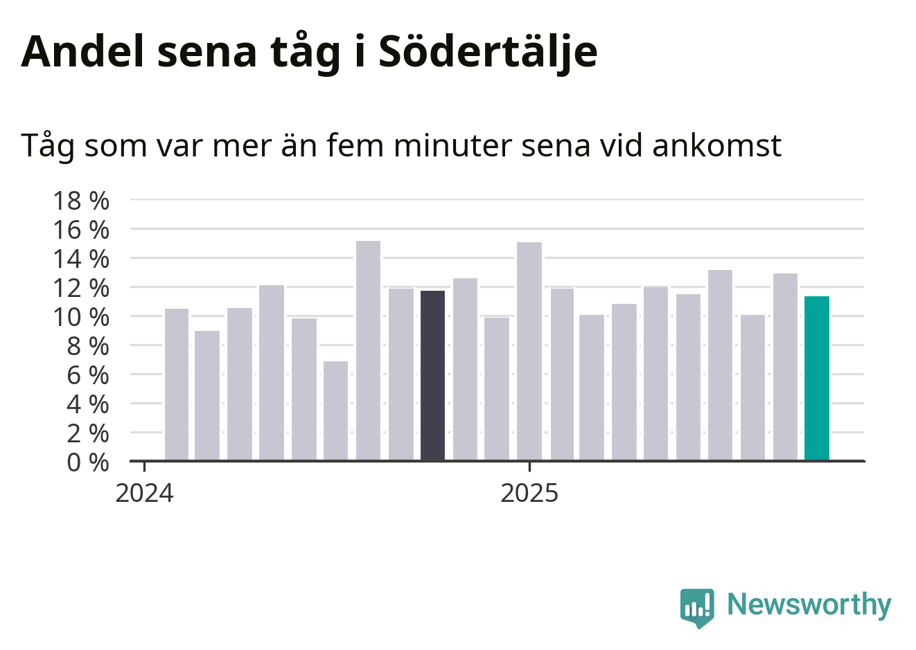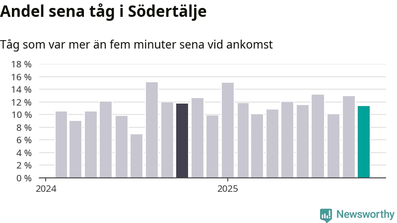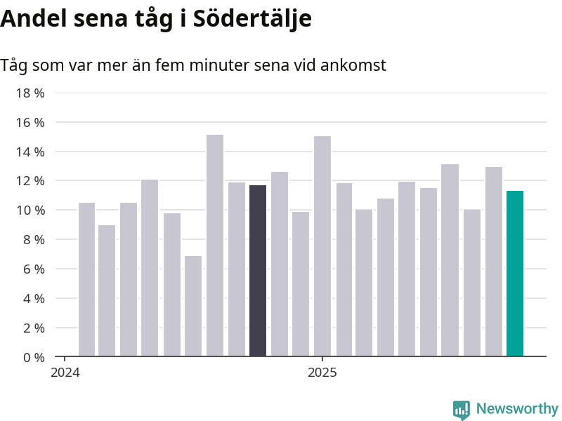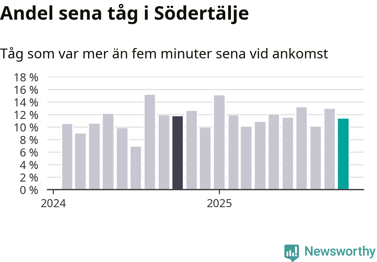 Elva procent kan jämföras med 13 procent månaden innan, och tolv procent i oktober 2024. Siffrorna bygger på realtidsinformation om tågavgångar och ankomster från Trafikverket, som Newsworthy löpande samlar in.