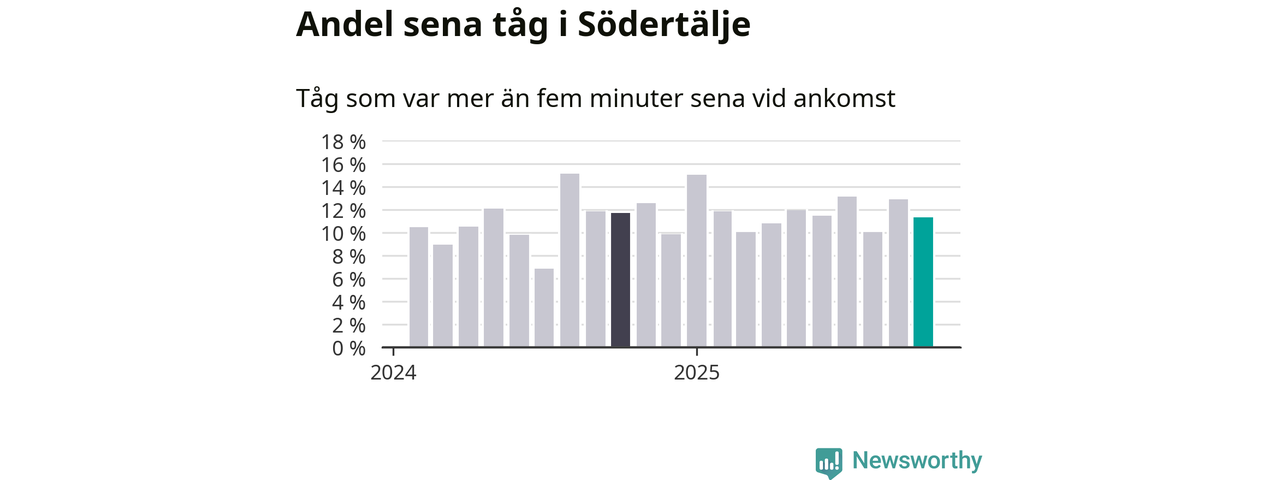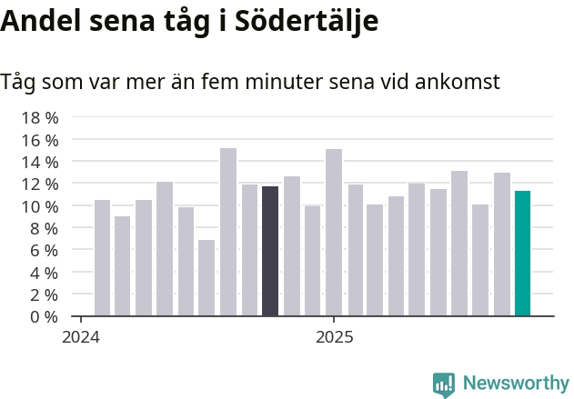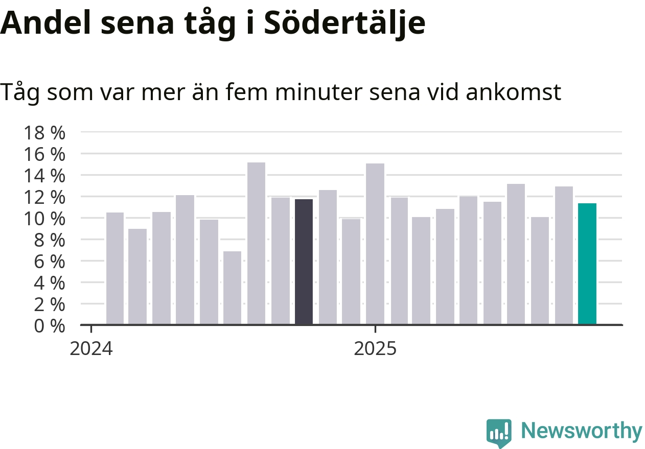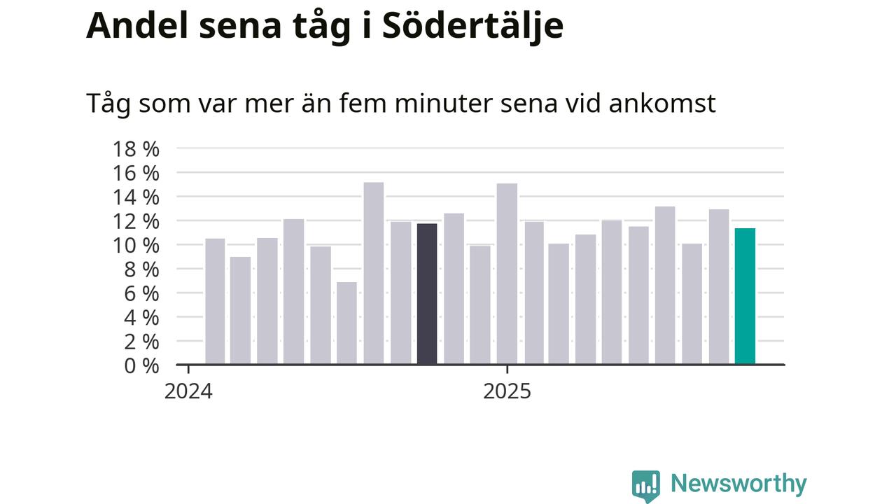 Av omkring 11 200 tåg som passerade någon av stationerna i Södertälje kommun i oktober var 1 271 mer än fem minuter sena. Det motsvarar 11 procent, en bit över den nationella målsättningen som säger att inte mer än fem procent av tågen ska vara sena.