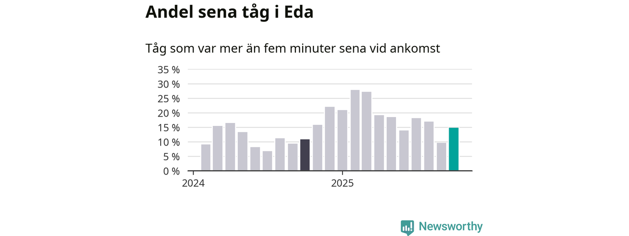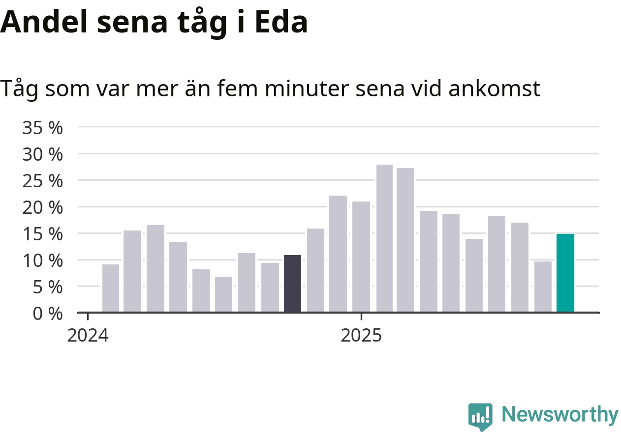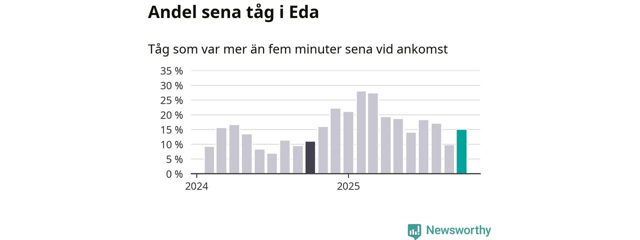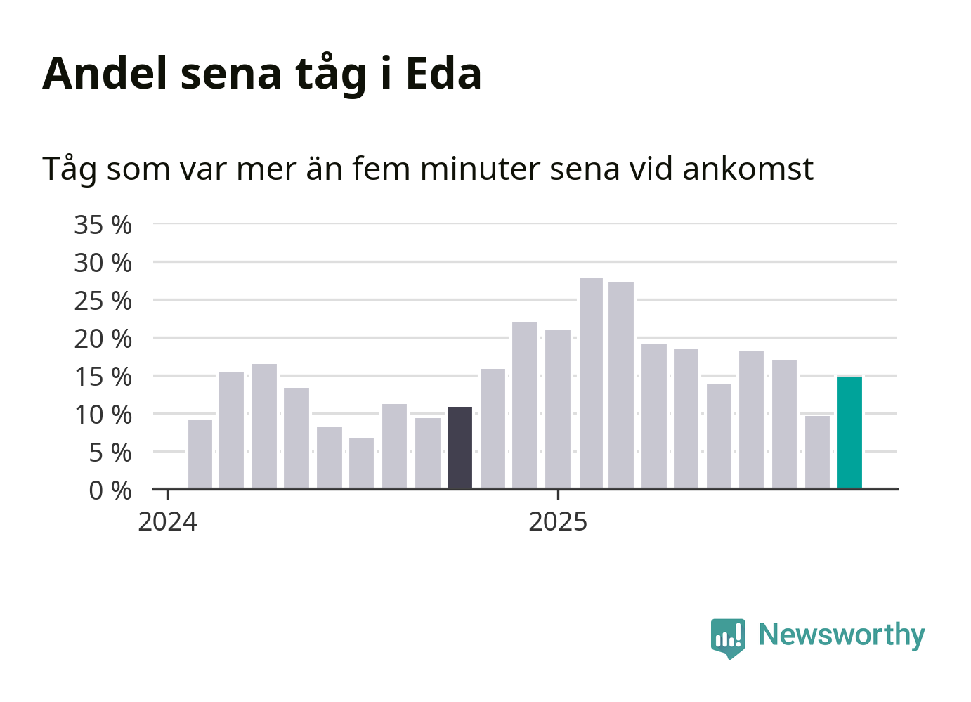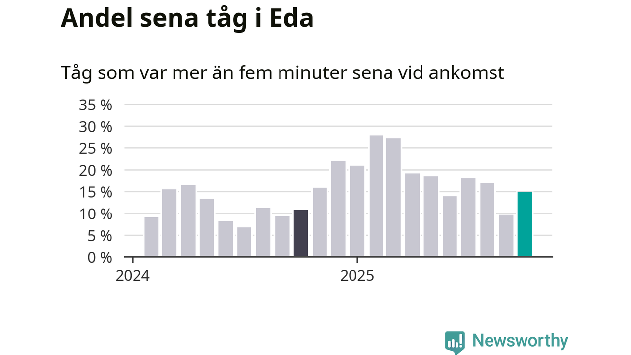 15 procent kan jämföras med tio procent månaden innan, och elva procent i oktober 2024. Siffrorna bygger på realtidsinformation om tågavgångar och ankomster från Trafikverket, som Newsworthy löpande samlar in.