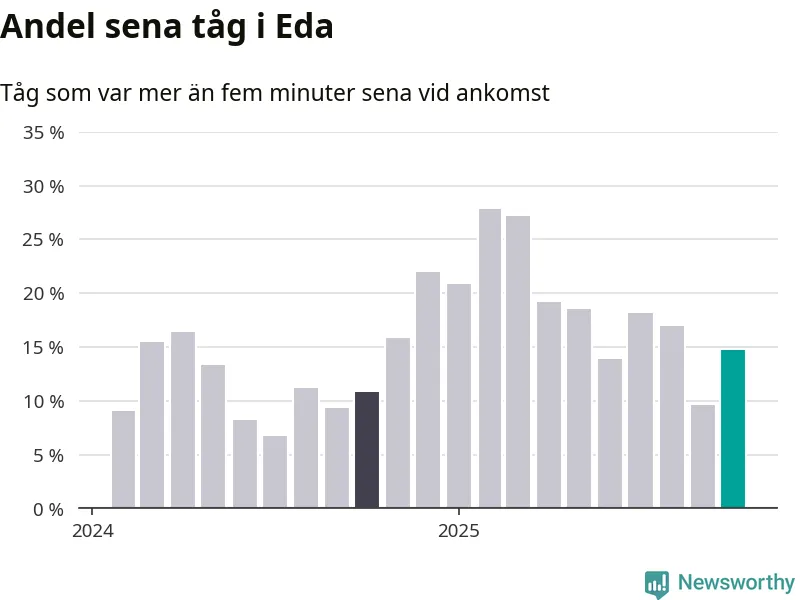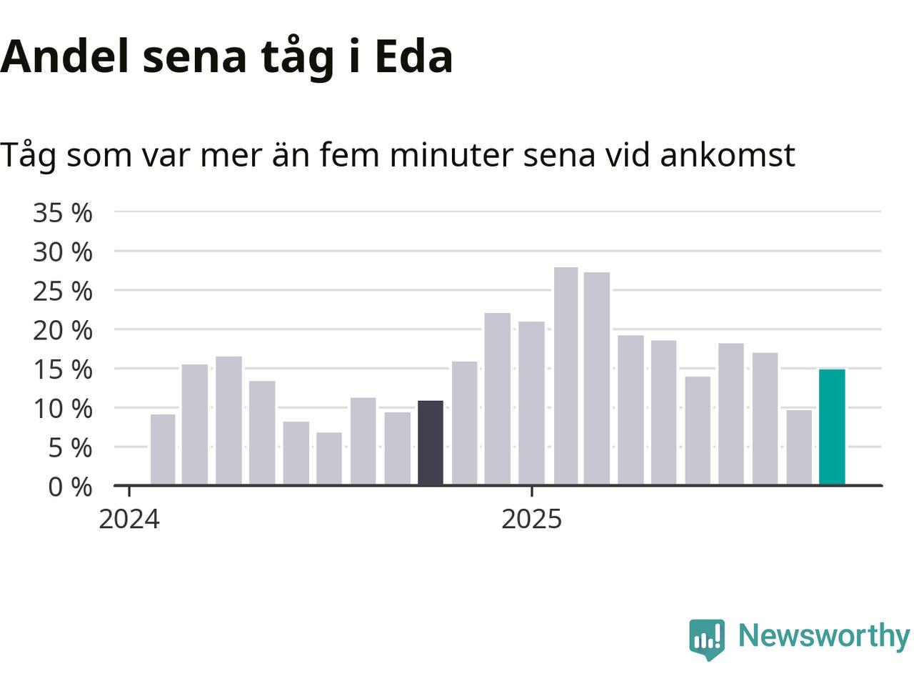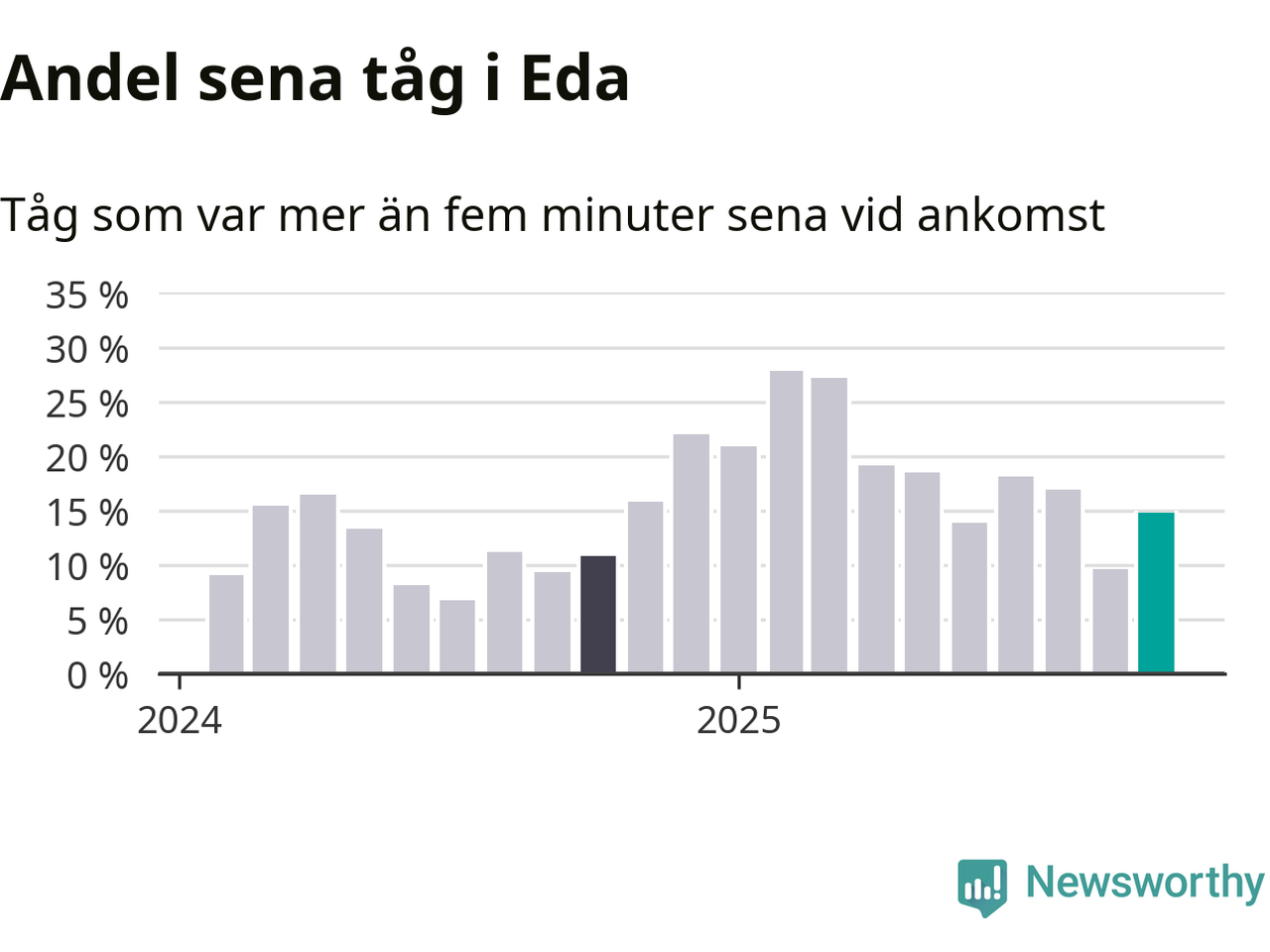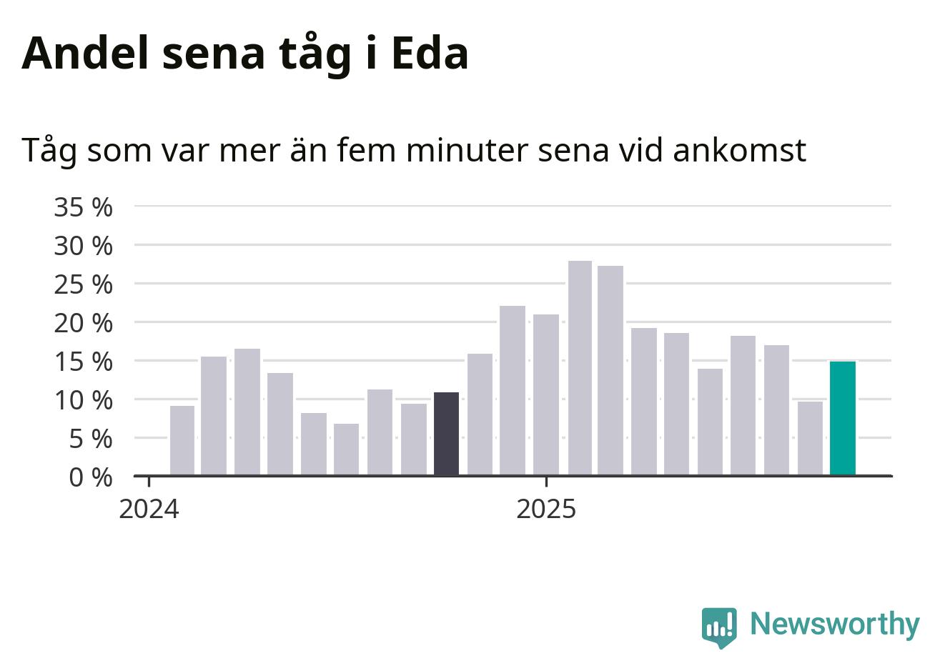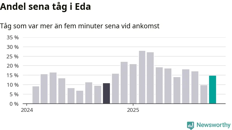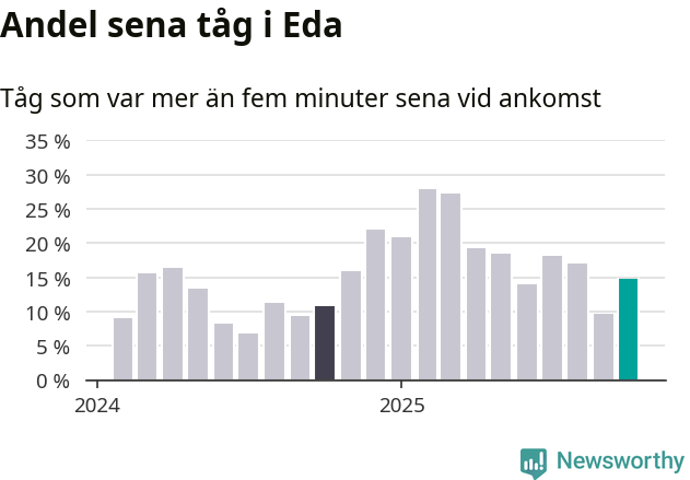 15 procent kan jämföras med tio procent månaden innan, och elva procent i oktober 2024. Siffrorna bygger på realtidsinformation om tågavgångar och ankomster från Trafikverket, som Newsworthy löpande samlar in.