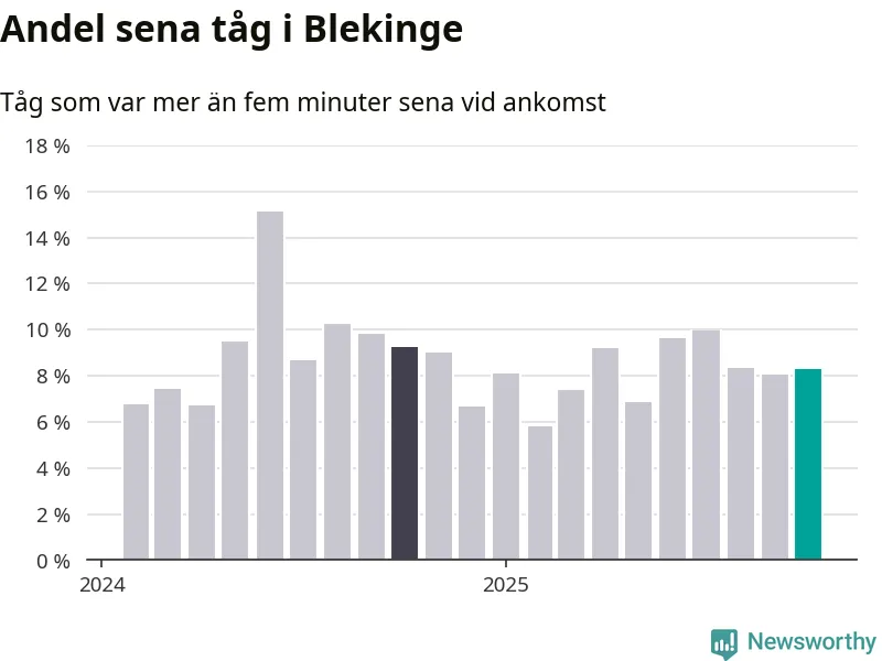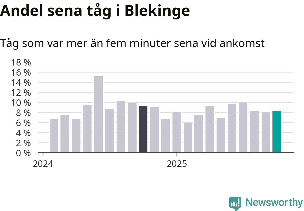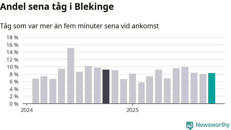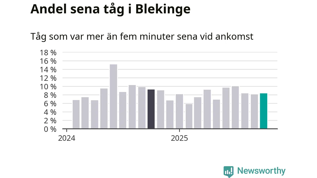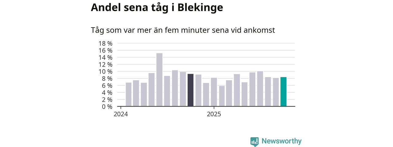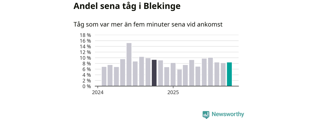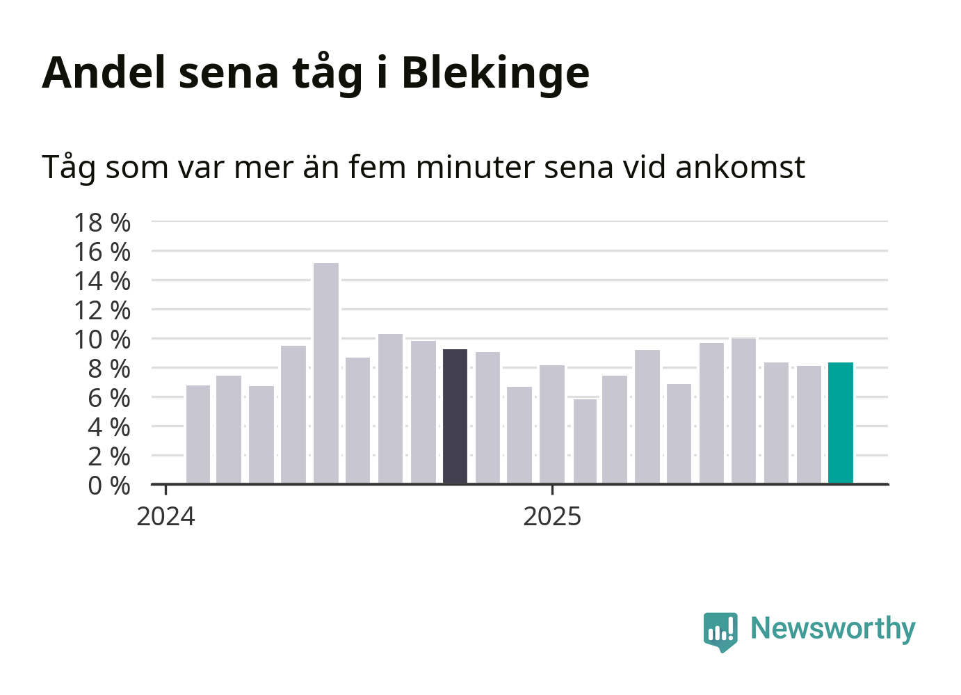 Åtta procent är marginellt mer än månaden innan, och kan jämföras med nio procent i oktober 2024. Siffrorna bygger på realtidsinformation om tågavgångar och ankomster från Trafikverket, som Newsworthy löpande samlar in.