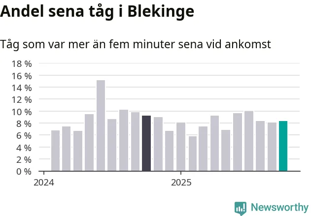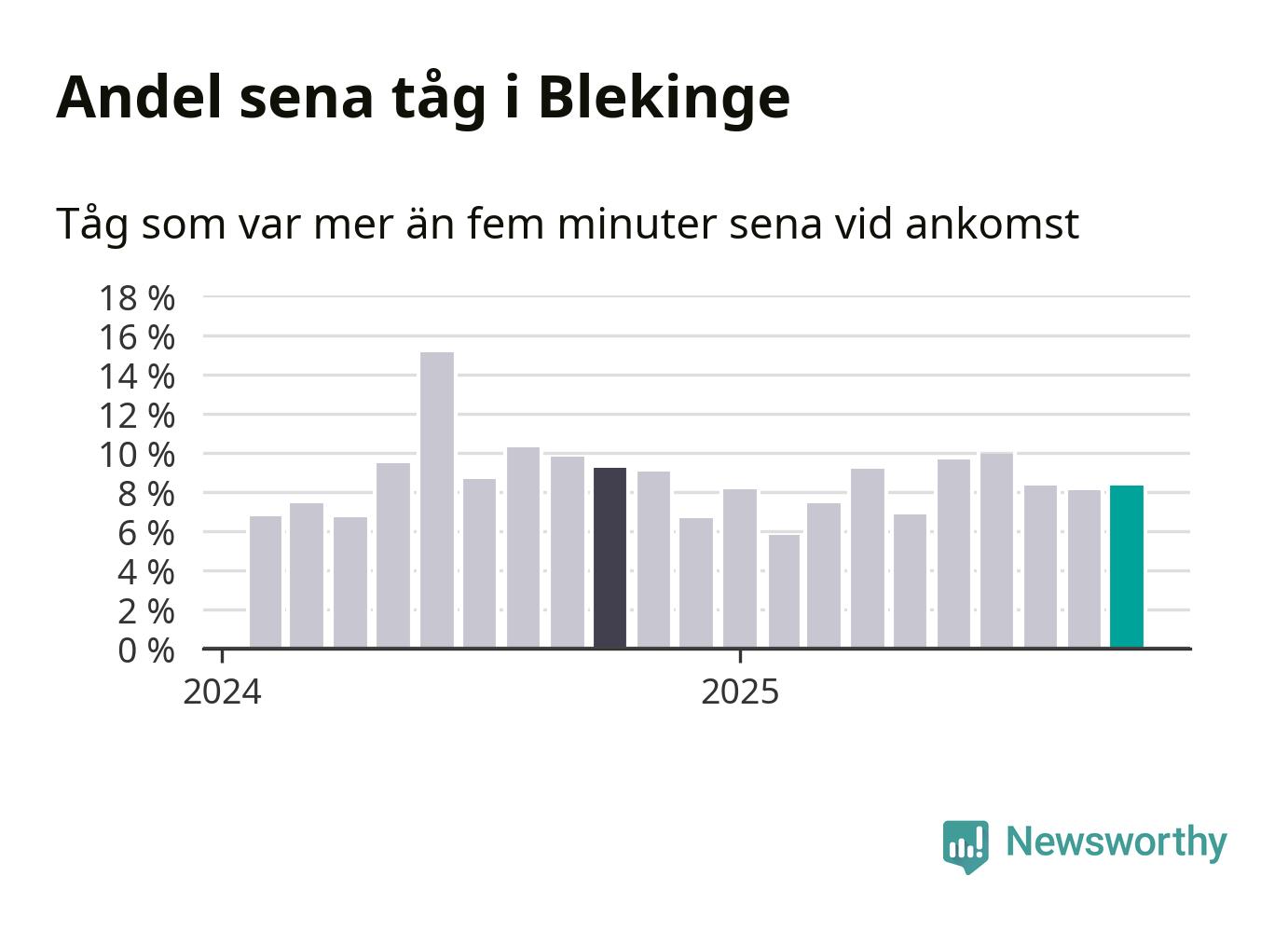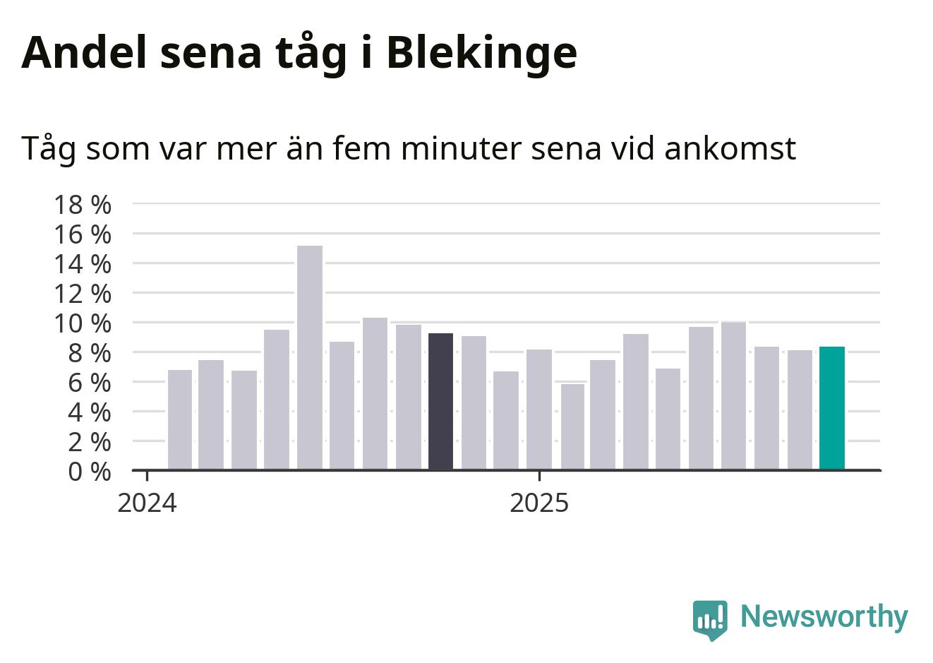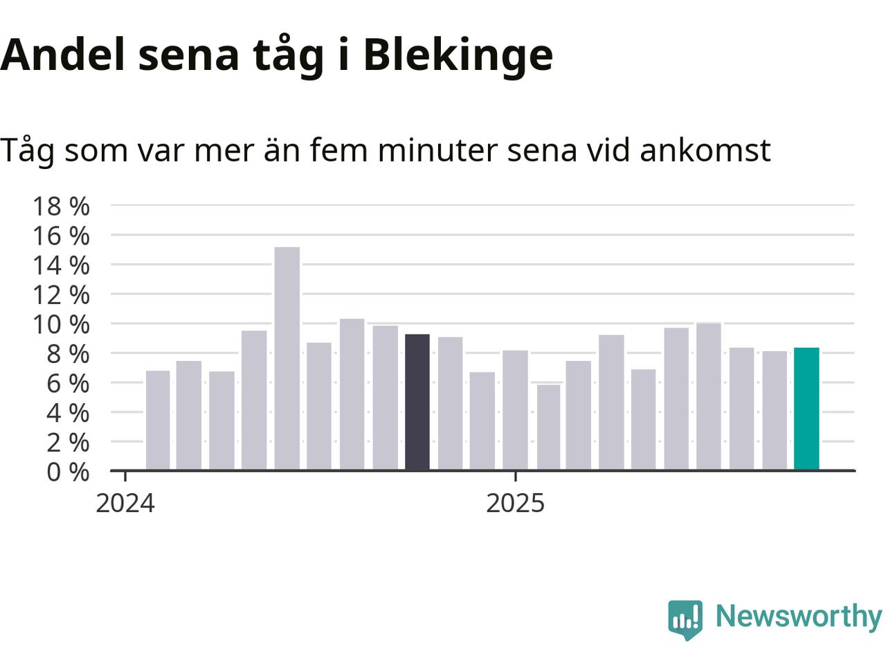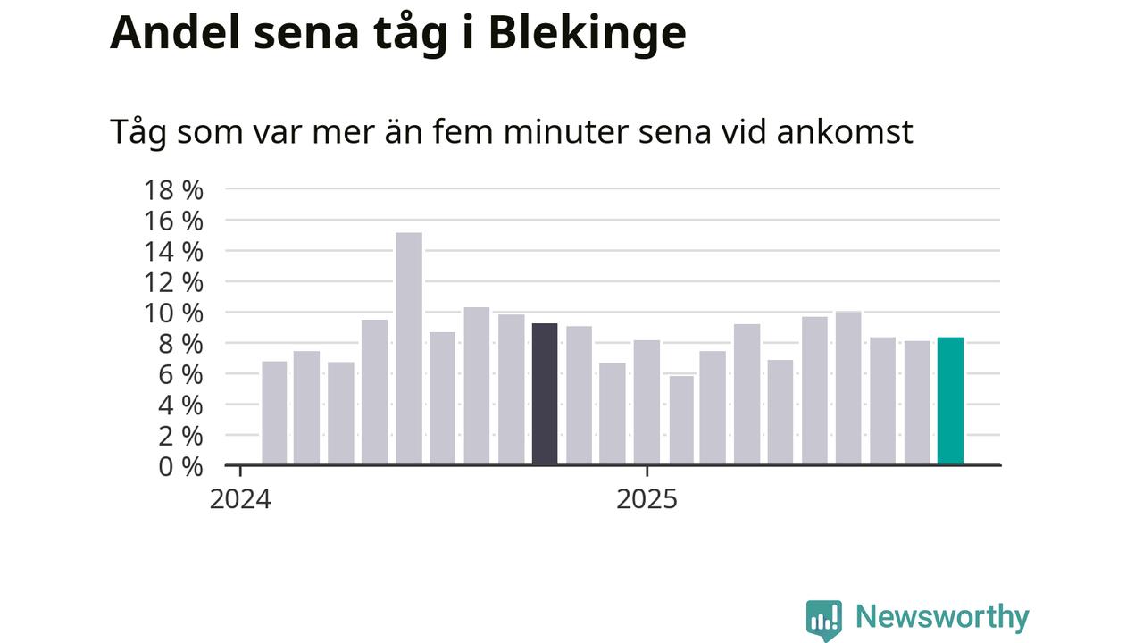 Av omkring 2 300 tåg som passerade någon av stationerna i Blekinge län i oktober var 190 mer än fem minuter sena. Det motsvarar 8 procent, en bit över den nationella målsättningen som säger att inte mer än fem procent av tågen ska vara sena.