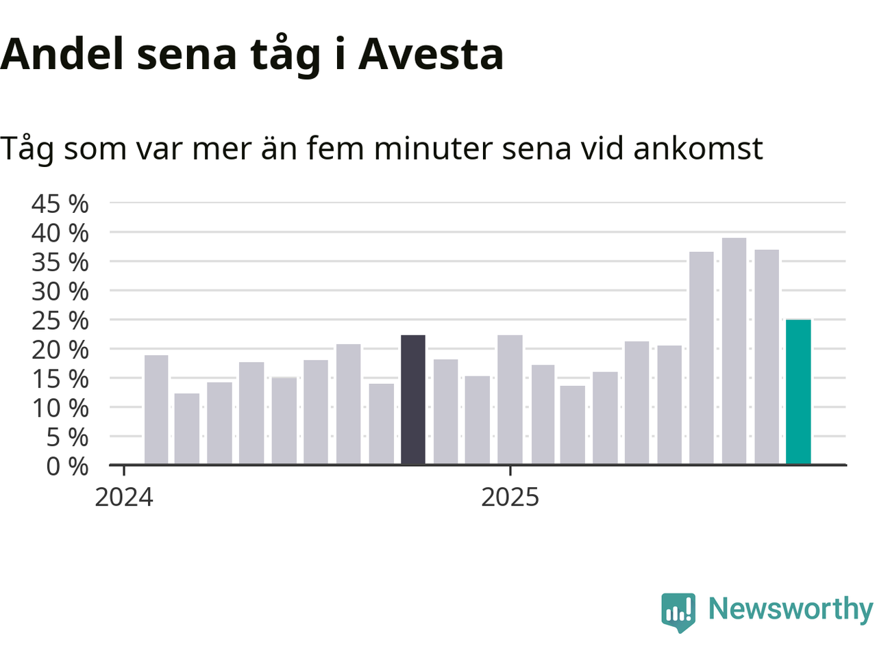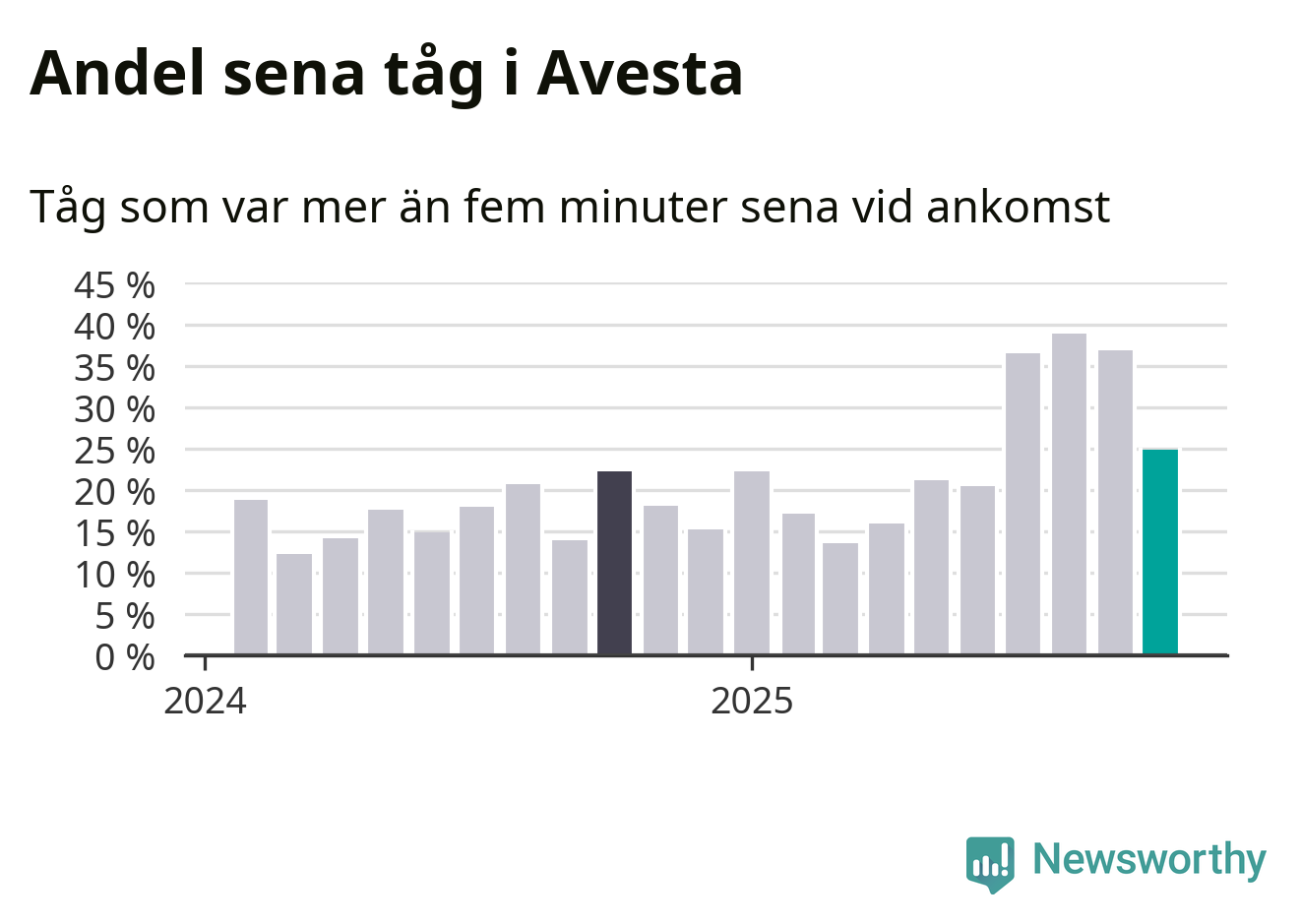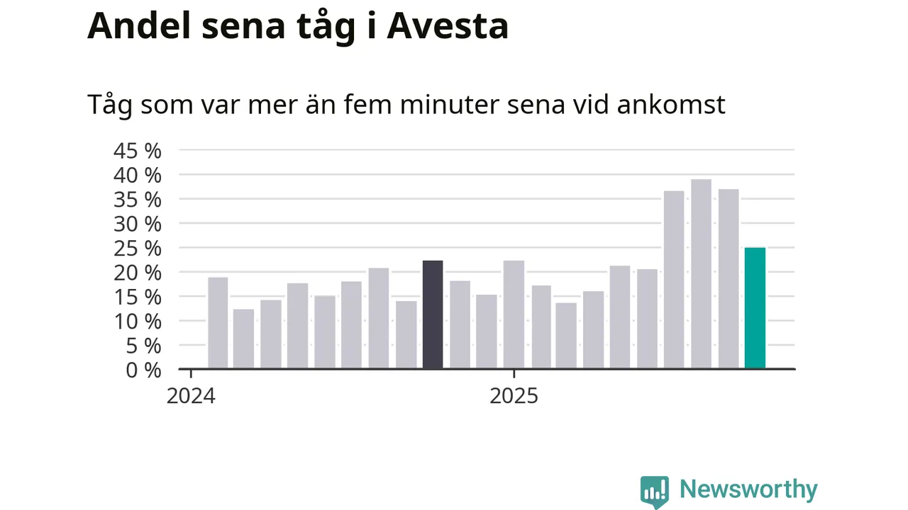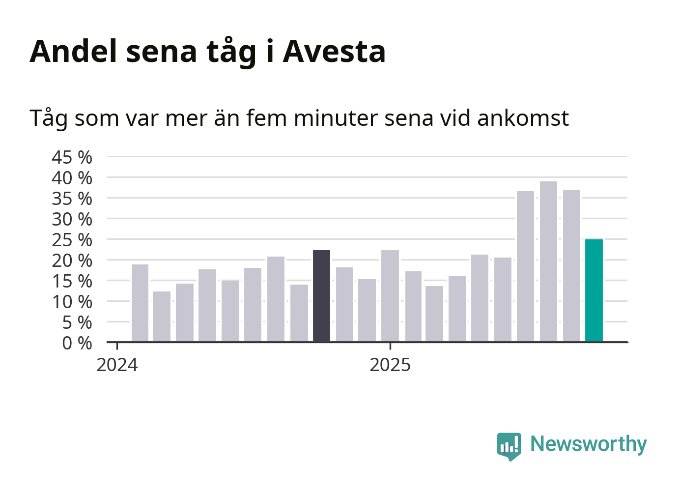 25 procent kan jämföras med 37 procent månaden innan, och 22 procent i oktober 2024. Siffrorna bygger på realtidsinformation om tågavgångar och ankomster från Trafikverket, som Newsworthy löpande samlar in.