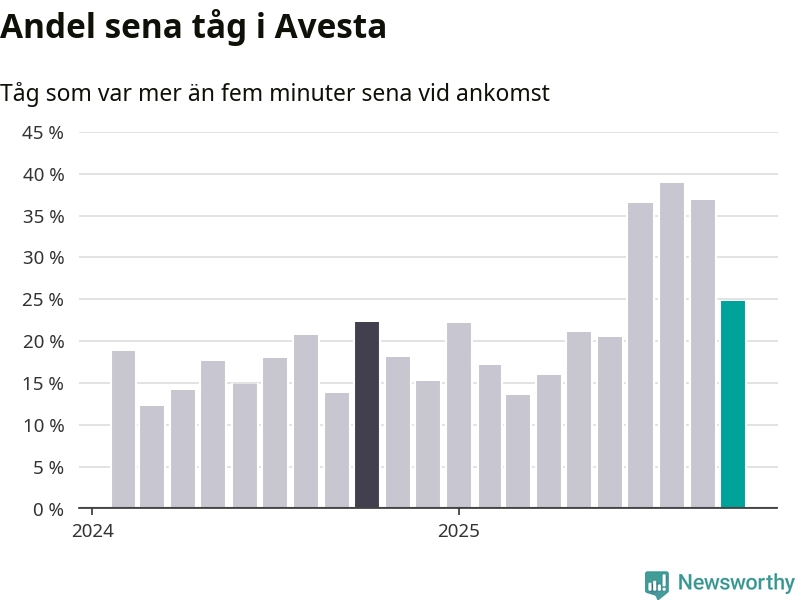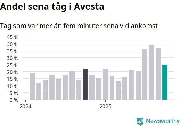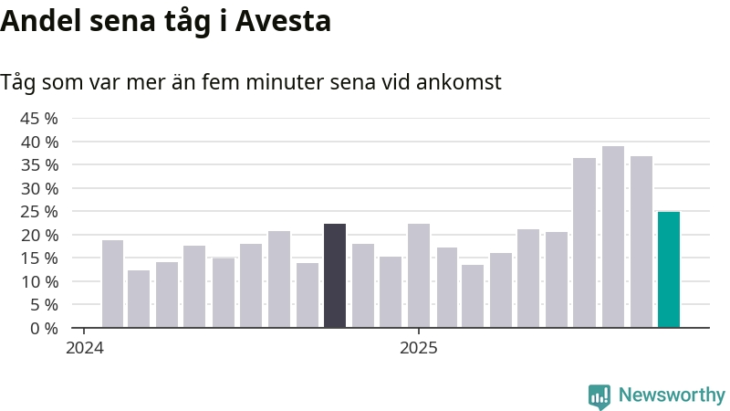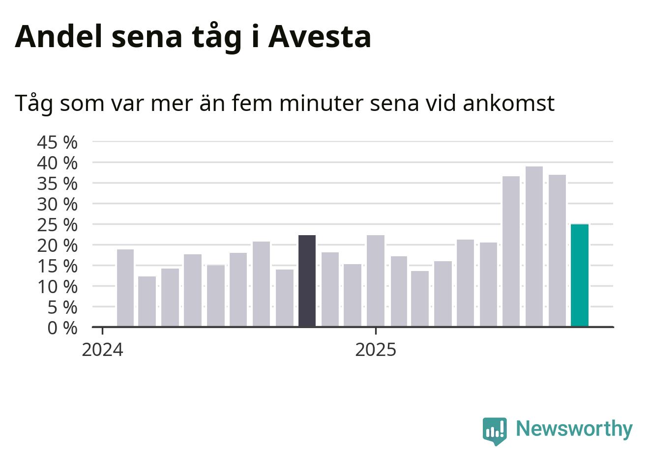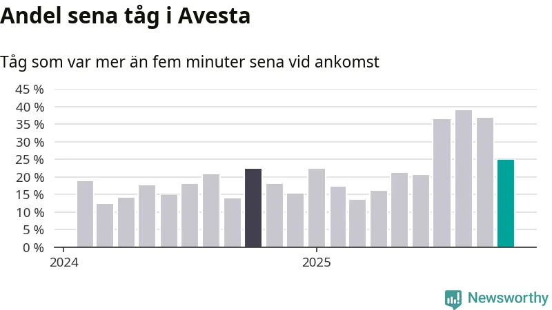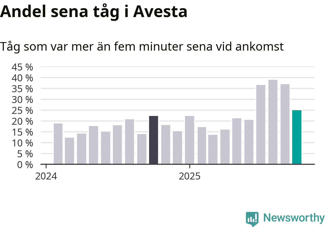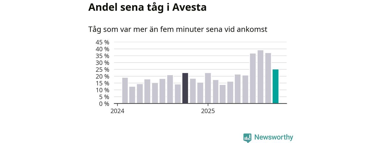 25 procent kan jämföras med 37 procent månaden innan, och 22 procent i oktober 2024. Siffrorna bygger på realtidsinformation om tågavgångar och ankomster från Trafikverket, som Newsworthy löpande samlar in.