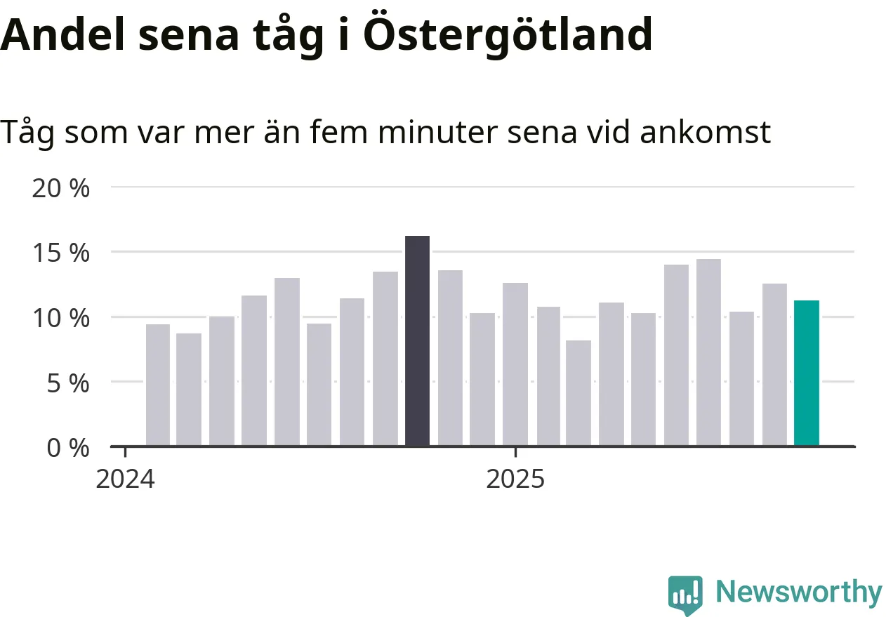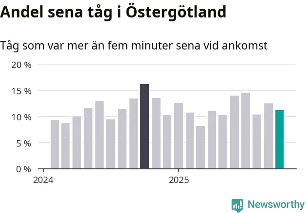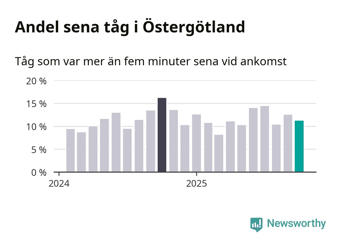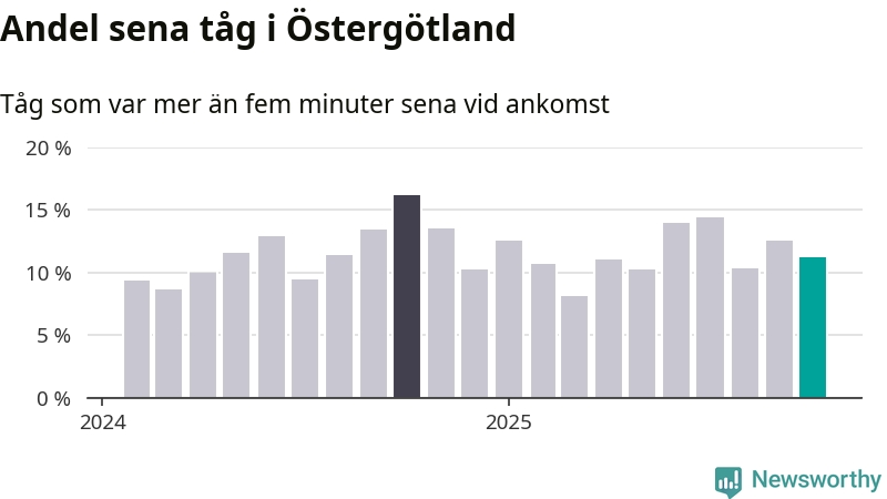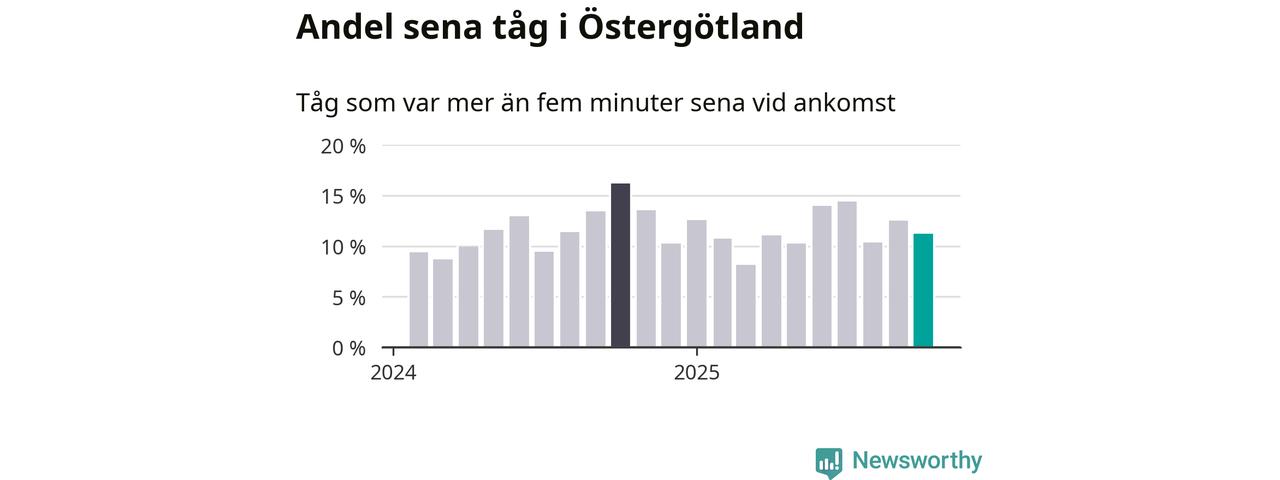 Elva procent kan jämföras med 13 procent månaden innan, och 16 procent i oktober 2024. Siffrorna bygger på realtidsinformation om tågavgångar och ankomster från Trafikverket, som Newsworthy löpande samlar in.
