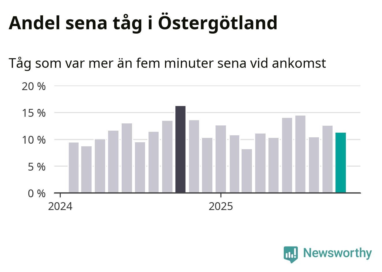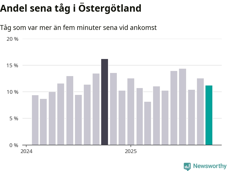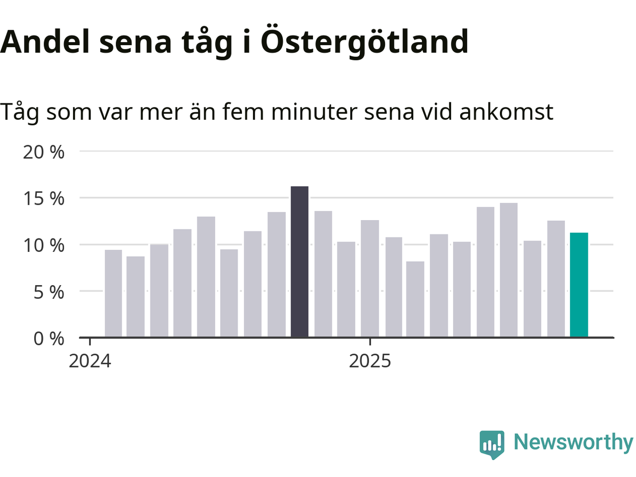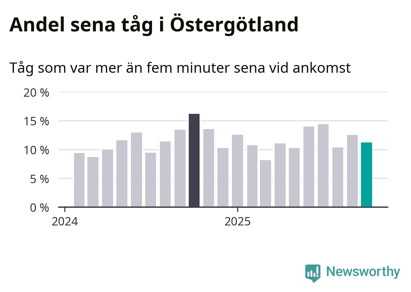 Elva procent kan jämföras med 13 procent månaden innan, och 16 procent i oktober 2024. Siffrorna bygger på realtidsinformation om tågavgångar och ankomster från Trafikverket, som Newsworthy löpande samlar in.