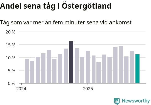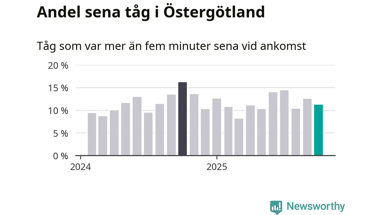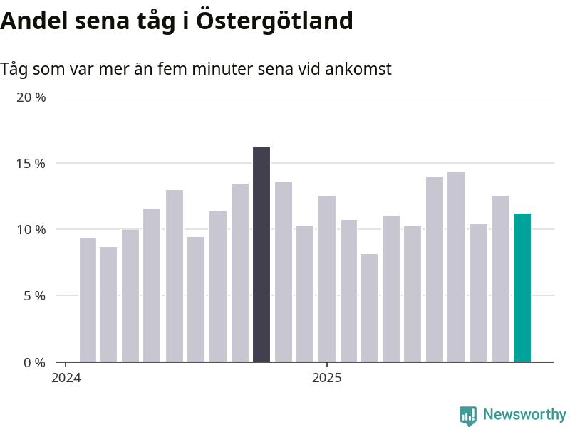Av omkring 7 800 tåg som passerade någon av stationerna i Östergötlands län i oktober var 869 mer än fem minuter sena. Det motsvarar 11 procent, en bit över den nationella målsättningen som säger att inte mer än fem procent av tågen ska vara sena.
