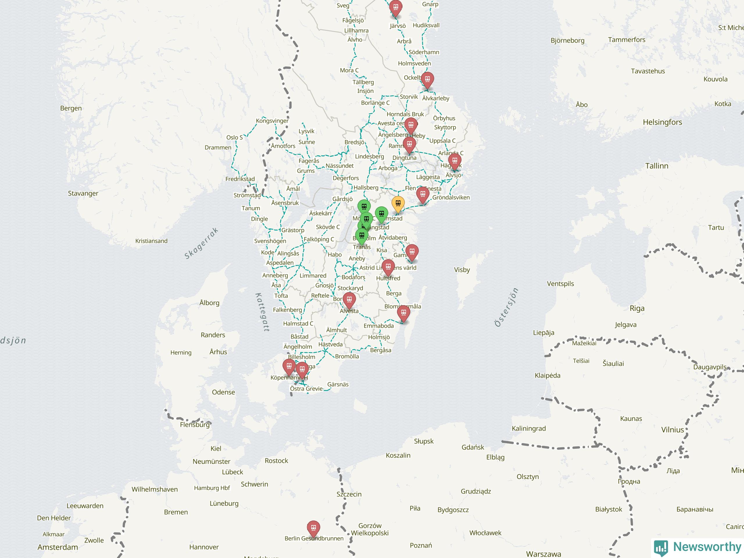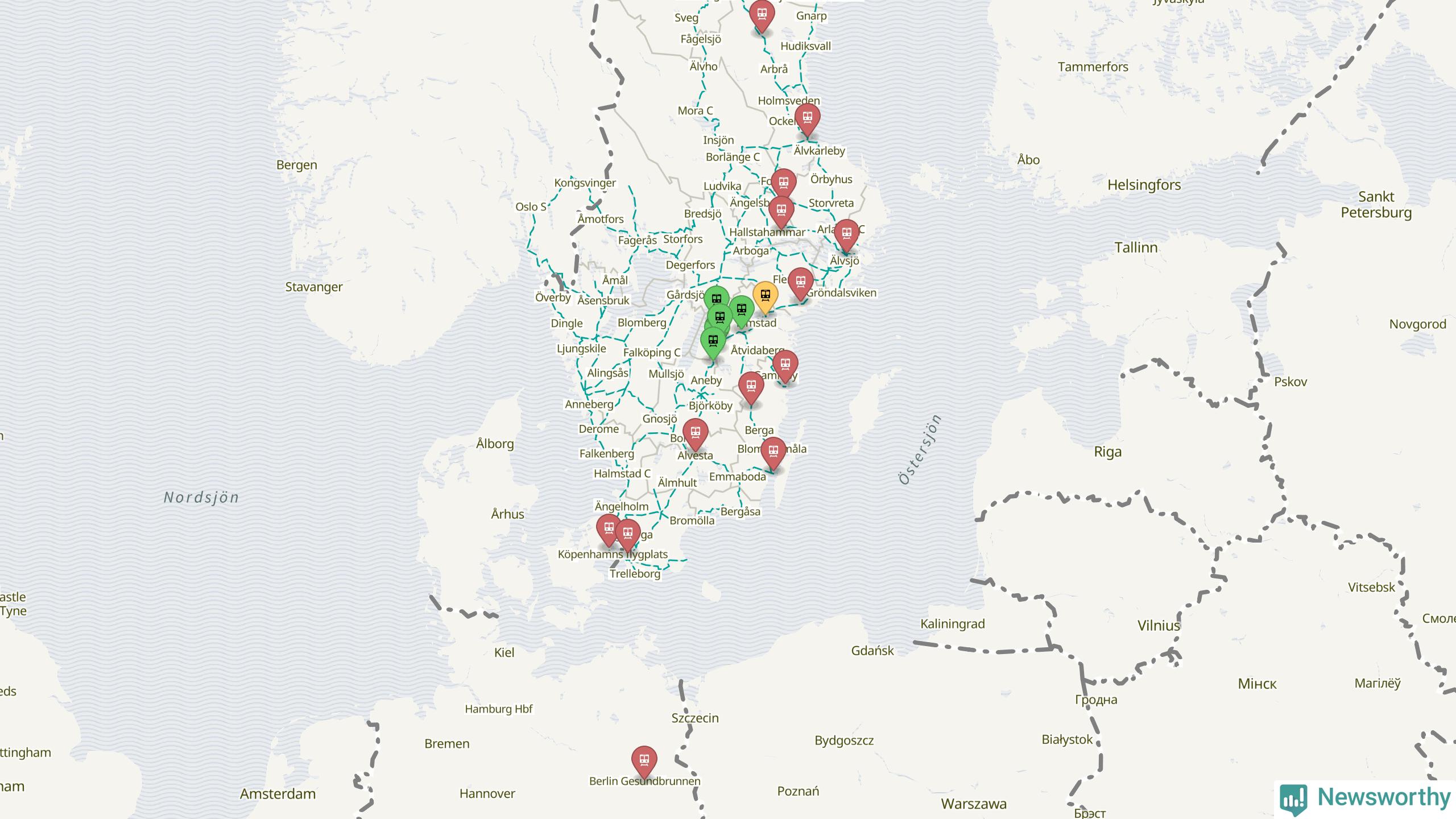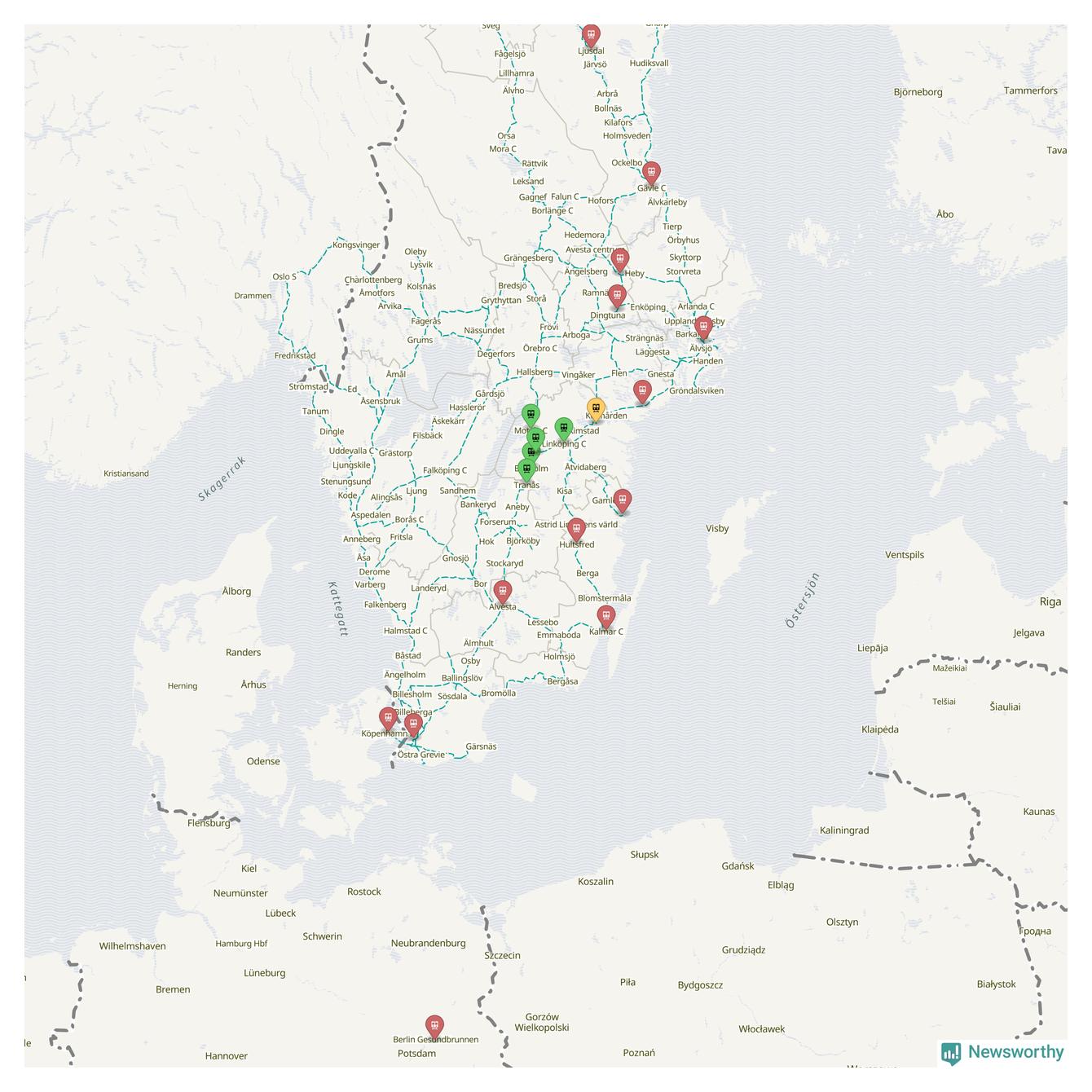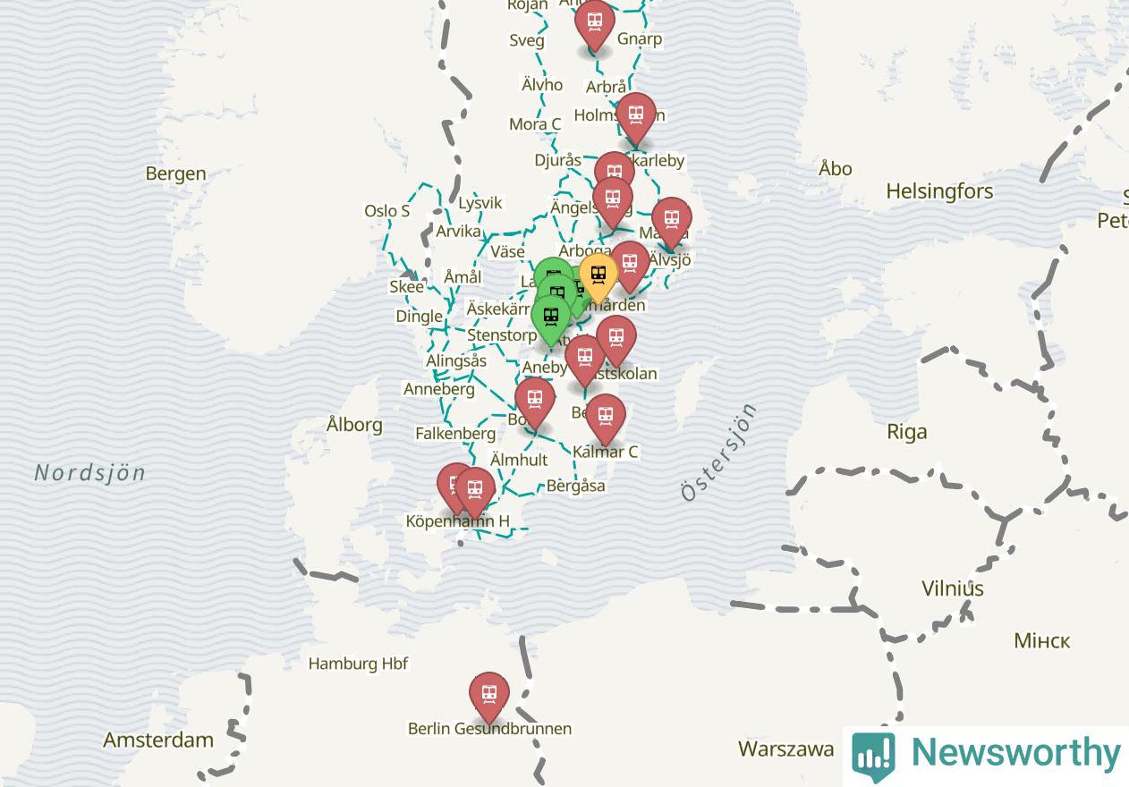 Kartdata från Mapbox, Newsworthy, OpenStreetMap och Trafikverket. Uppgifter om sträckor med passagerartrafik från jarnvag.net.