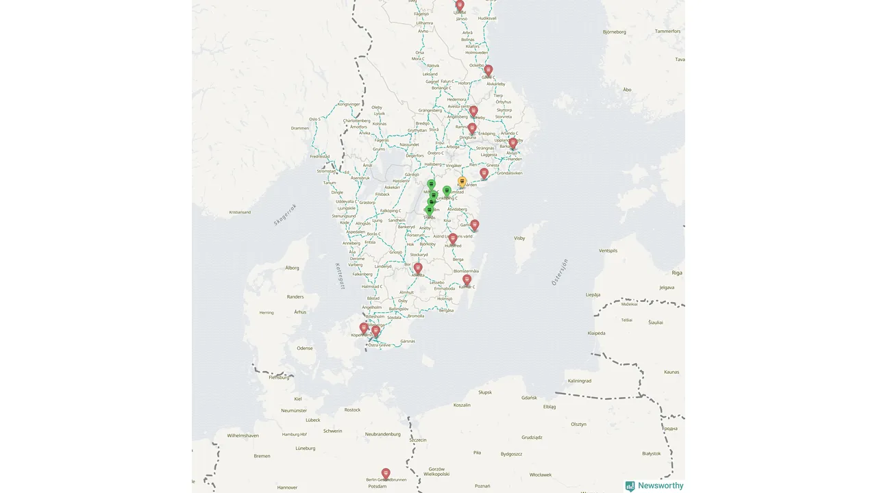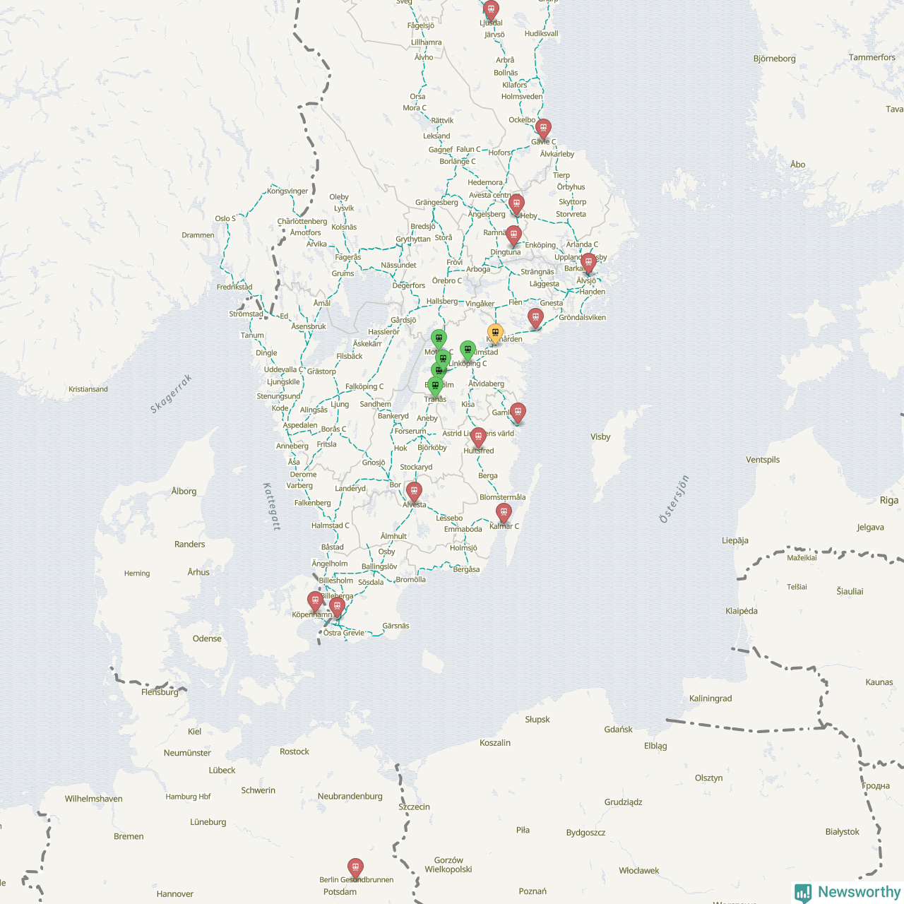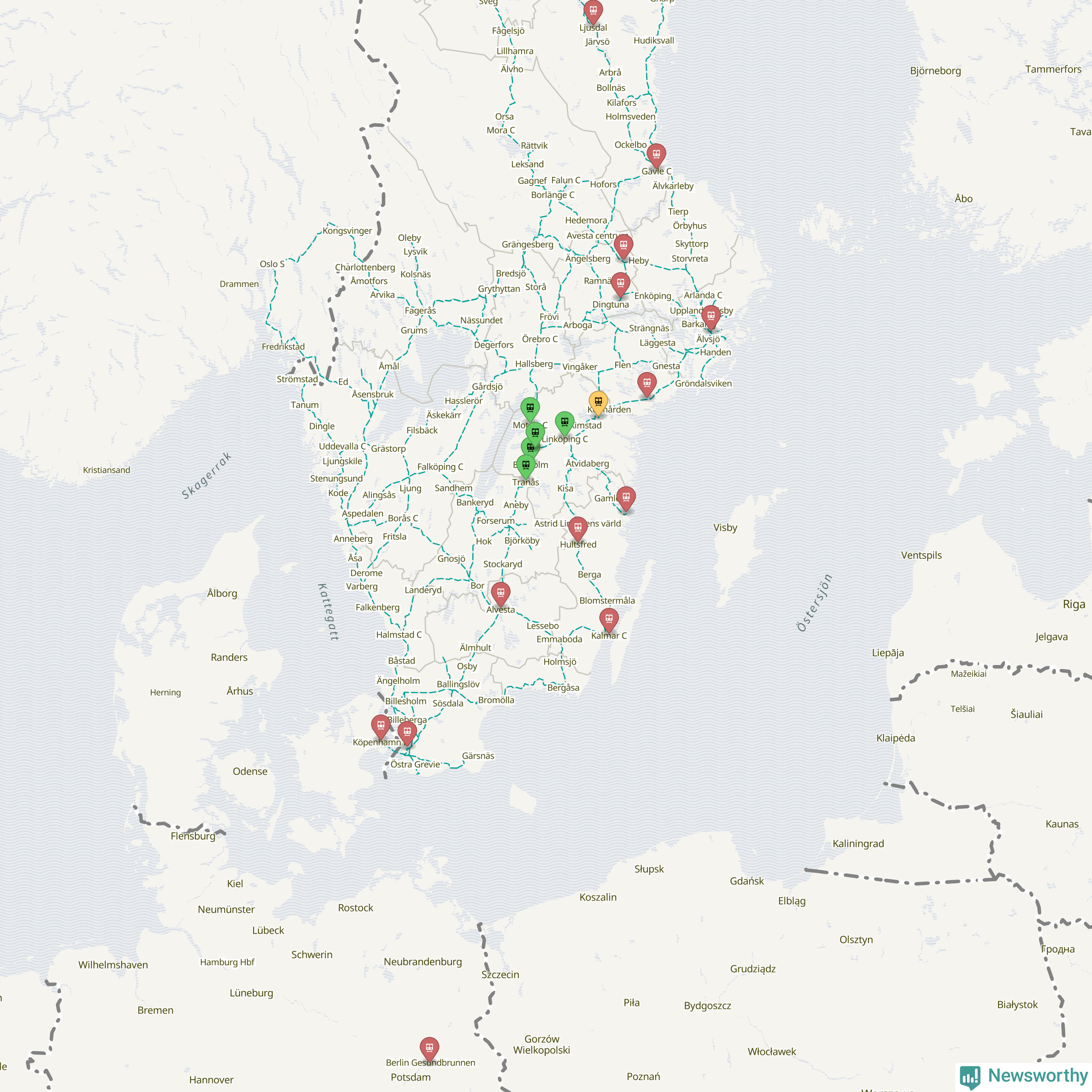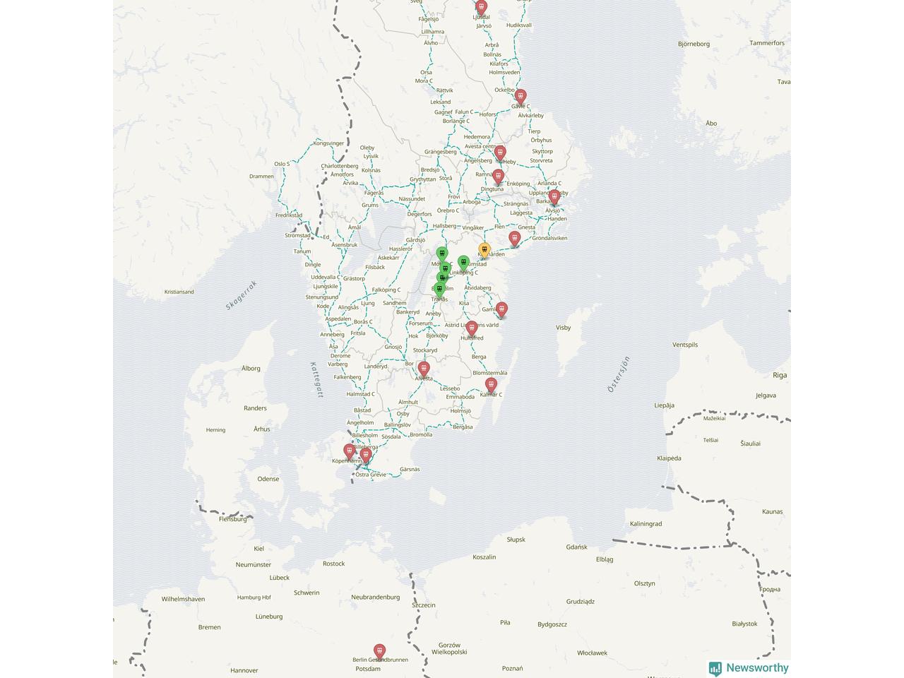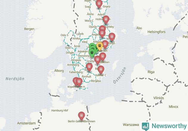 Kartdata från Mapbox, Newsworthy, OpenStreetMap och Trafikverket. Uppgifter om sträckor med passagerartrafik från jarnvag.net.
