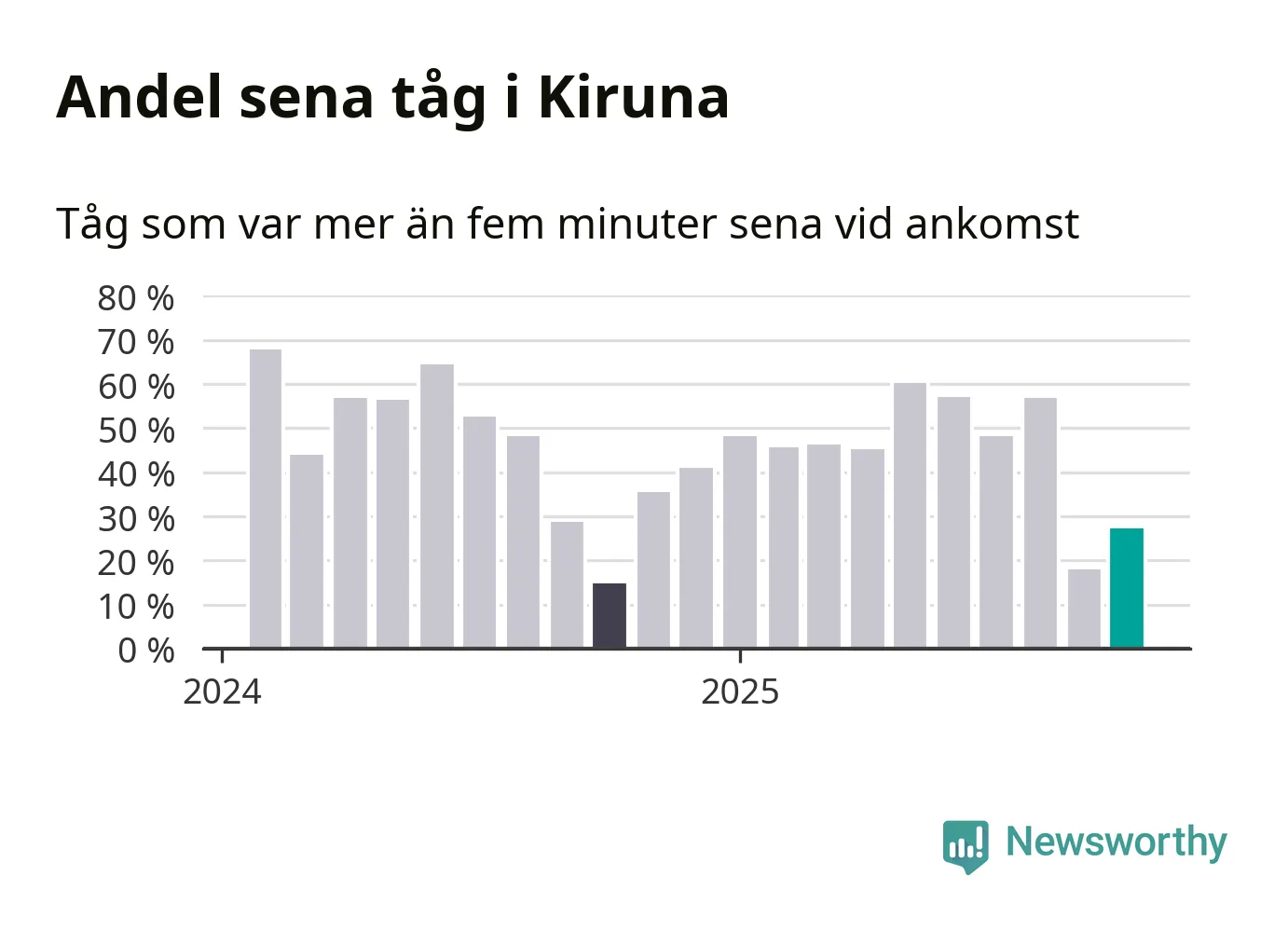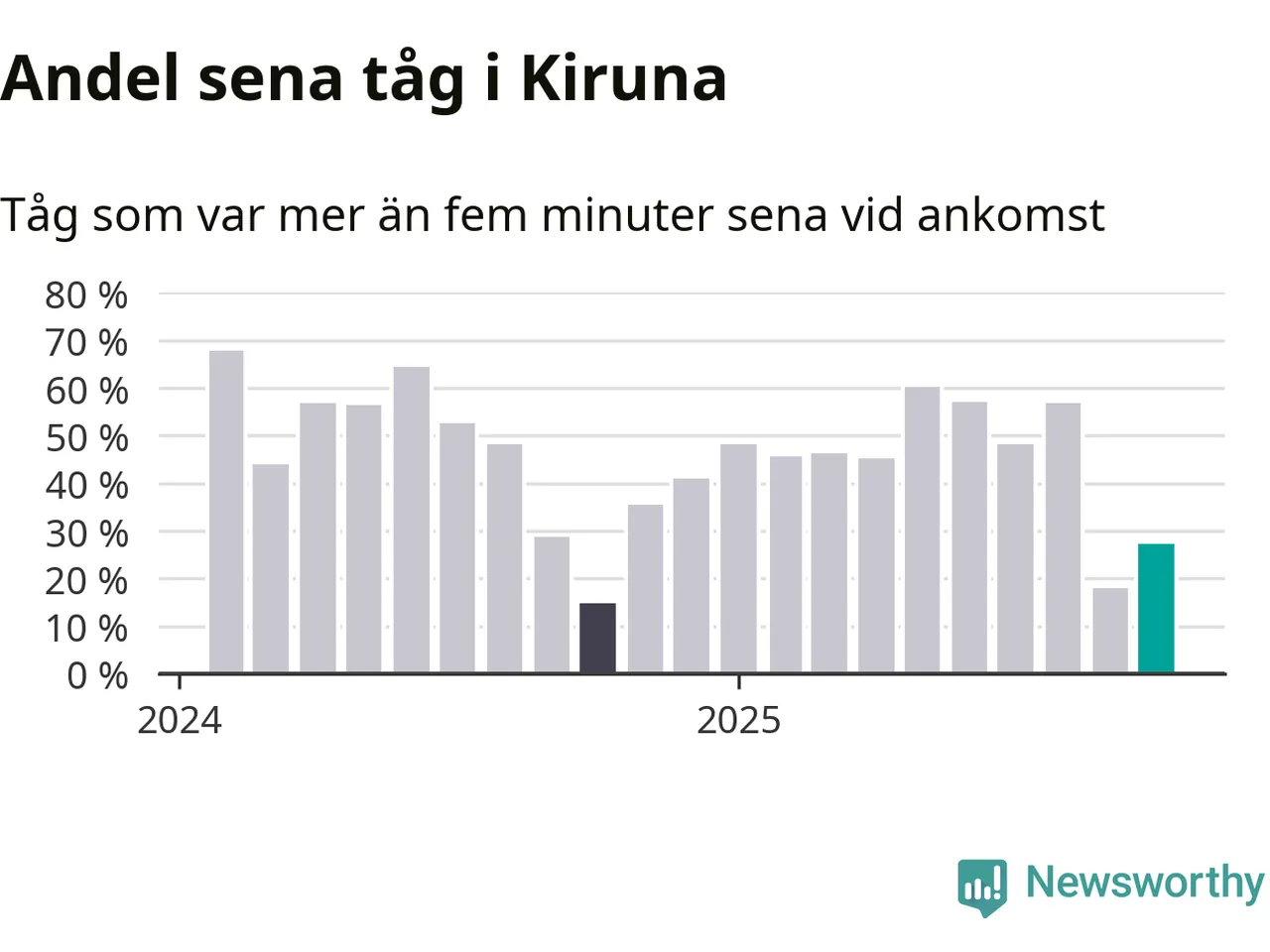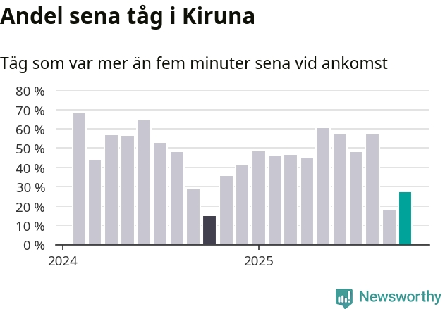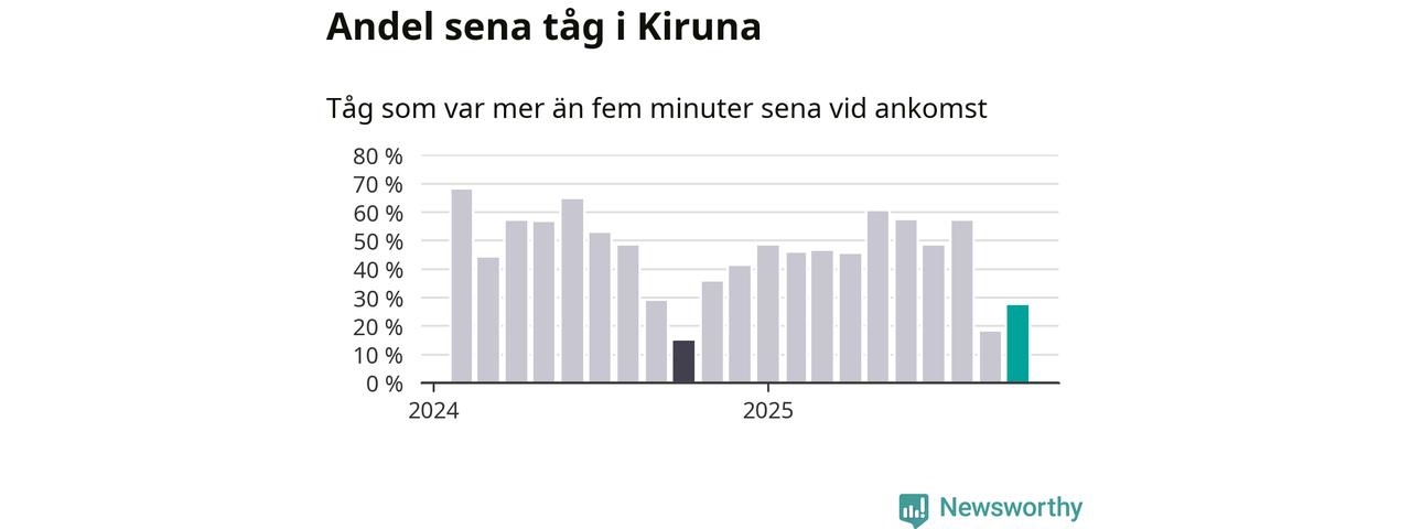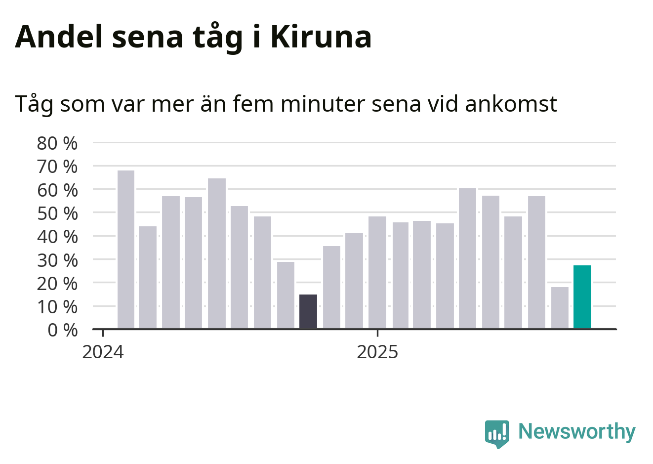27 procent kan jämföras med 18 procent månaden innan, och 15 procent i oktober 2024. Siffrorna bygger på realtidsinformation om tågavgångar och ankomster från Trafikverket, som Newsworthy löpande samlar in.