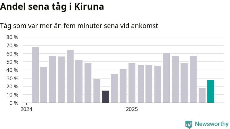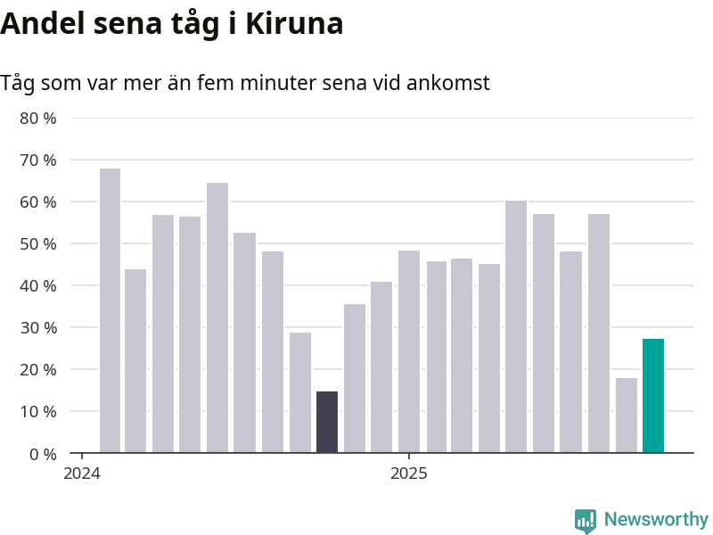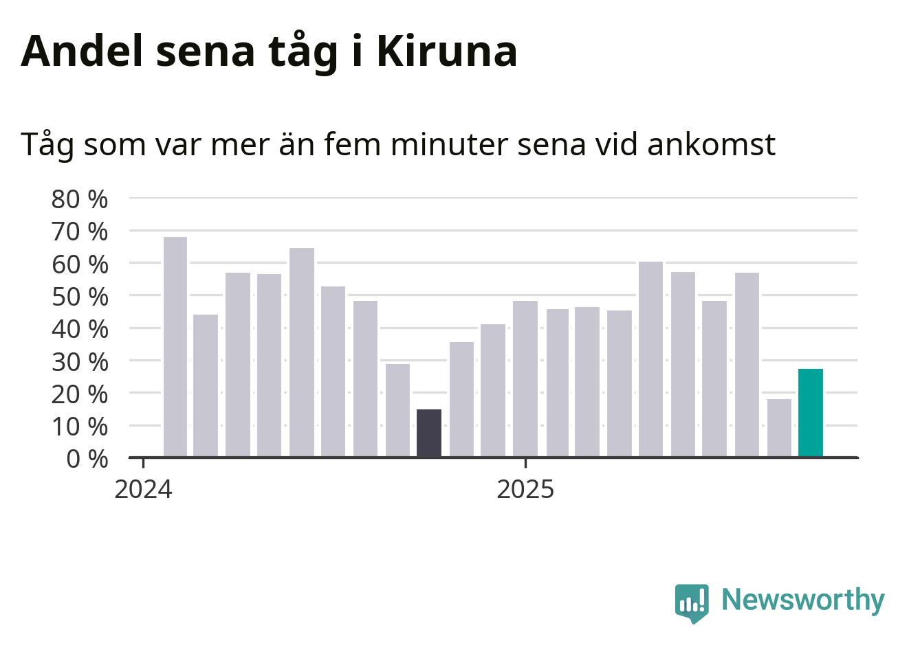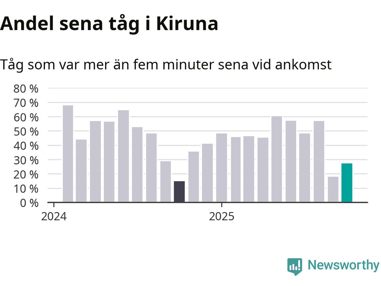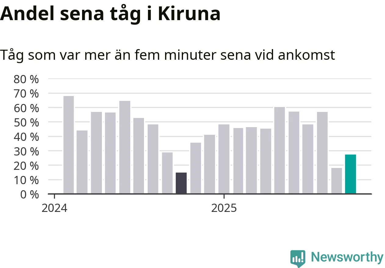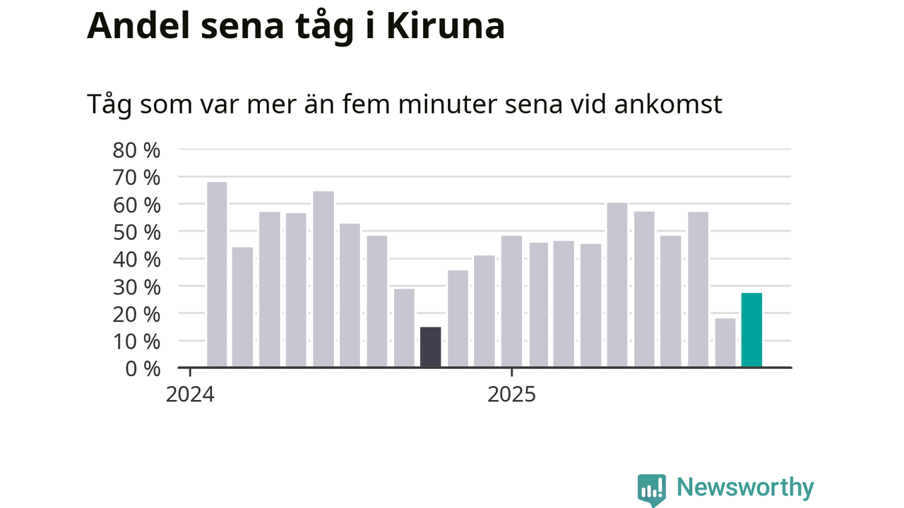 27 procent kan jämföras med 18 procent månaden innan, och 15 procent i oktober 2024. Siffrorna bygger på realtidsinformation om tågavgångar och ankomster från Trafikverket, som Newsworthy löpande samlar in.