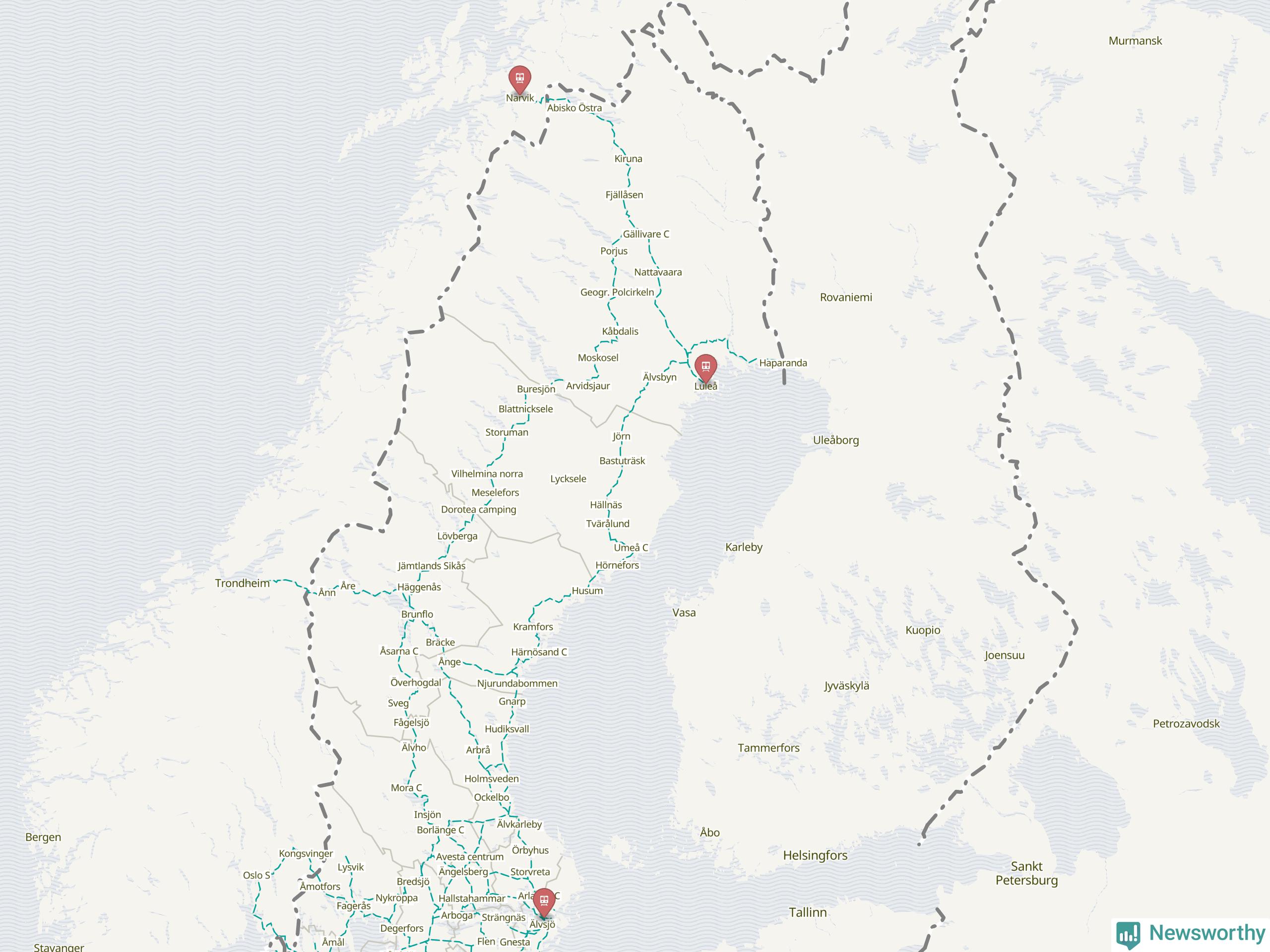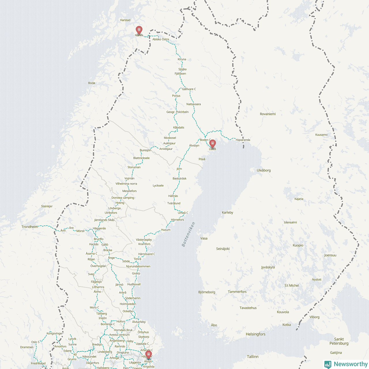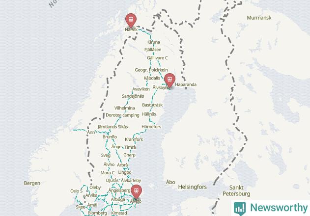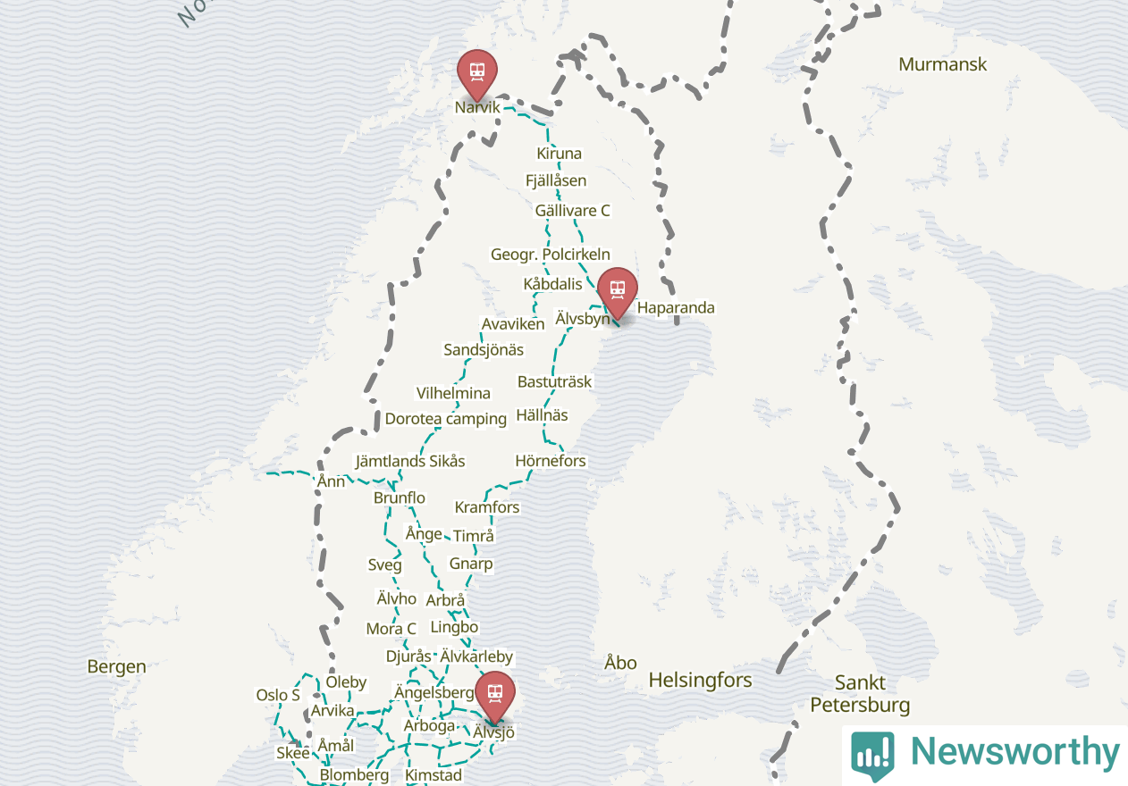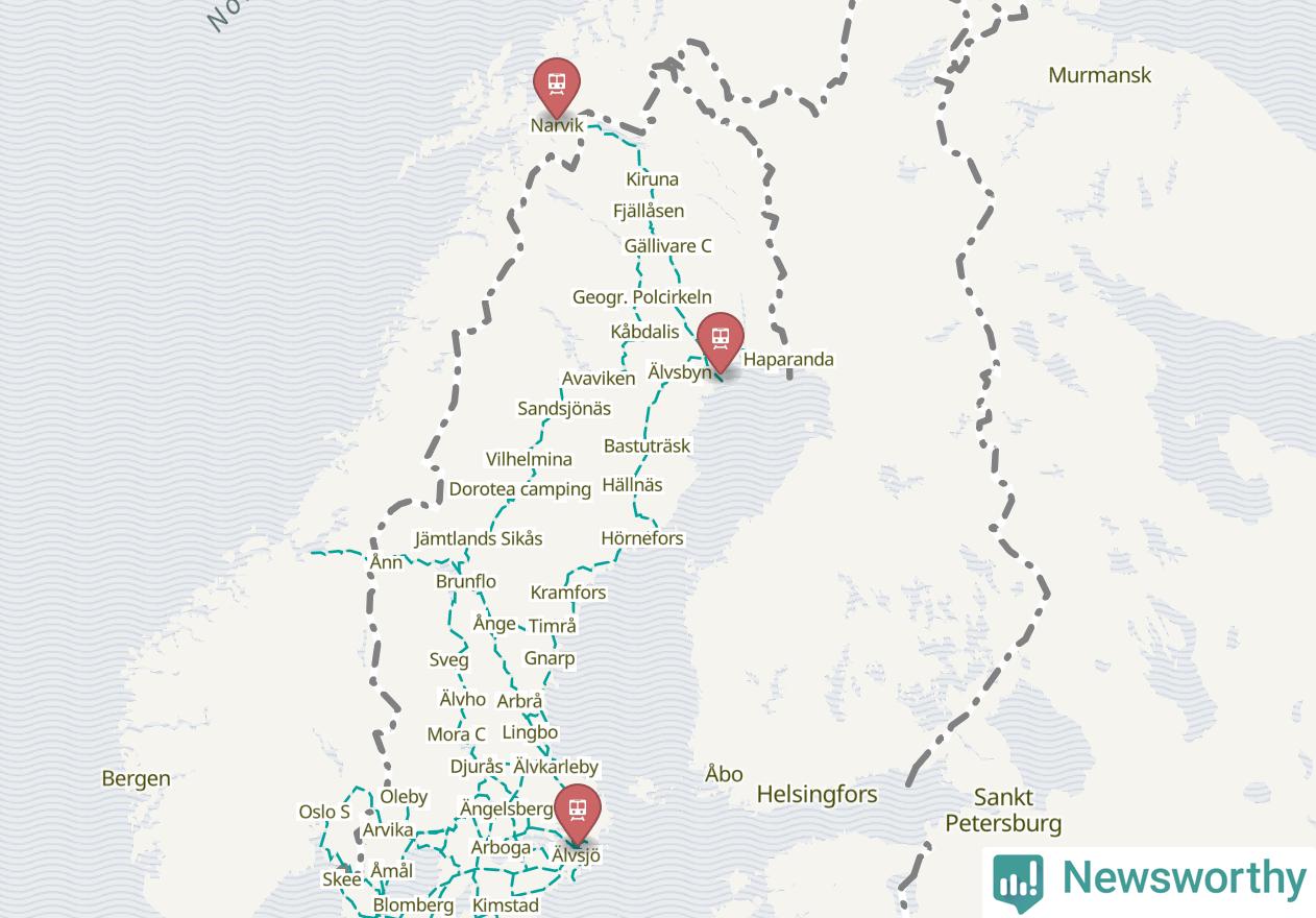 Kartdata från Mapbox, Newsworthy, OpenStreetMap och Trafikverket. Uppgifter om sträckor med passagerartrafik från jarnvag.net.