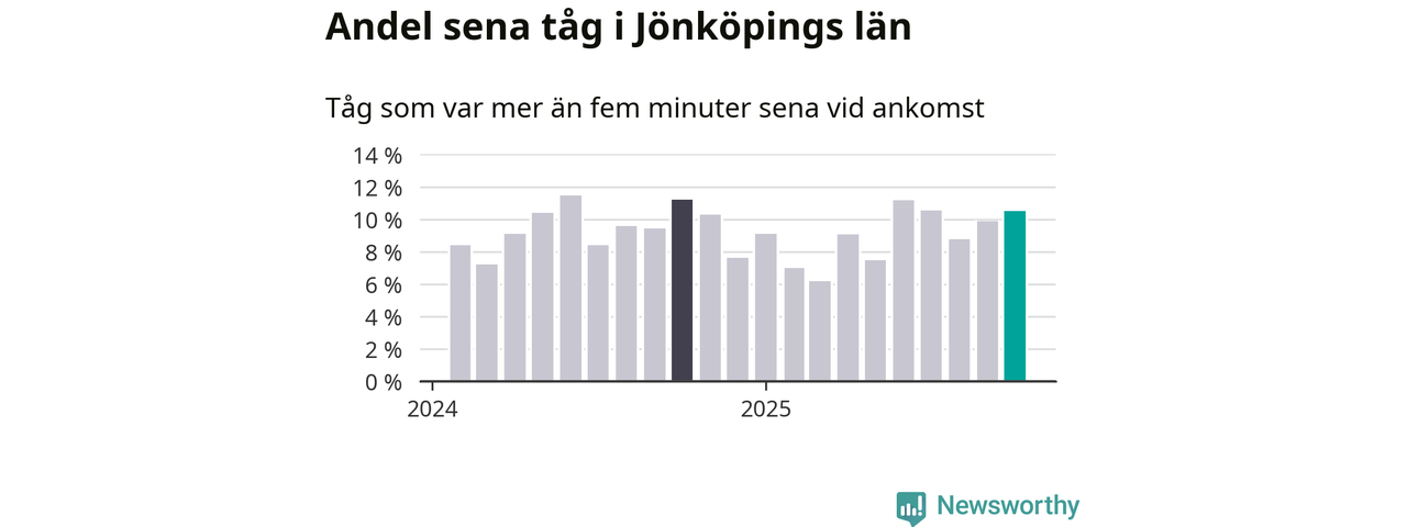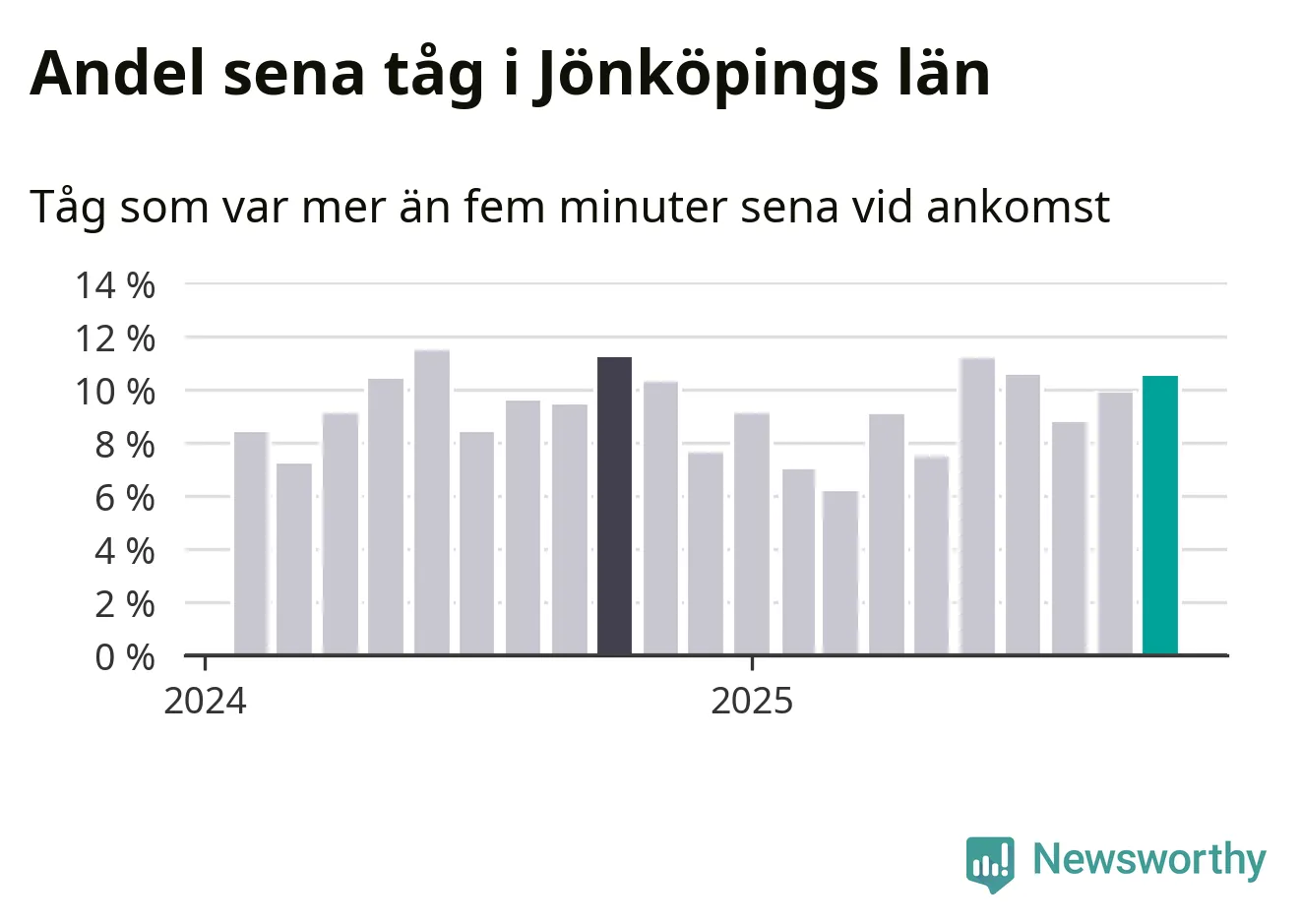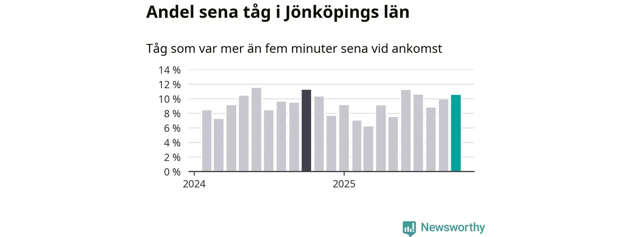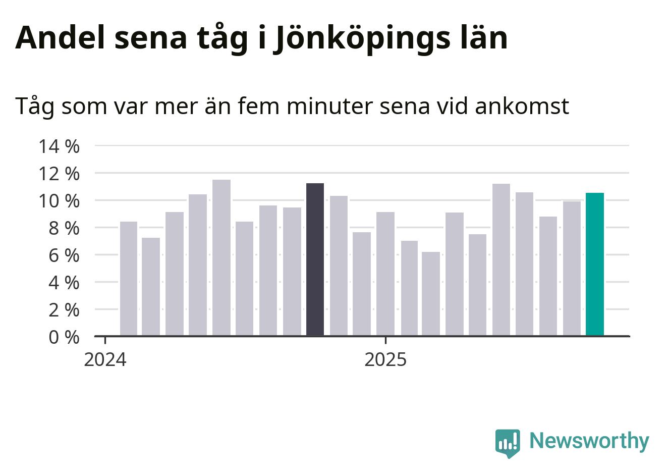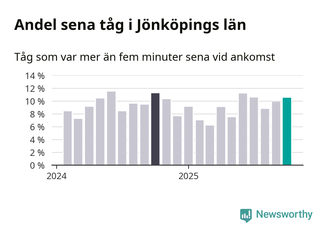 Tio procent är marginellt mer än månaden innan, och kan jämföras med elva procent i oktober 2024. Siffrorna bygger på realtidsinformation om tågavgångar och ankomster från Trafikverket, som Newsworthy löpande samlar in.