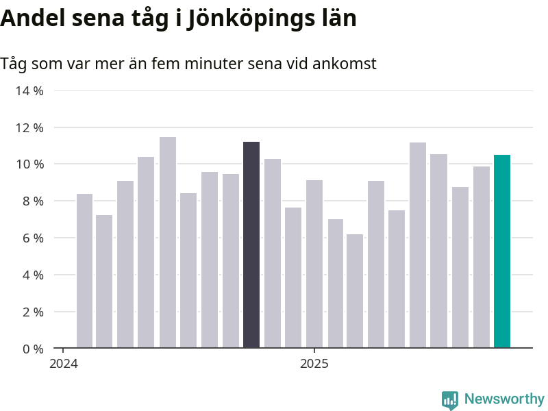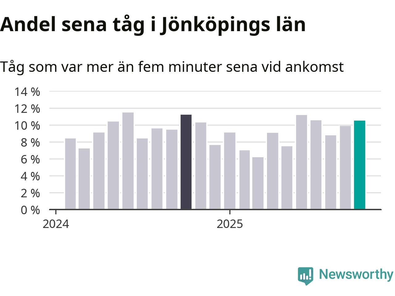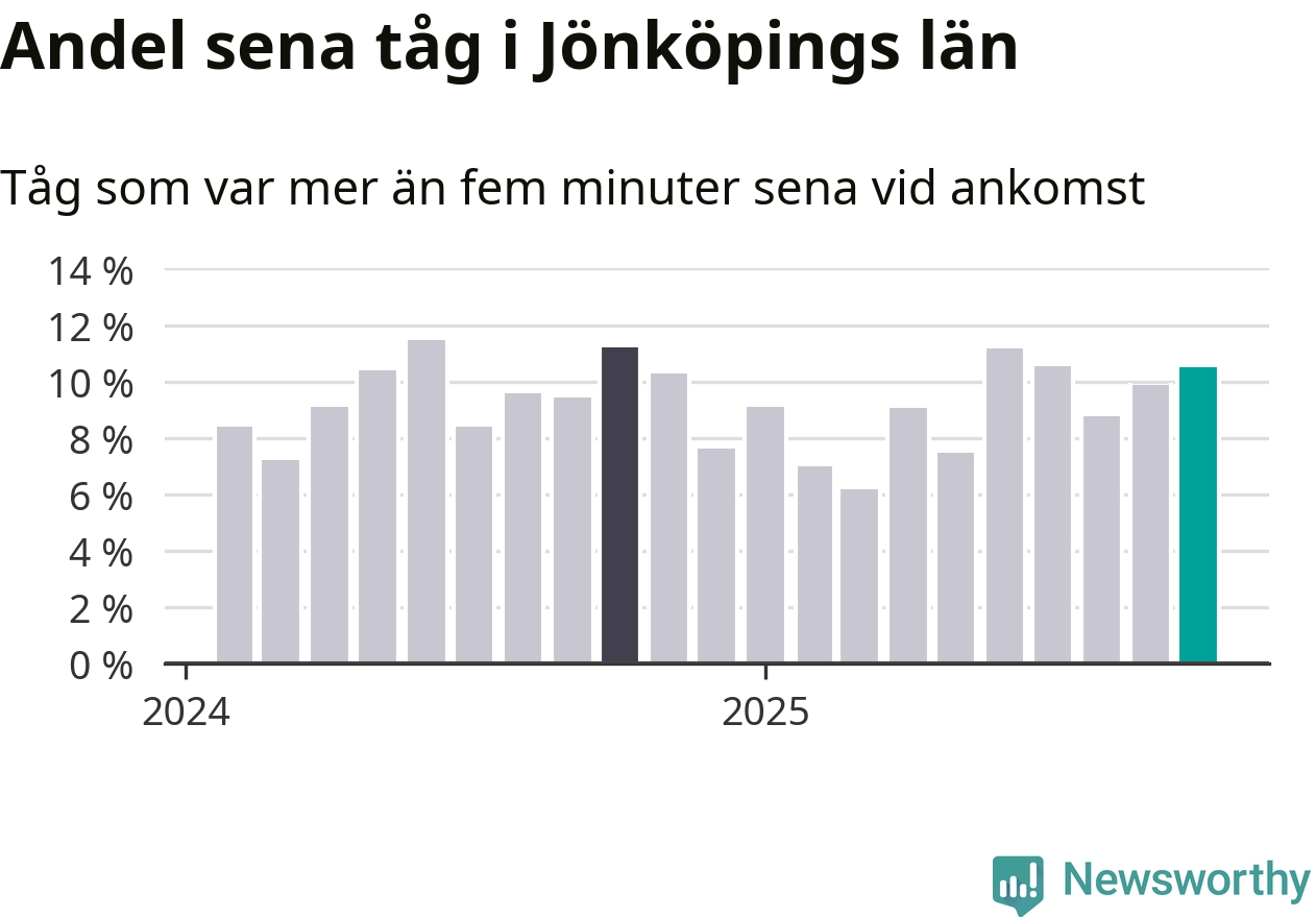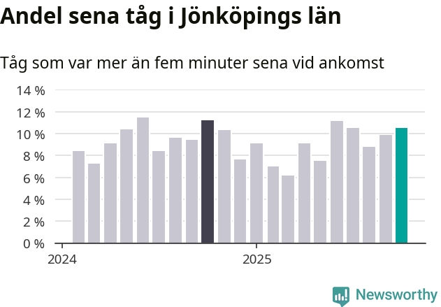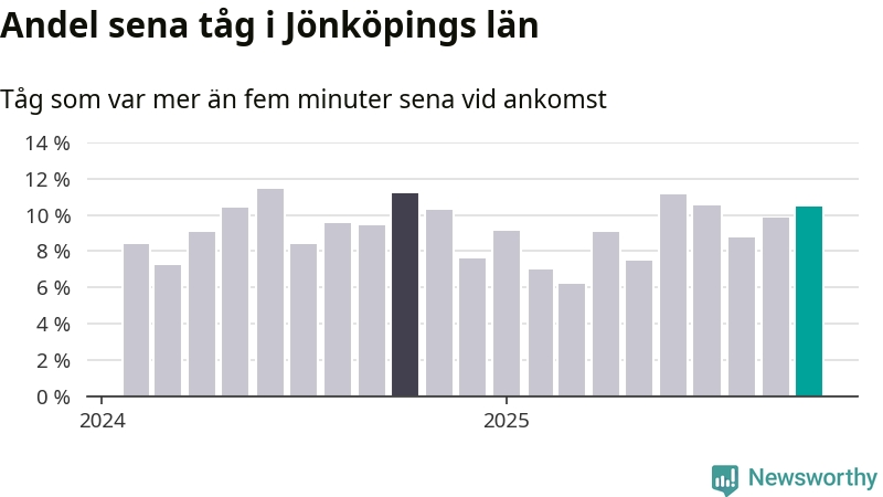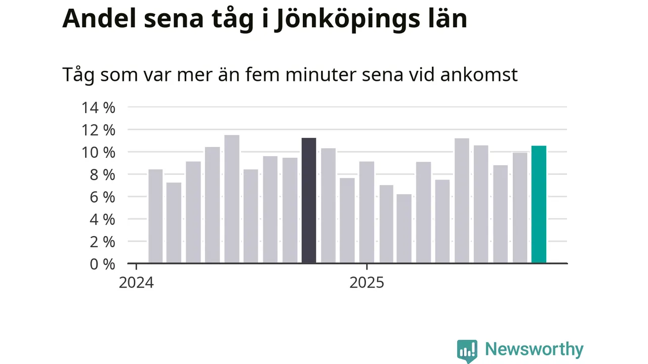 Tio procent är marginellt mer än månaden innan, och kan jämföras med elva procent i oktober 2024. Siffrorna bygger på realtidsinformation om tågavgångar och ankomster från Trafikverket, som Newsworthy löpande samlar in.