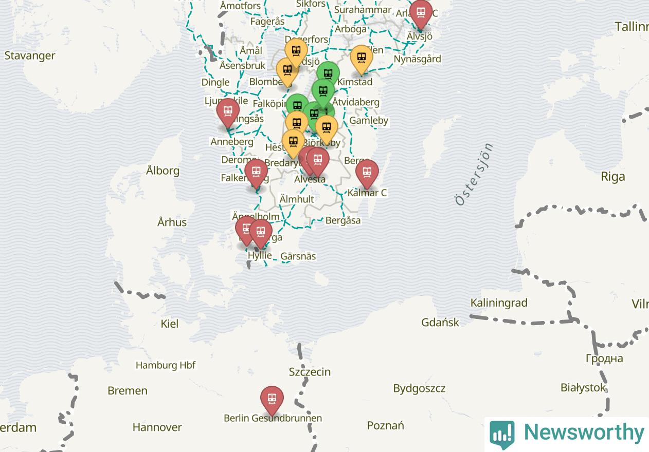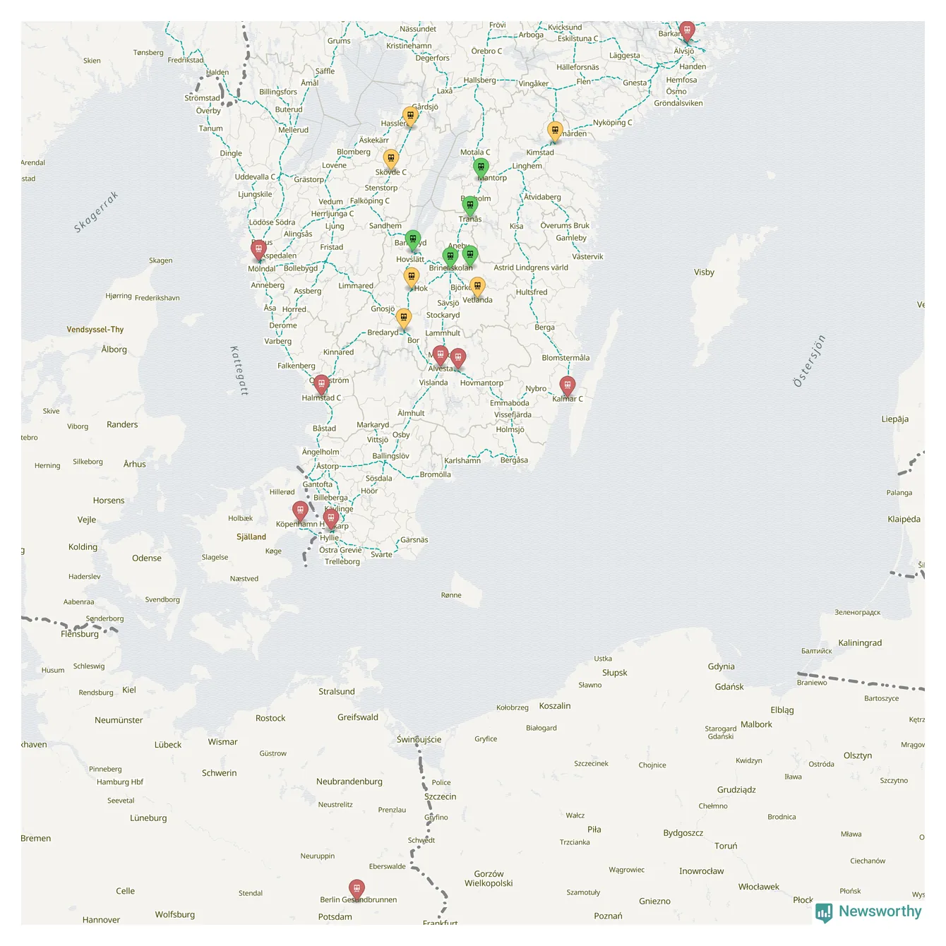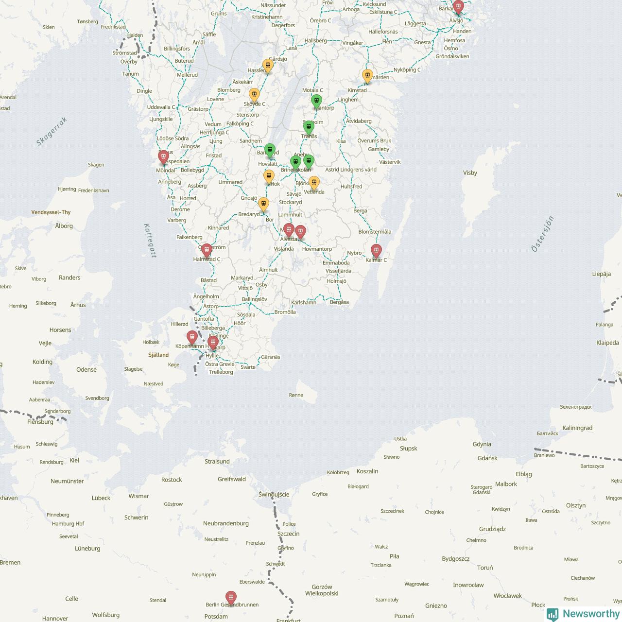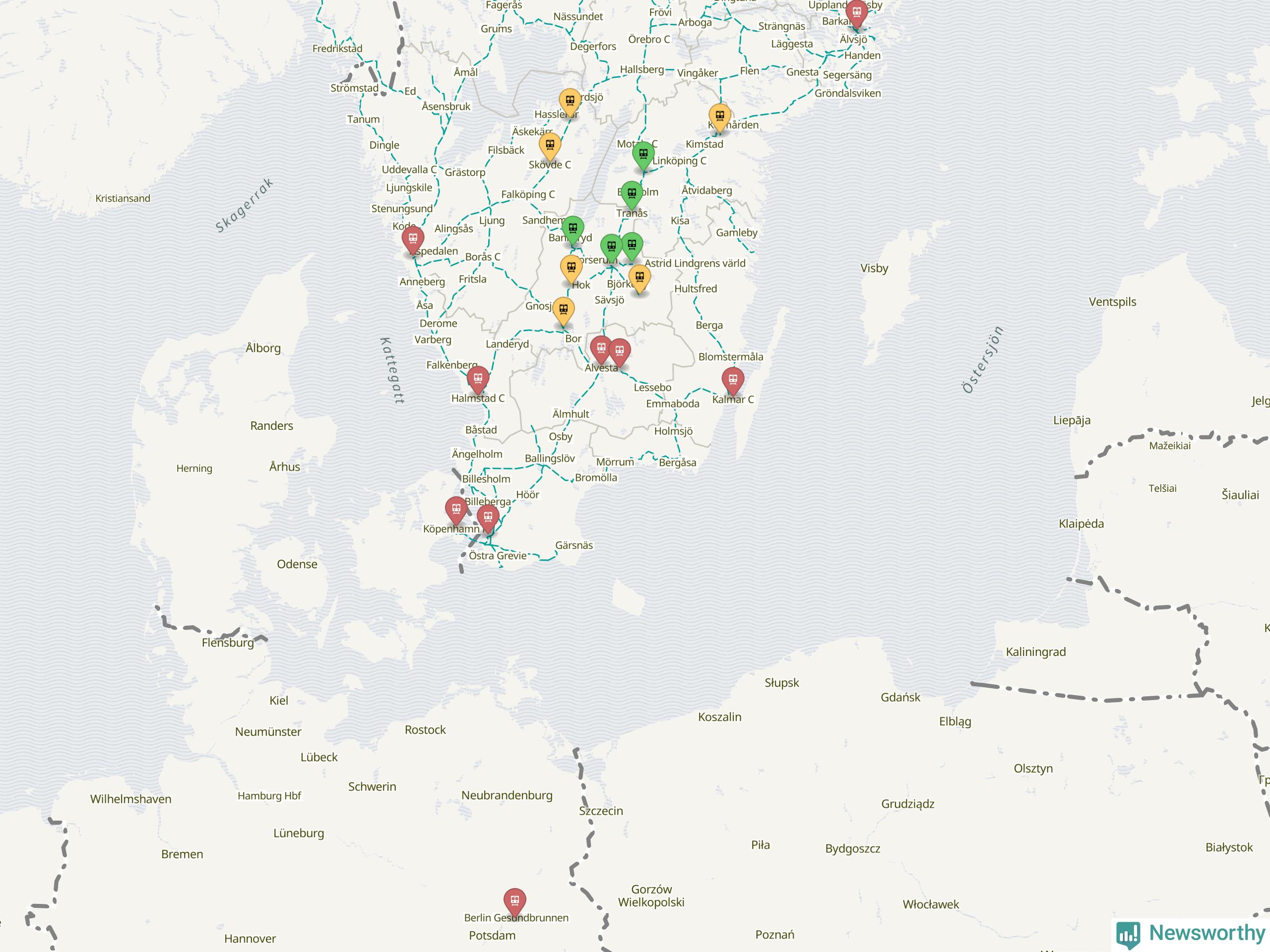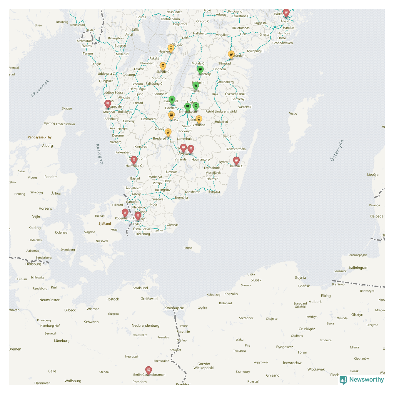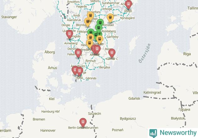 Kartdata från Mapbox, Newsworthy, OpenStreetMap och Trafikverket. Uppgifter om sträckor med passagerartrafik från jarnvag.net.