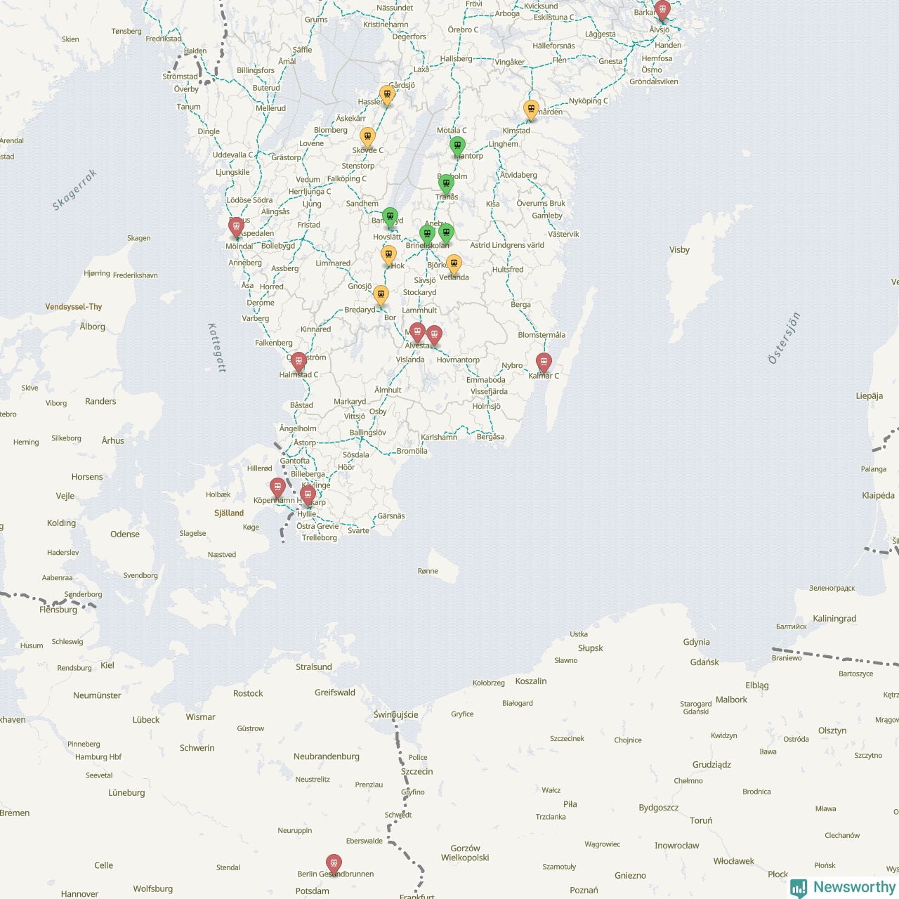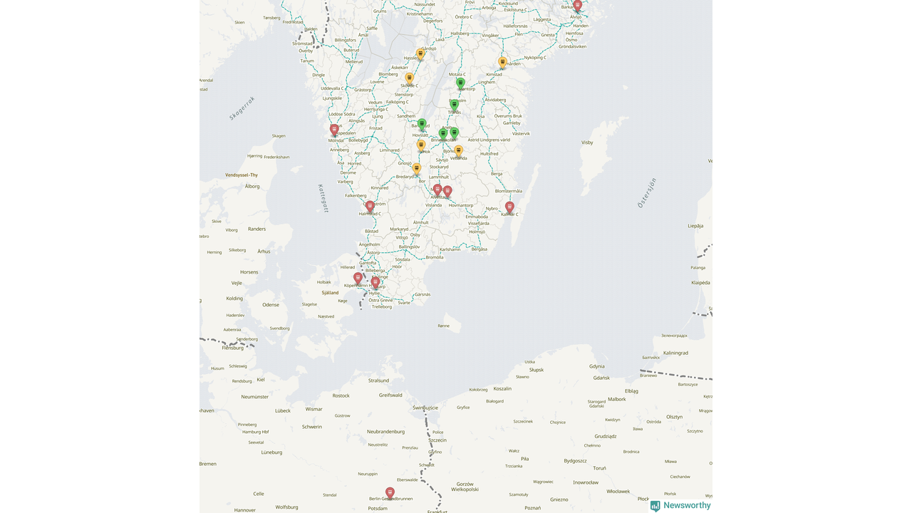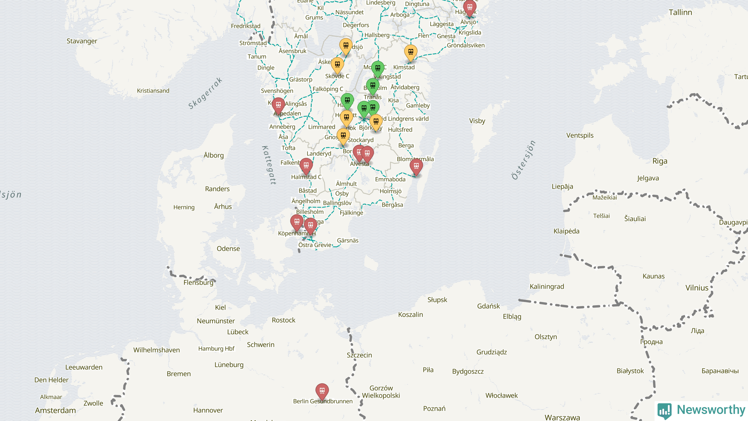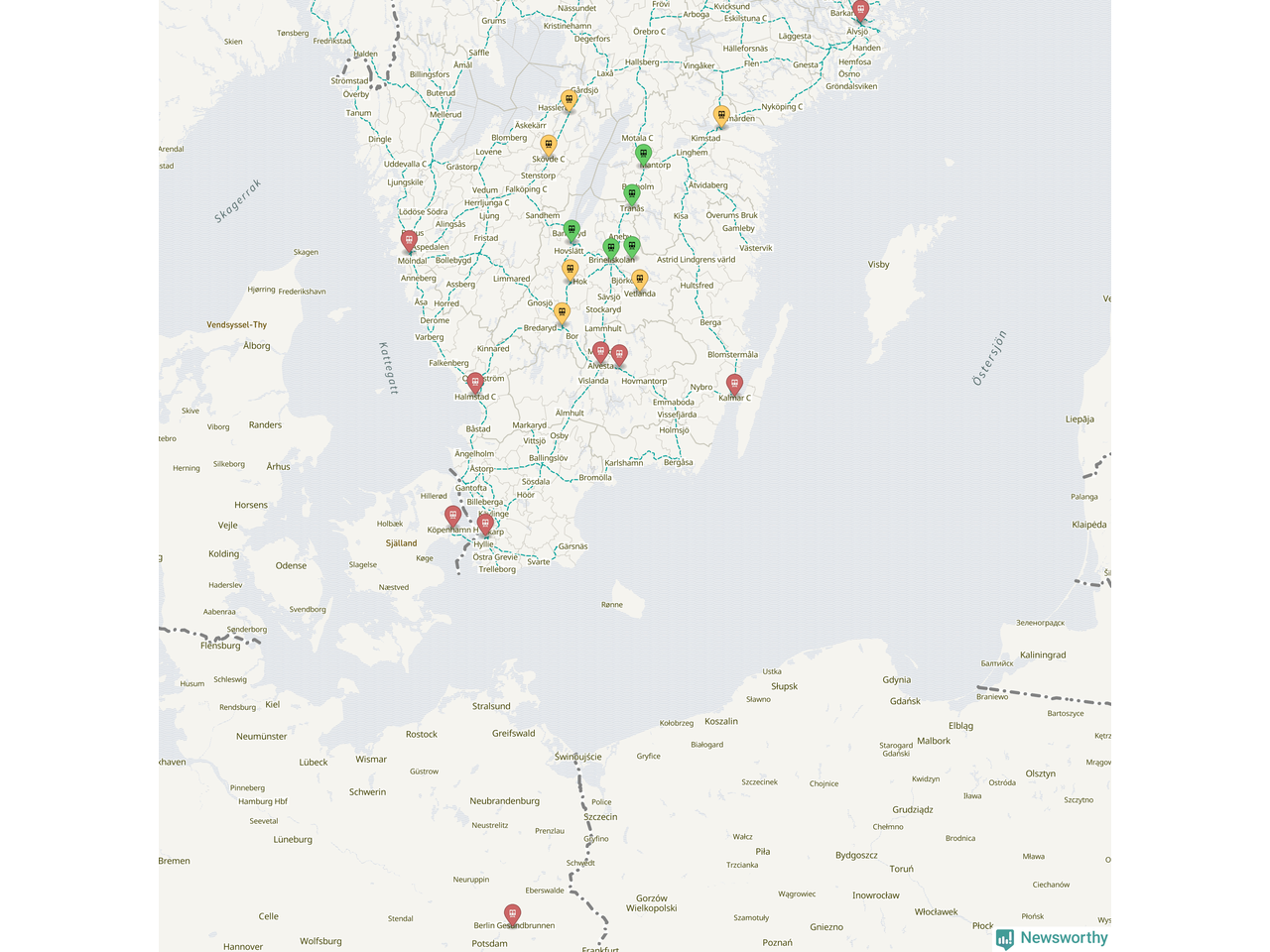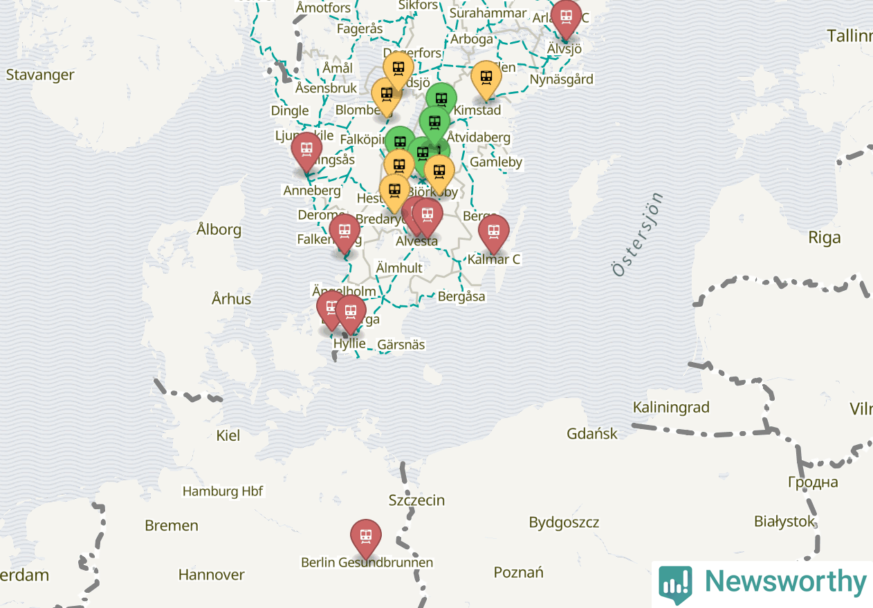 Kartdata från Mapbox, Newsworthy, OpenStreetMap och Trafikverket. Uppgifter om sträckor med passagerartrafik från jarnvag.net.