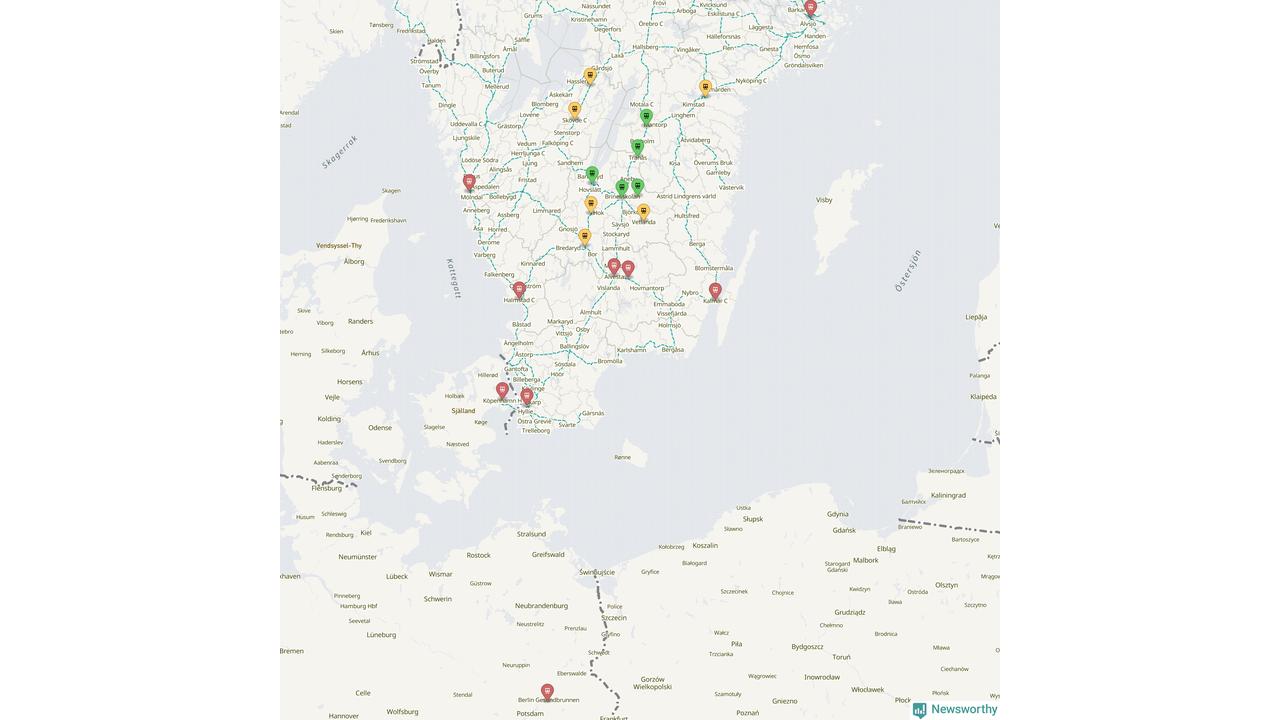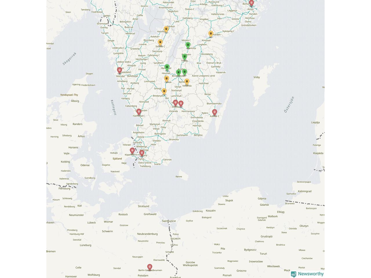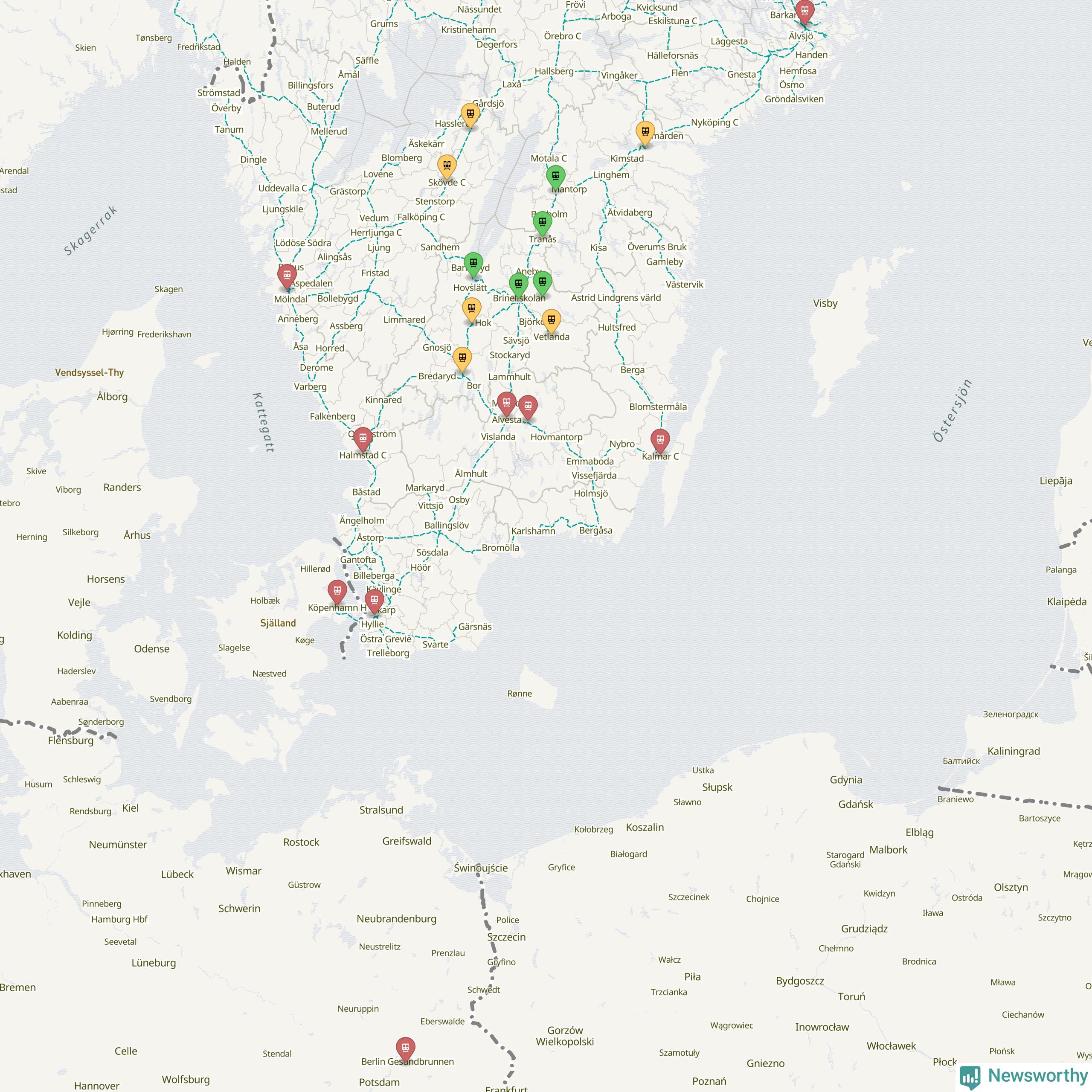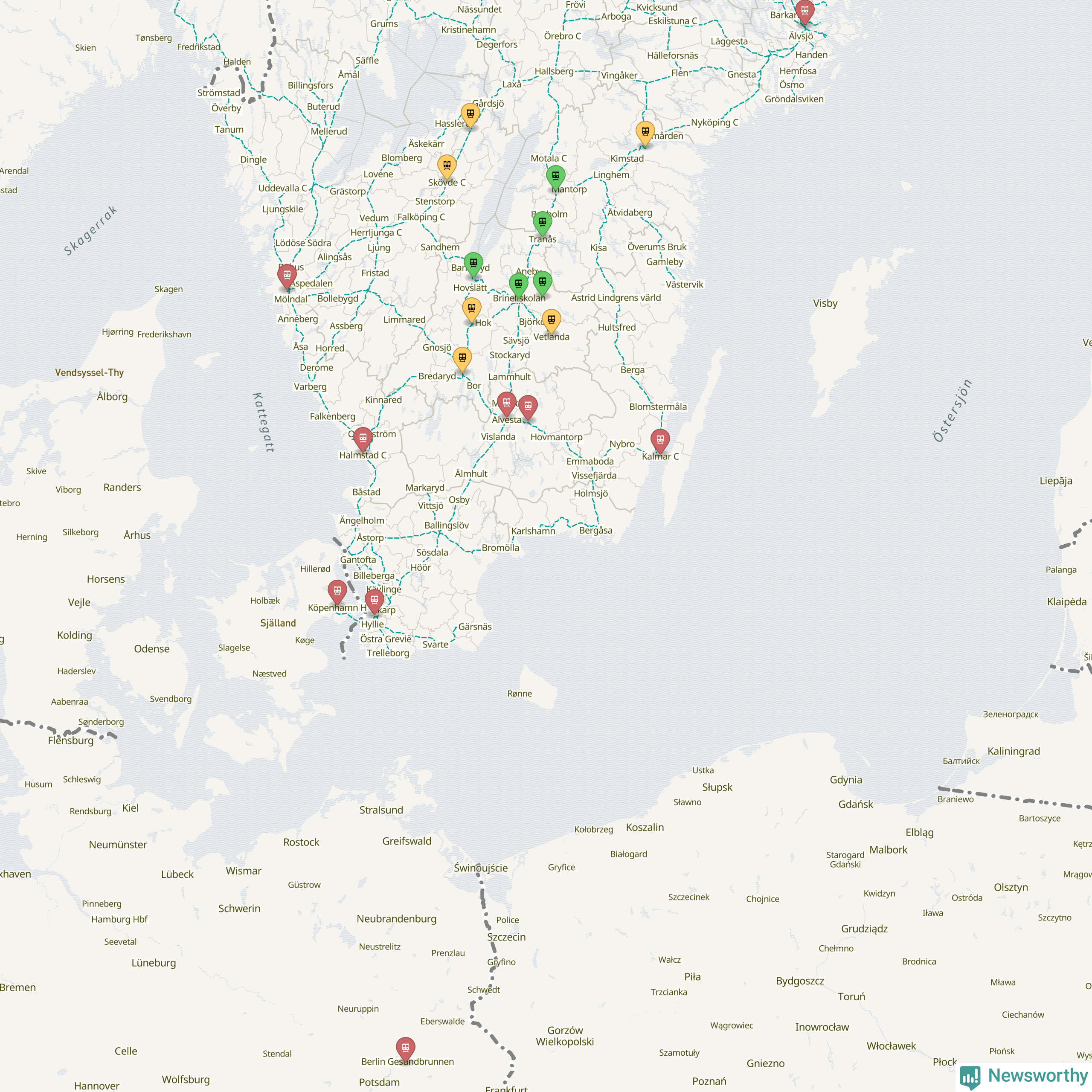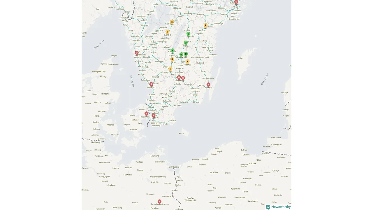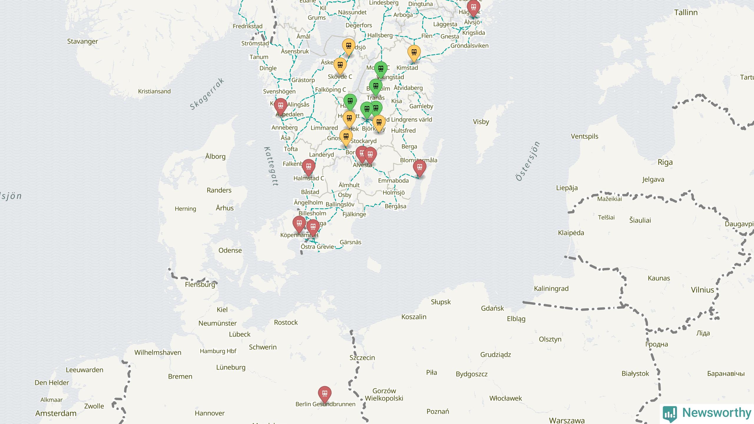 Kartdata från Mapbox, Newsworthy, OpenStreetMap och Trafikverket. Uppgifter om sträckor med passagerartrafik från jarnvag.net.