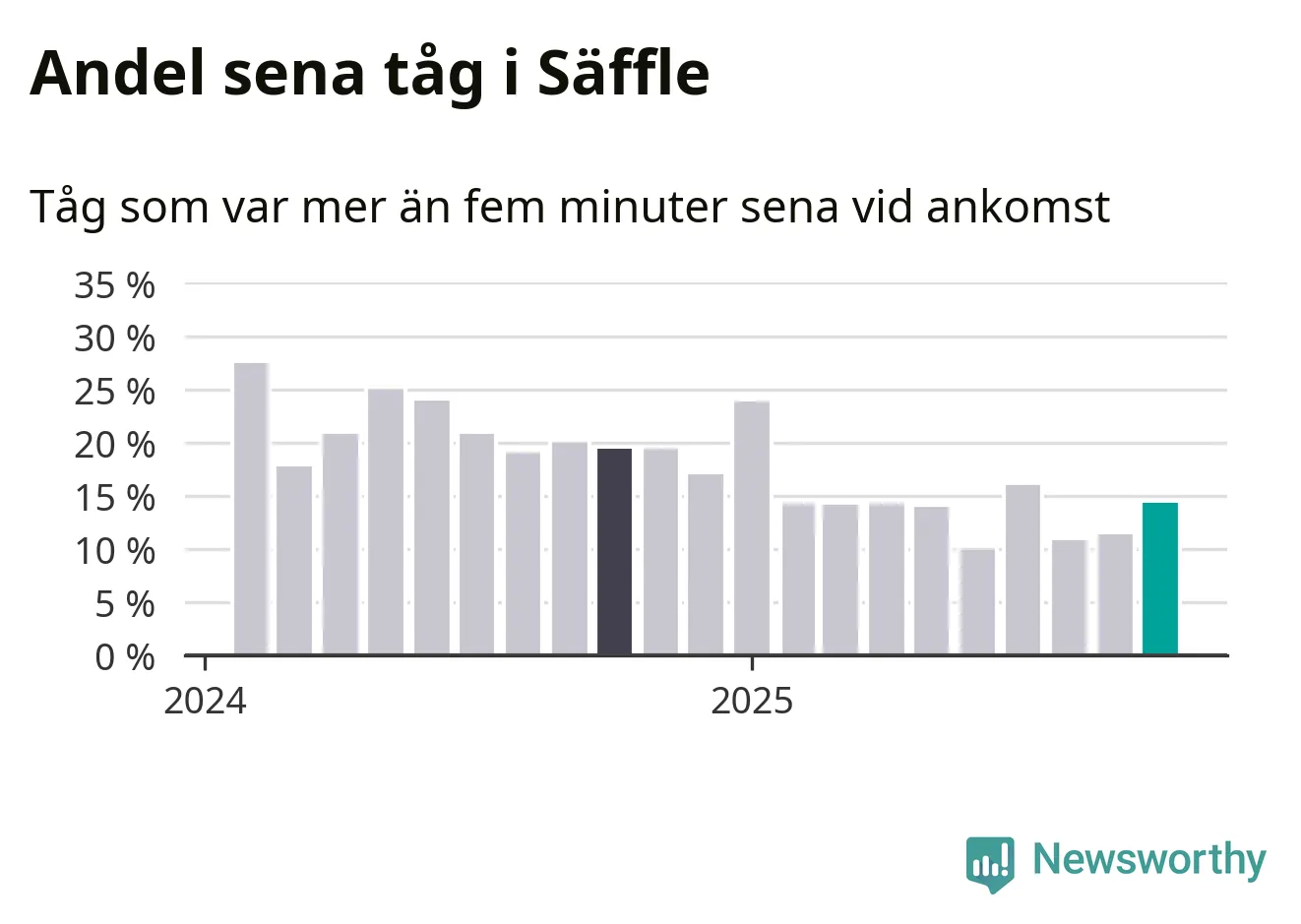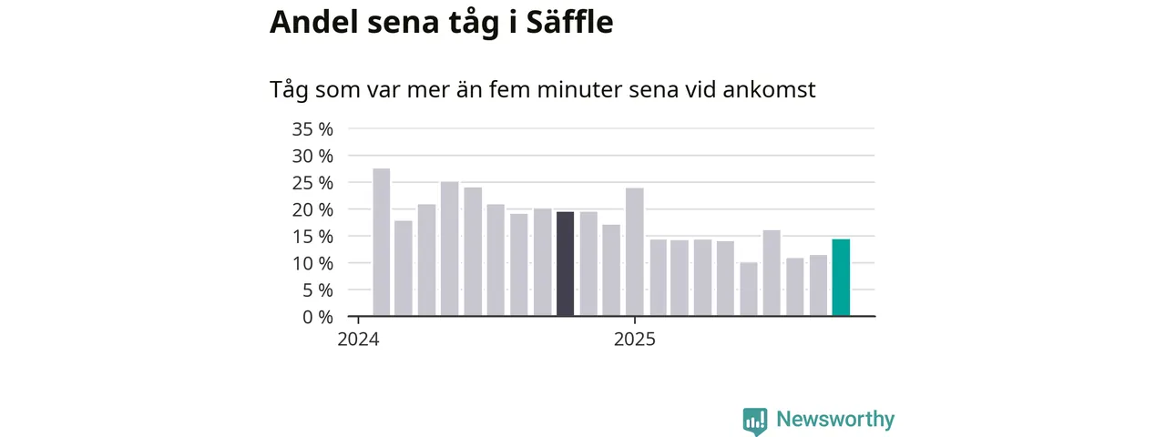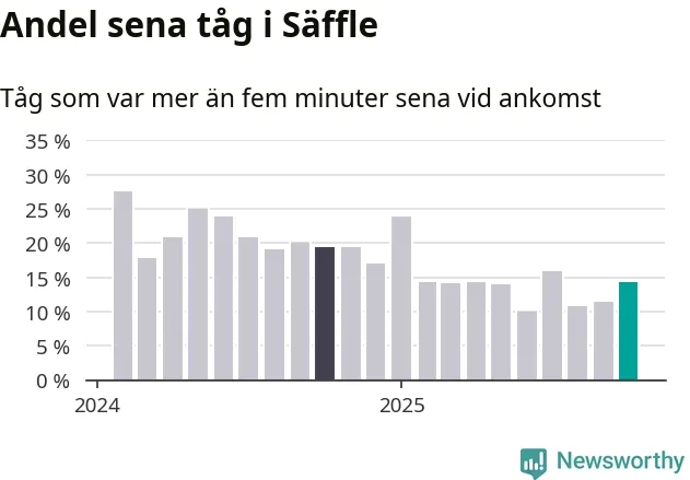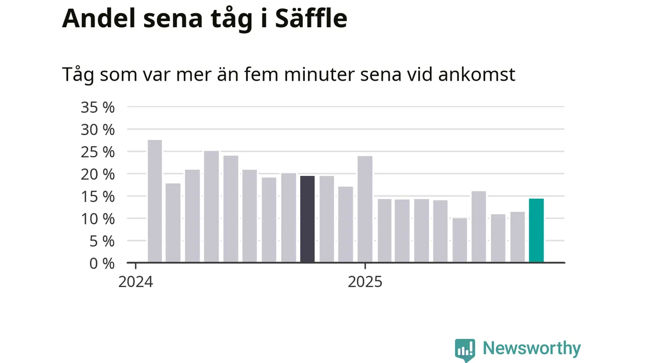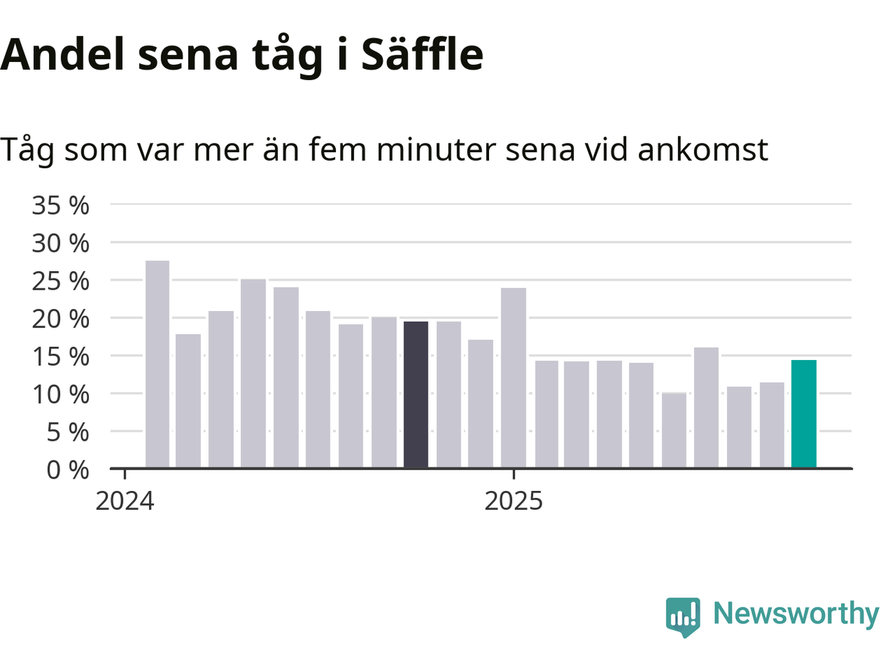 14 procent kan jämföras med elva procent månaden innan, och 19 procent i oktober 2024. Siffrorna bygger på realtidsinformation om tågavgångar och ankomster från Trafikverket, som Newsworthy löpande samlar in.
