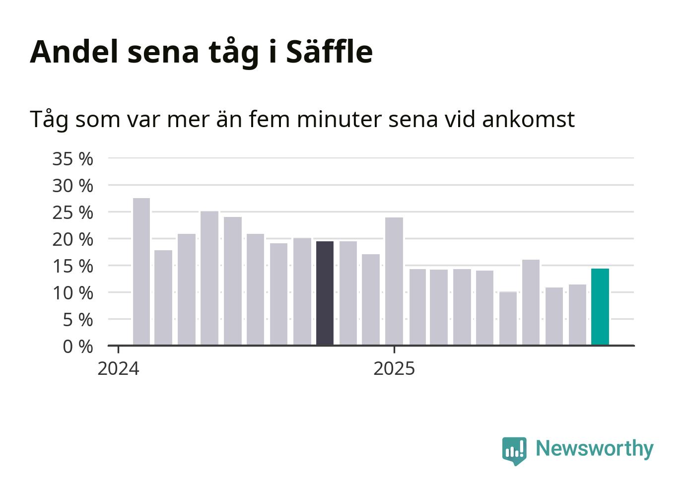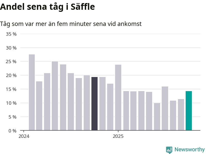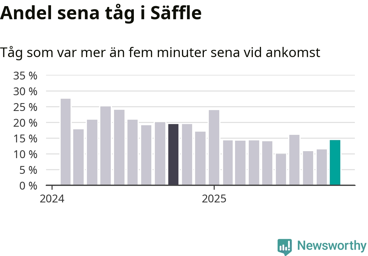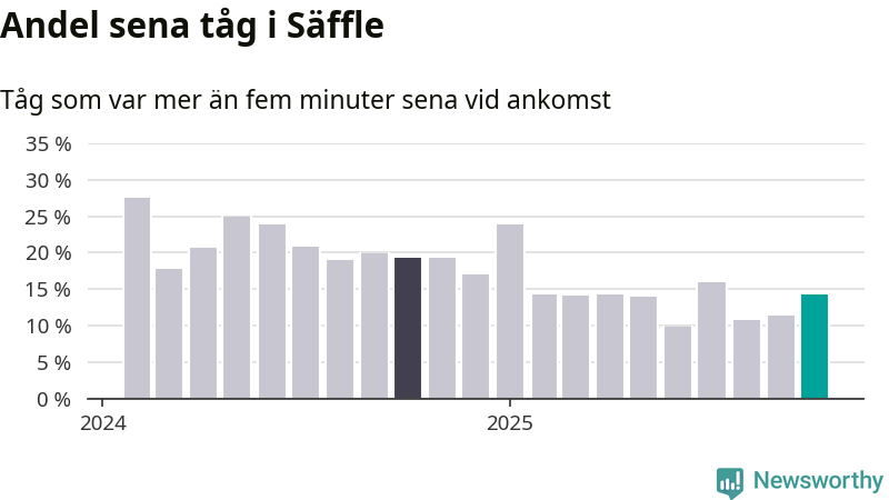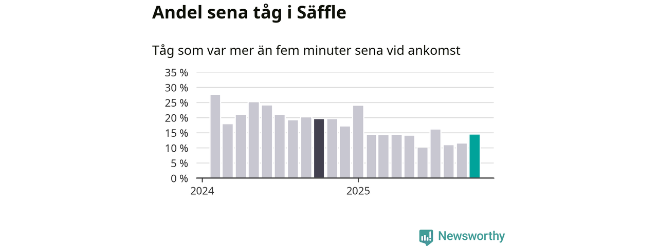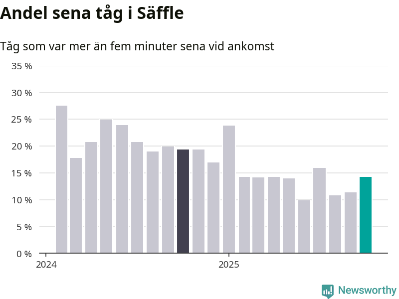 14 procent kan jämföras med elva procent månaden innan, och 19 procent i oktober 2024. Siffrorna bygger på realtidsinformation om tågavgångar och ankomster från Trafikverket, som Newsworthy löpande samlar in.