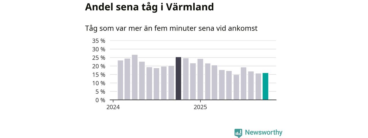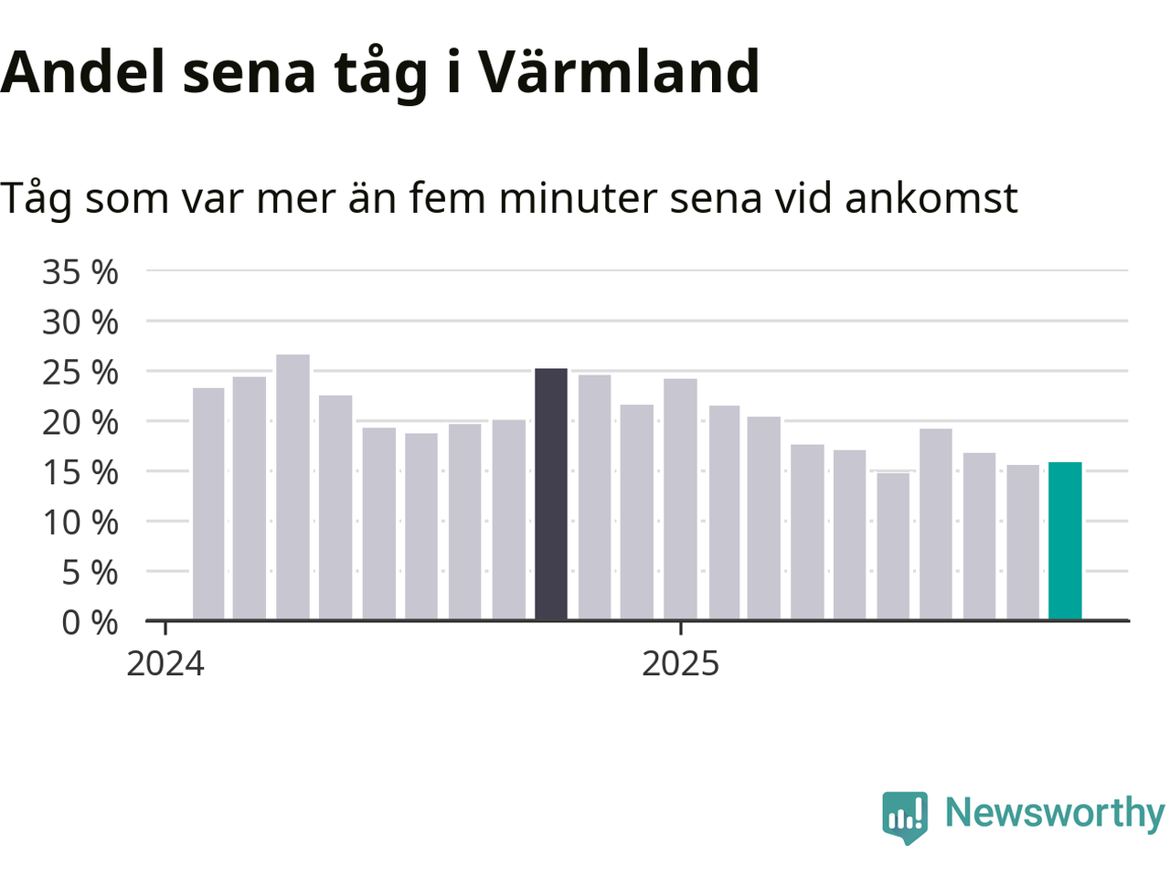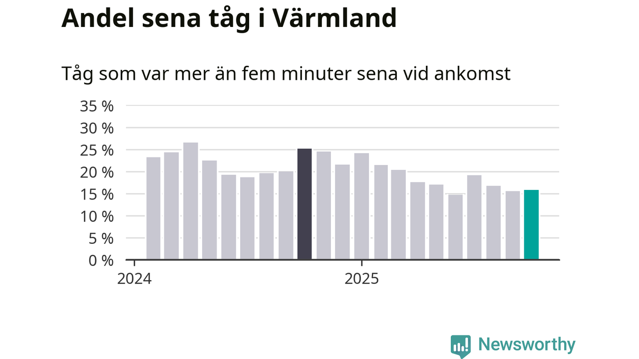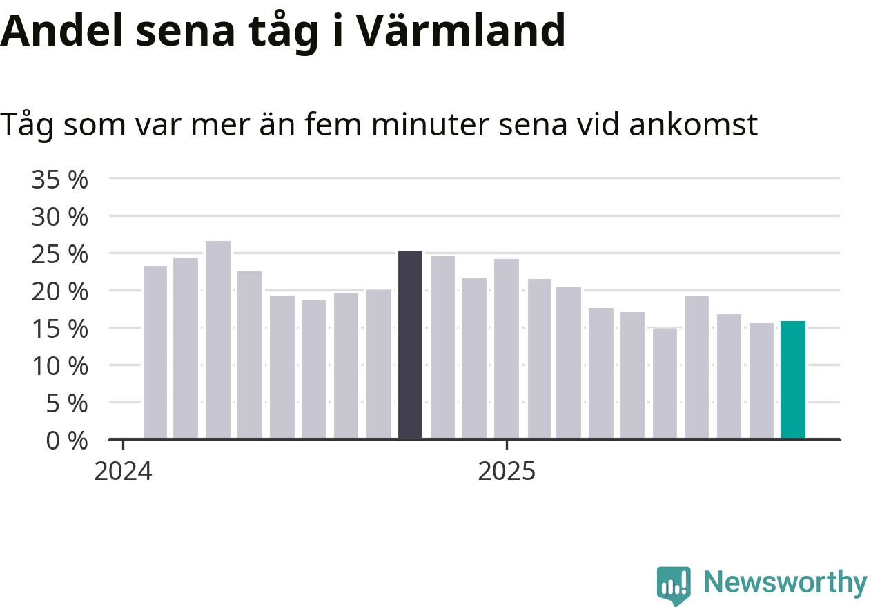 16 procent är marginellt mer än månaden innan, och kan jämföras med 25 procent i oktober 2024. Siffrorna bygger på realtidsinformation om tågavgångar och ankomster från Trafikverket, som Newsworthy löpande samlar in.