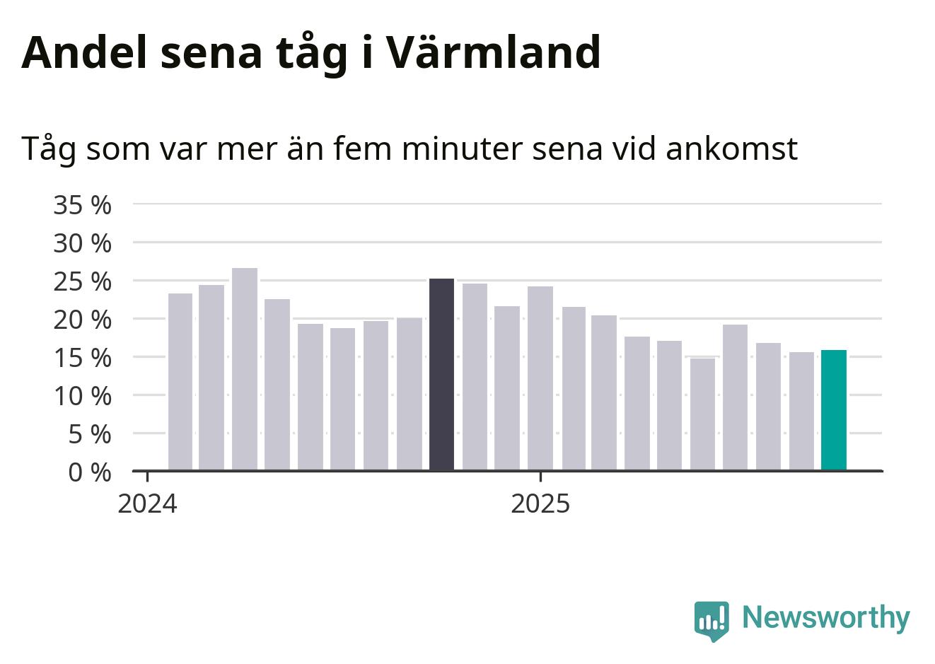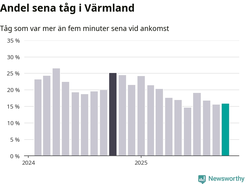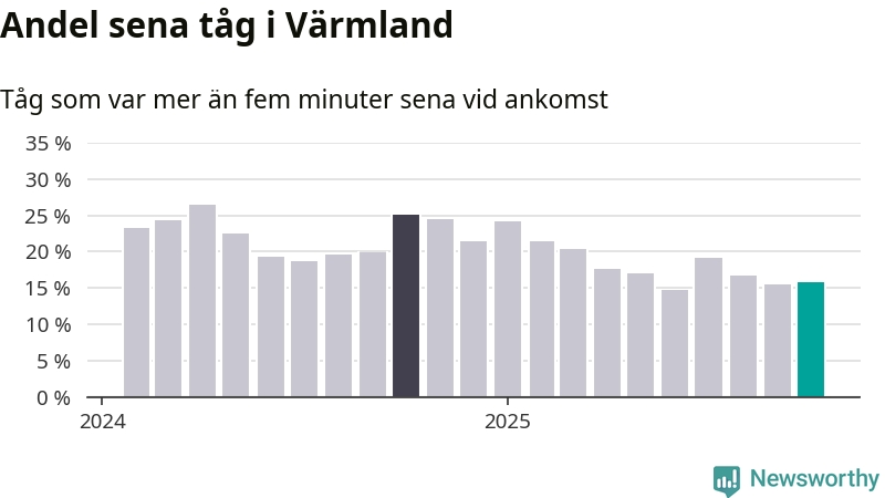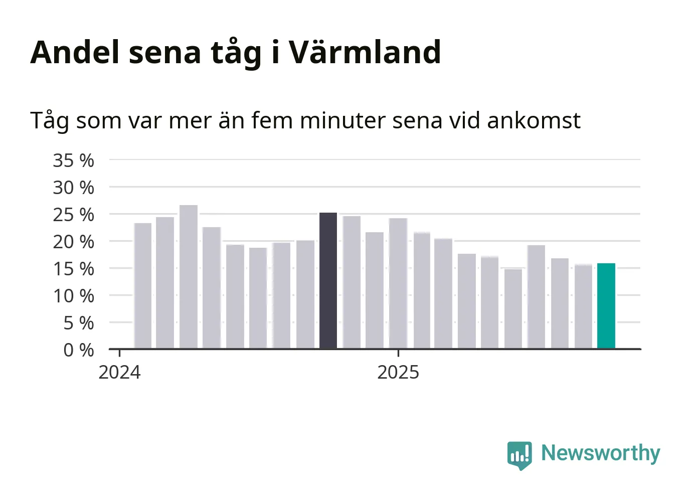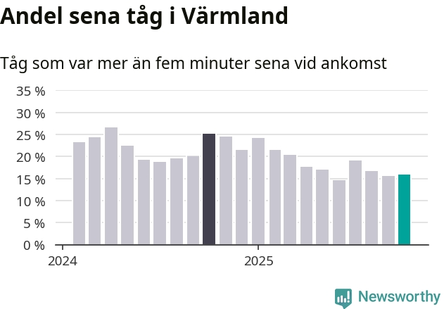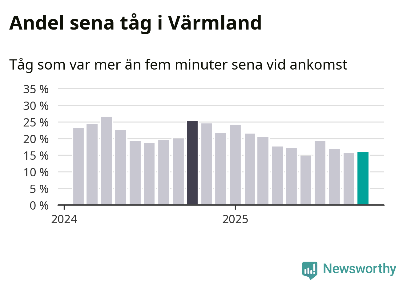 16 procent är marginellt mer än månaden innan, och kan jämföras med 25 procent i oktober 2024. Siffrorna bygger på realtidsinformation om tågavgångar och ankomster från Trafikverket, som Newsworthy löpande samlar in.