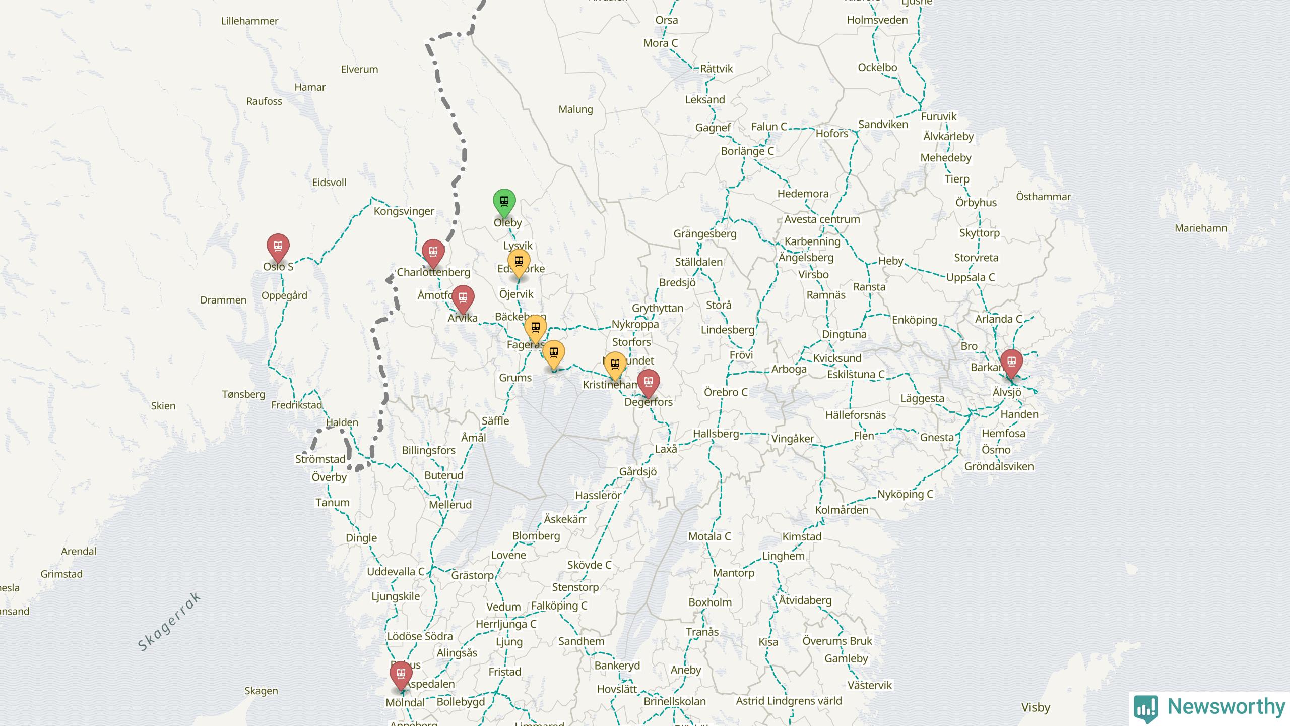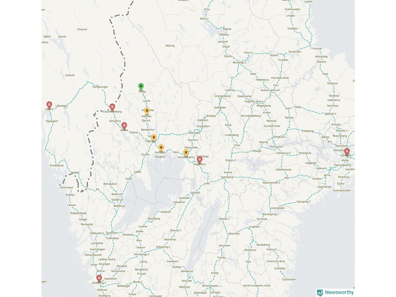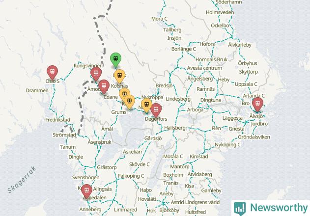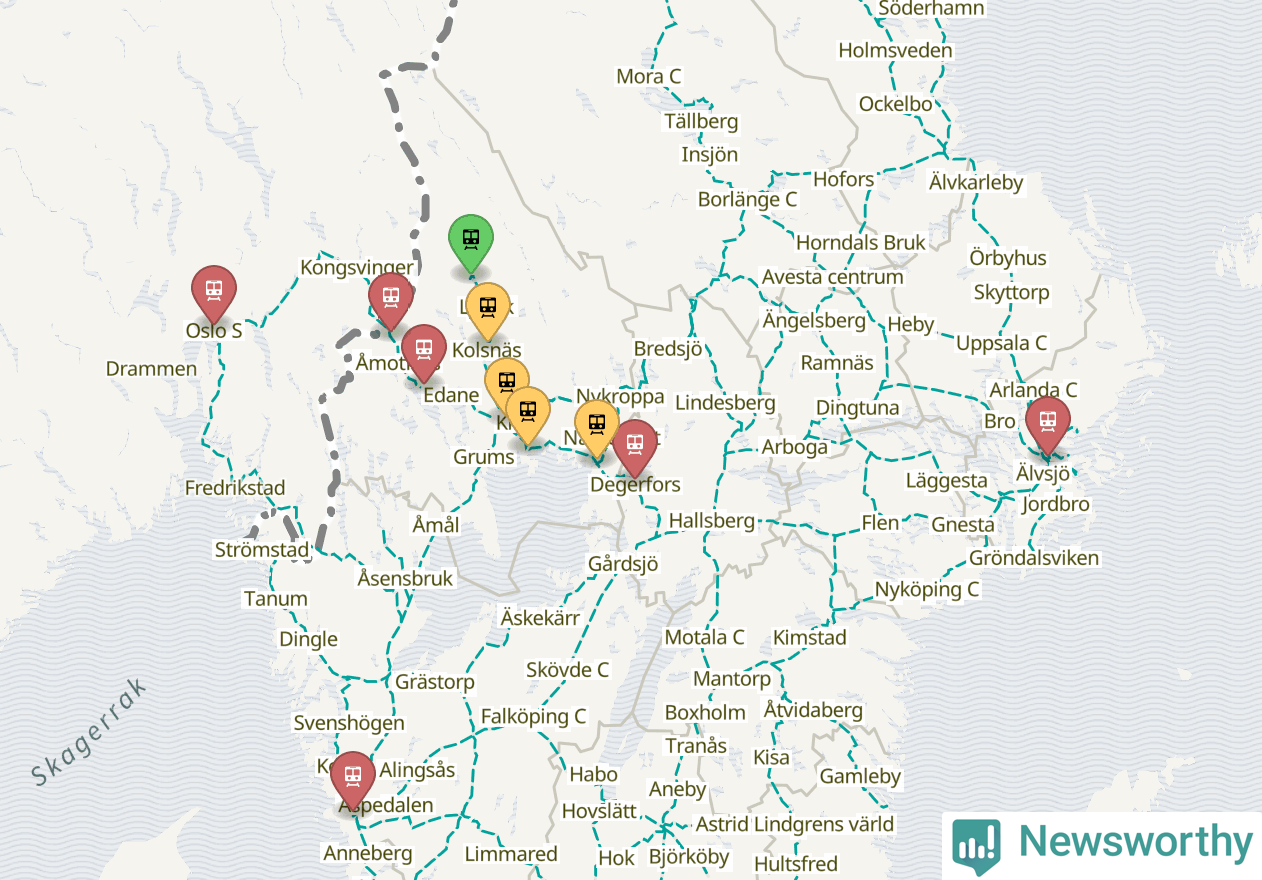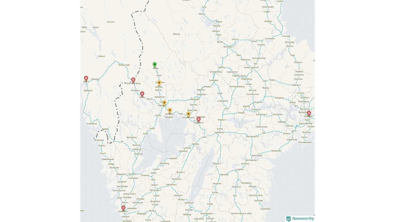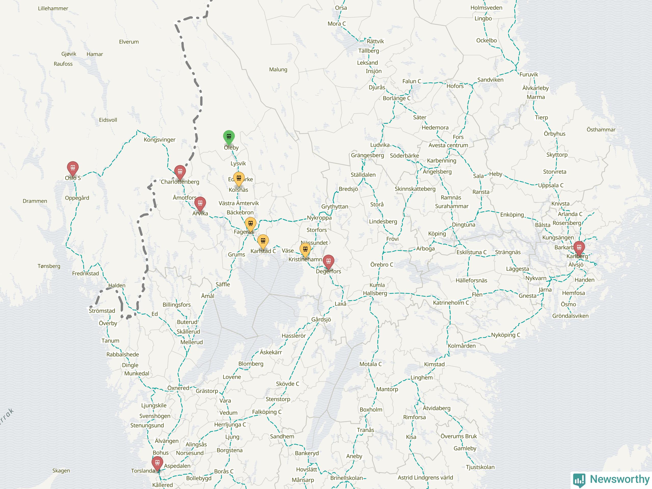 Kartdata från Mapbox, Newsworthy, OpenStreetMap och Trafikverket. Uppgifter om sträckor med passagerartrafik från jarnvag.net.