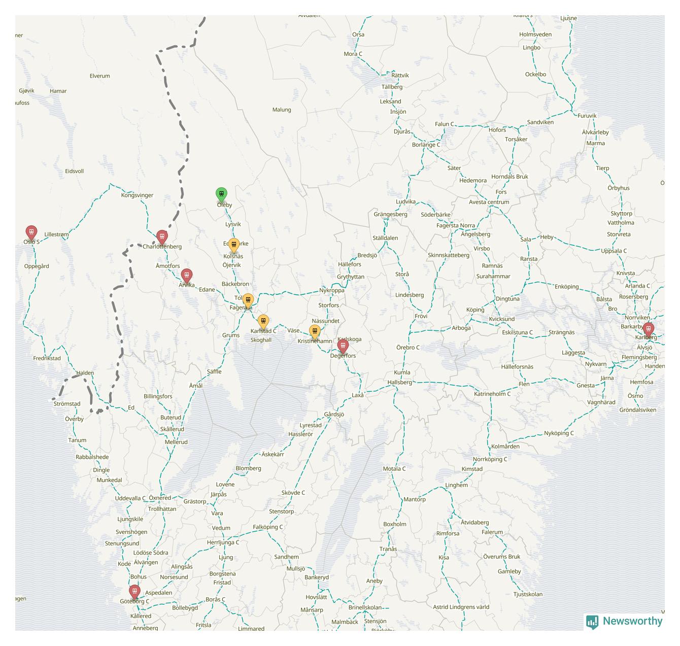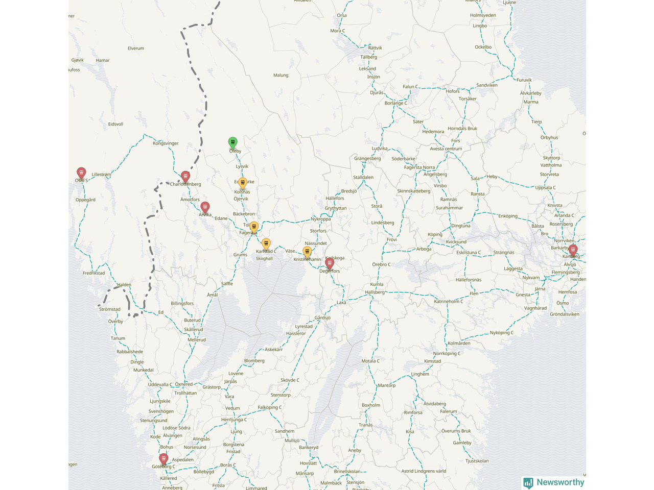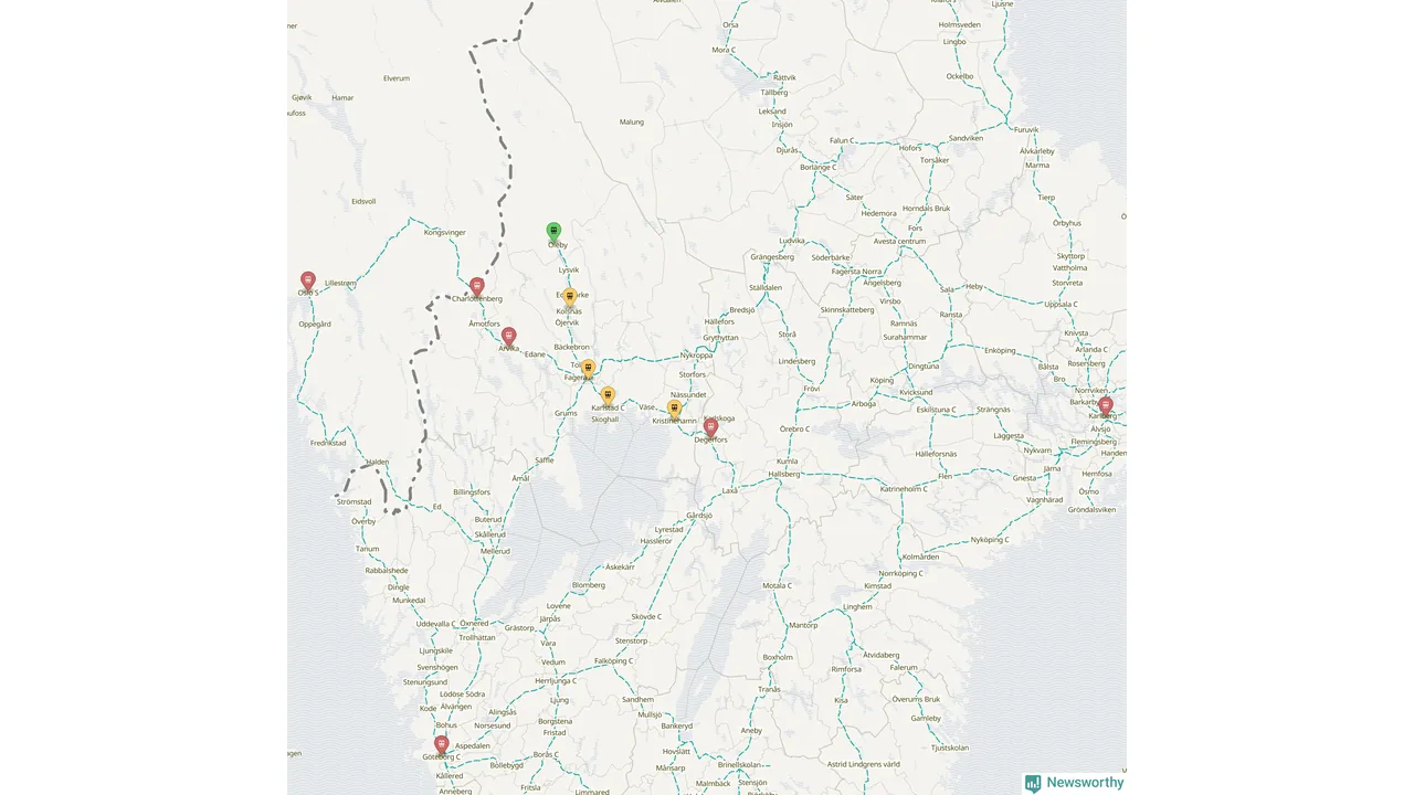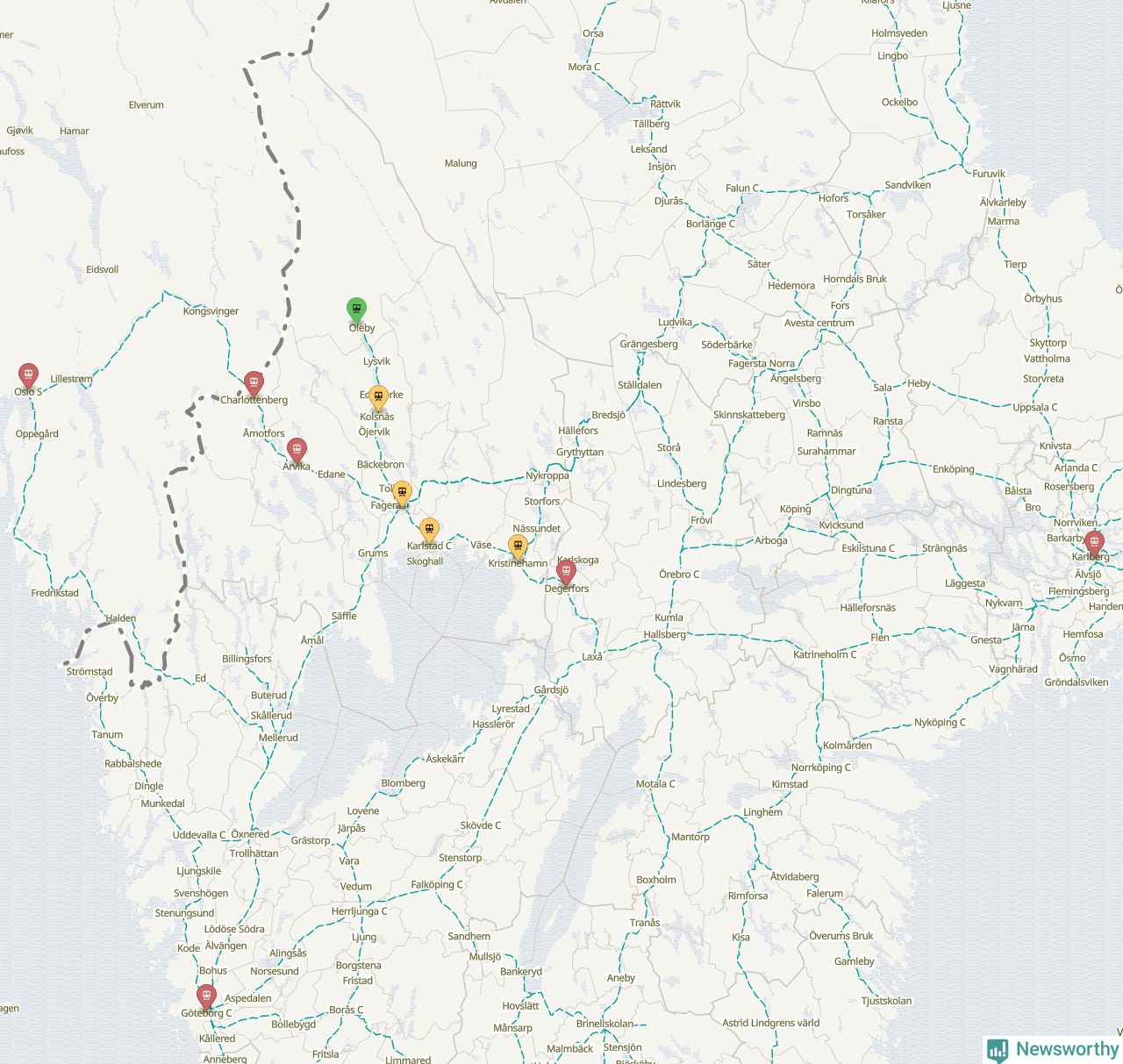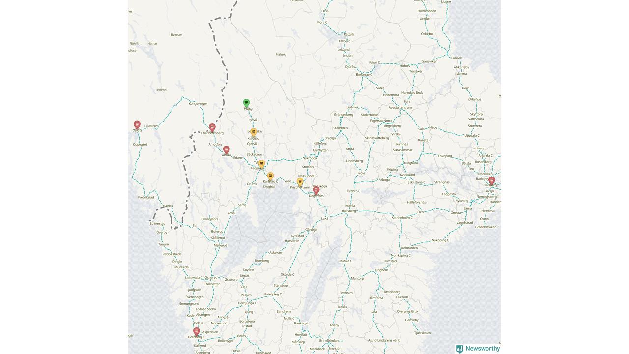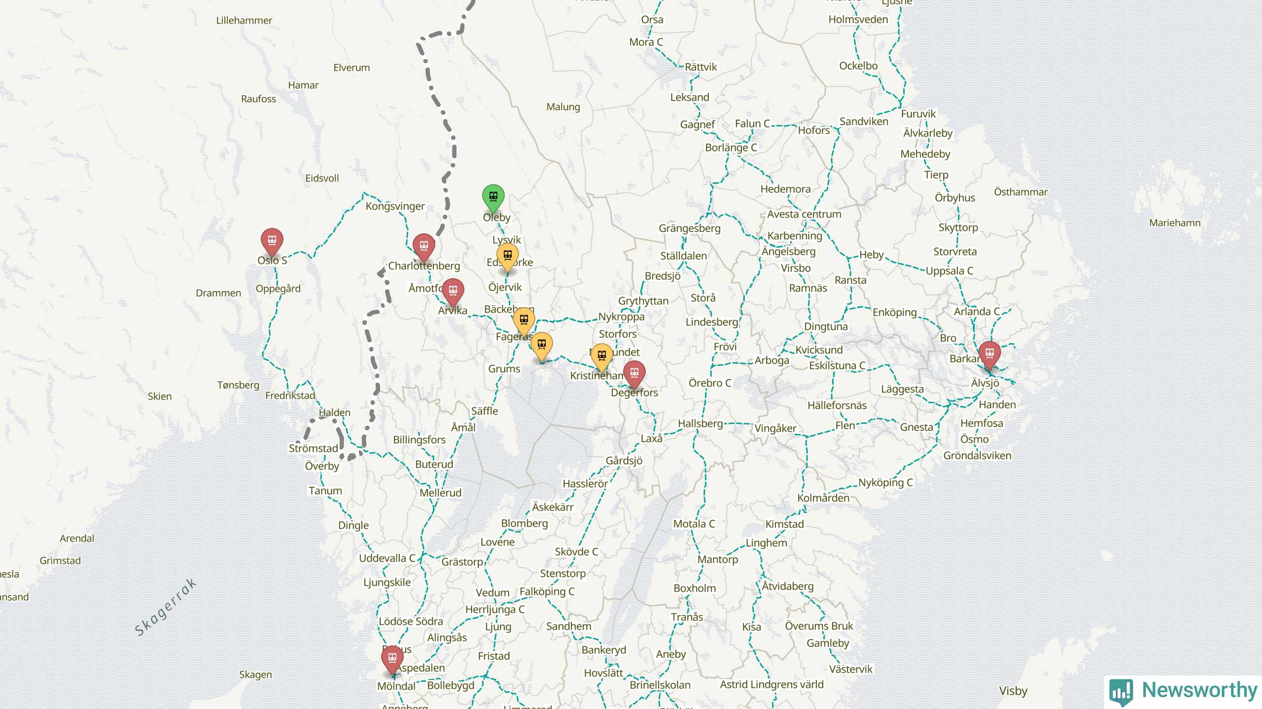 Kartdata från Mapbox, Newsworthy, OpenStreetMap och Trafikverket. Uppgifter om sträckor med passagerartrafik från jarnvag.net.