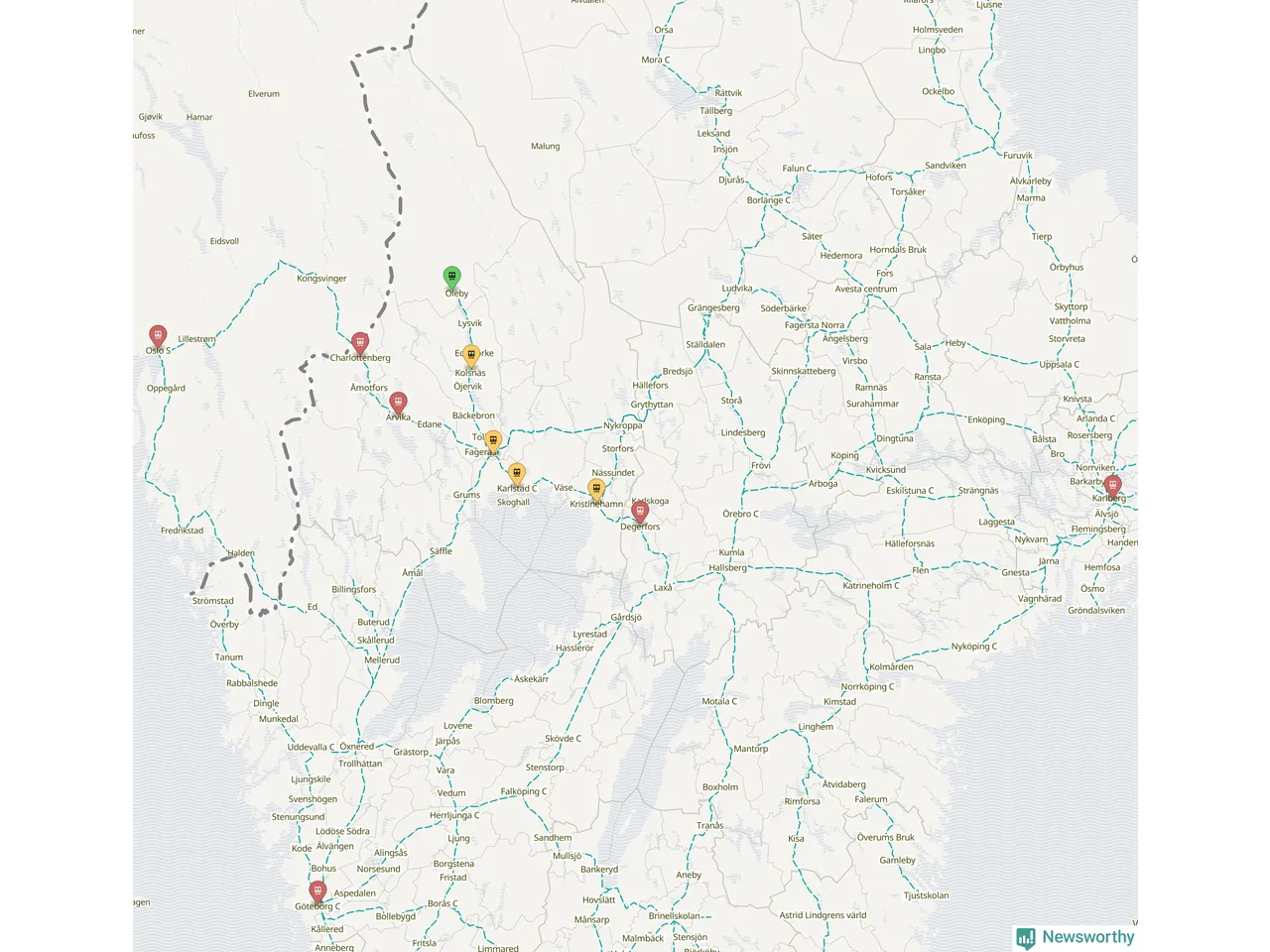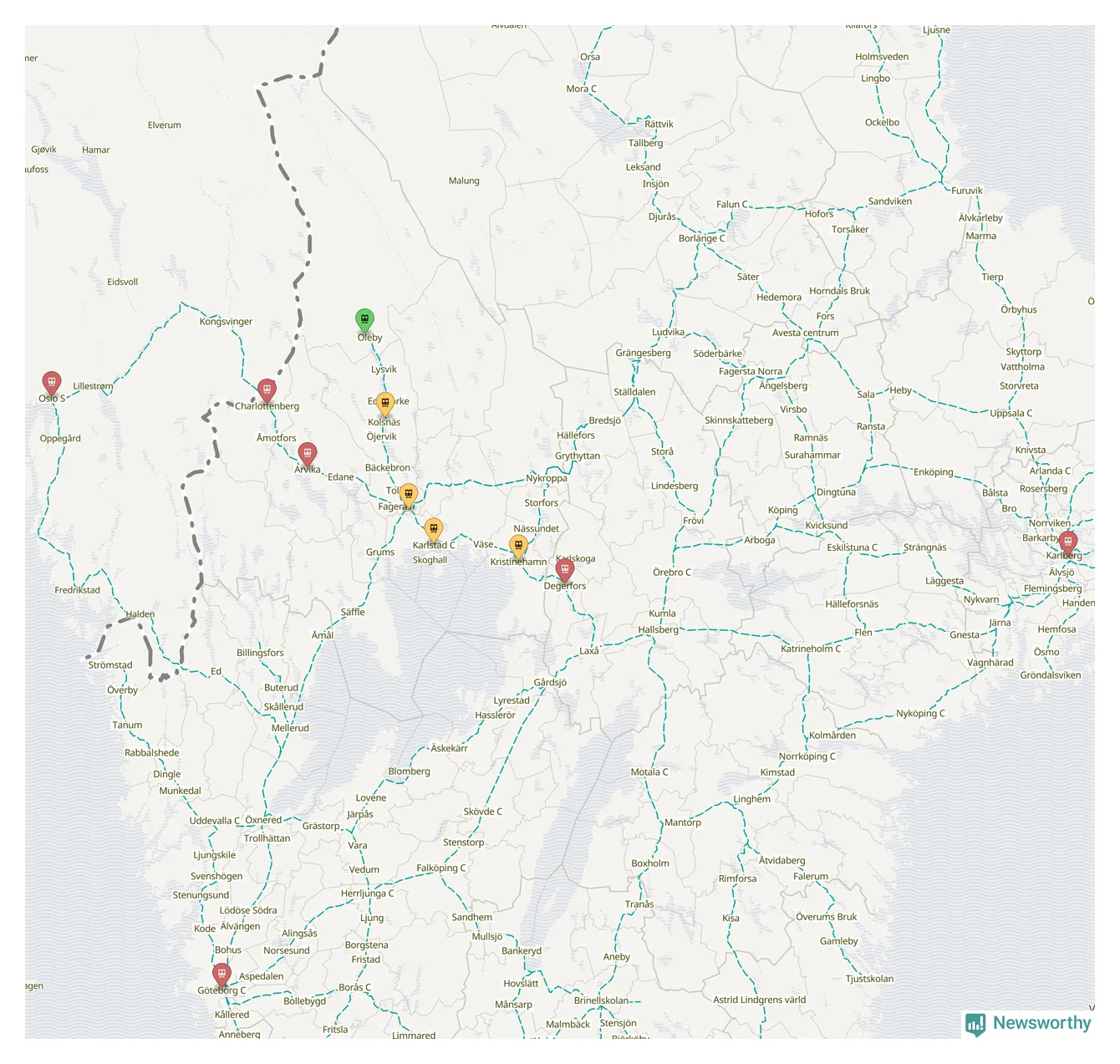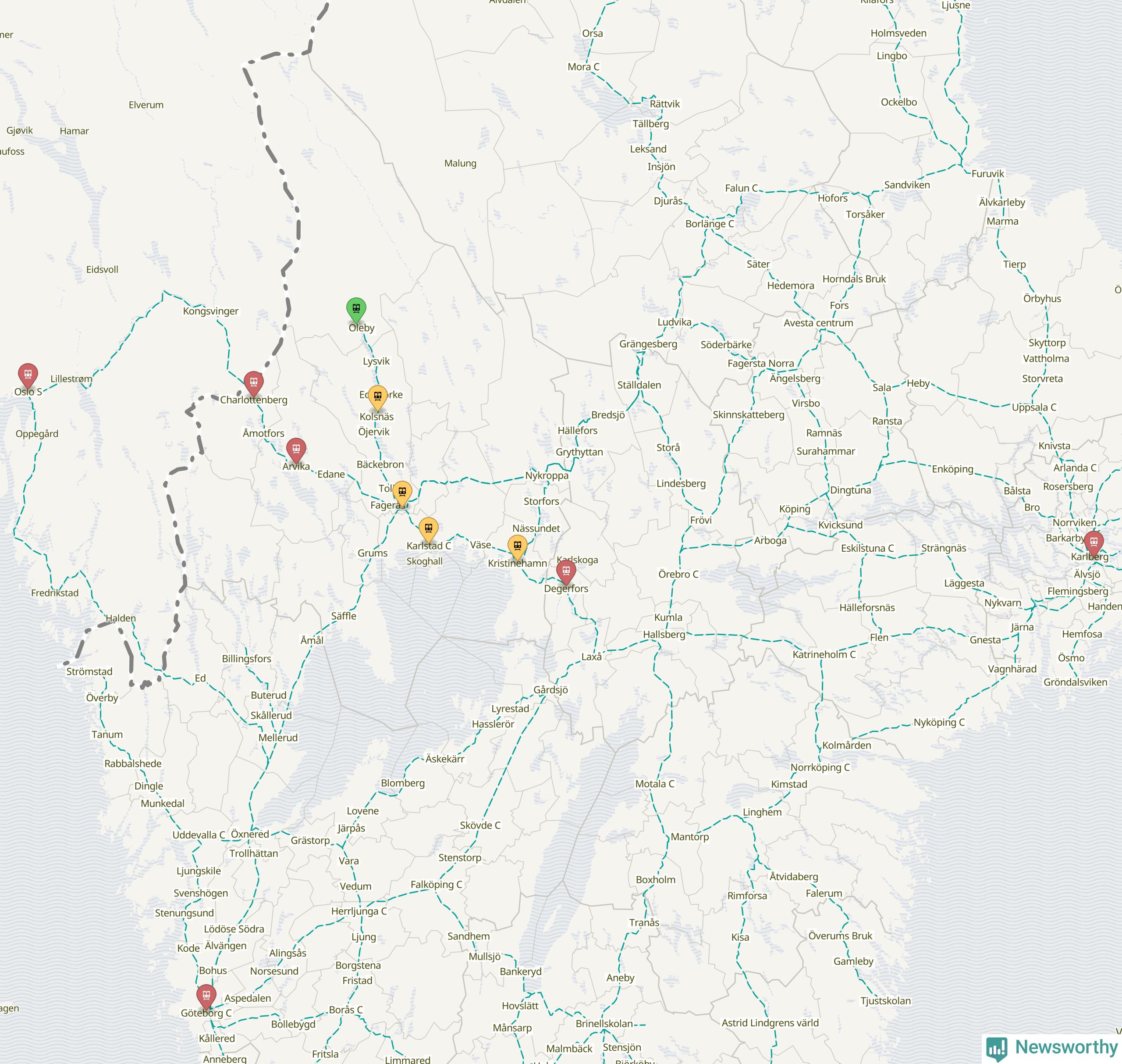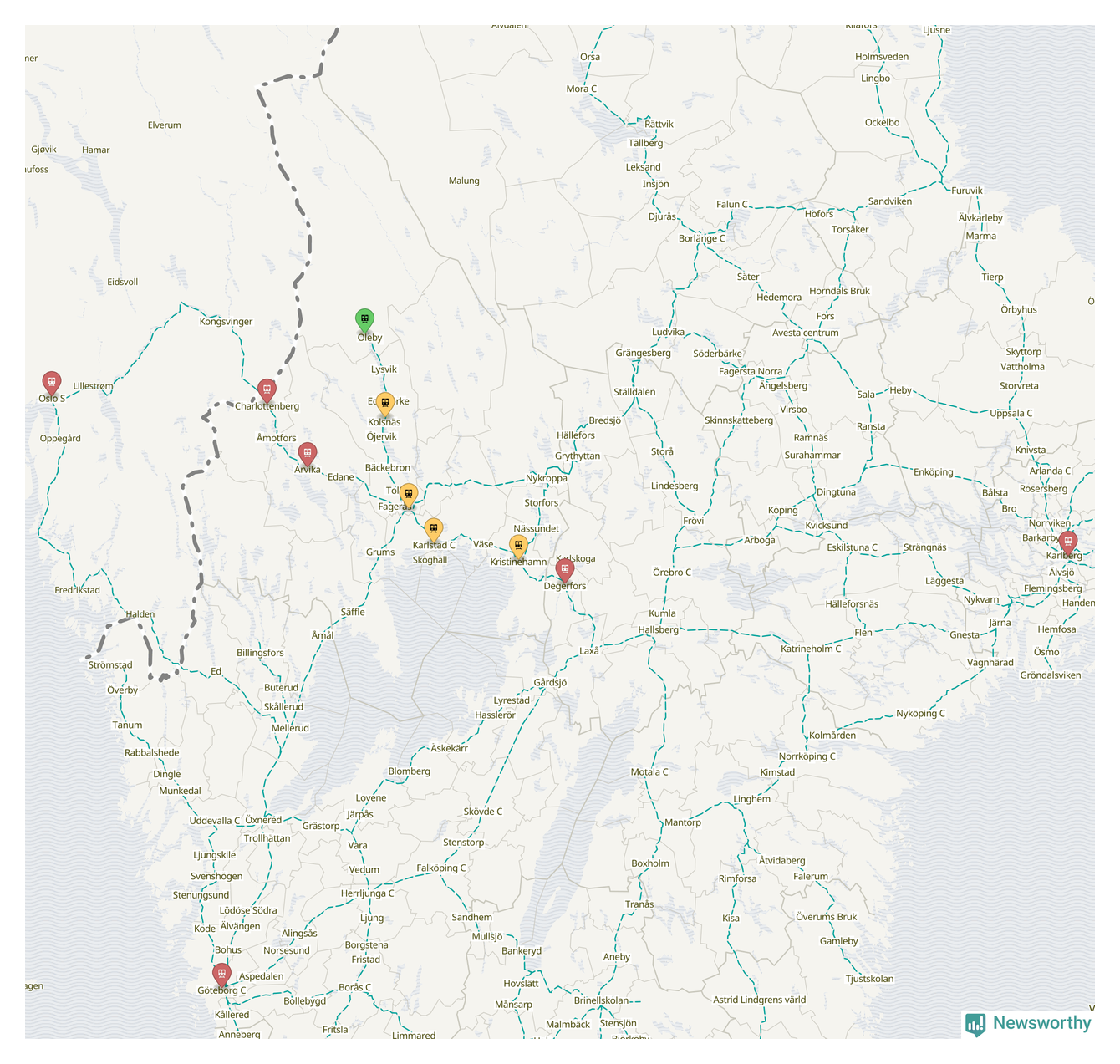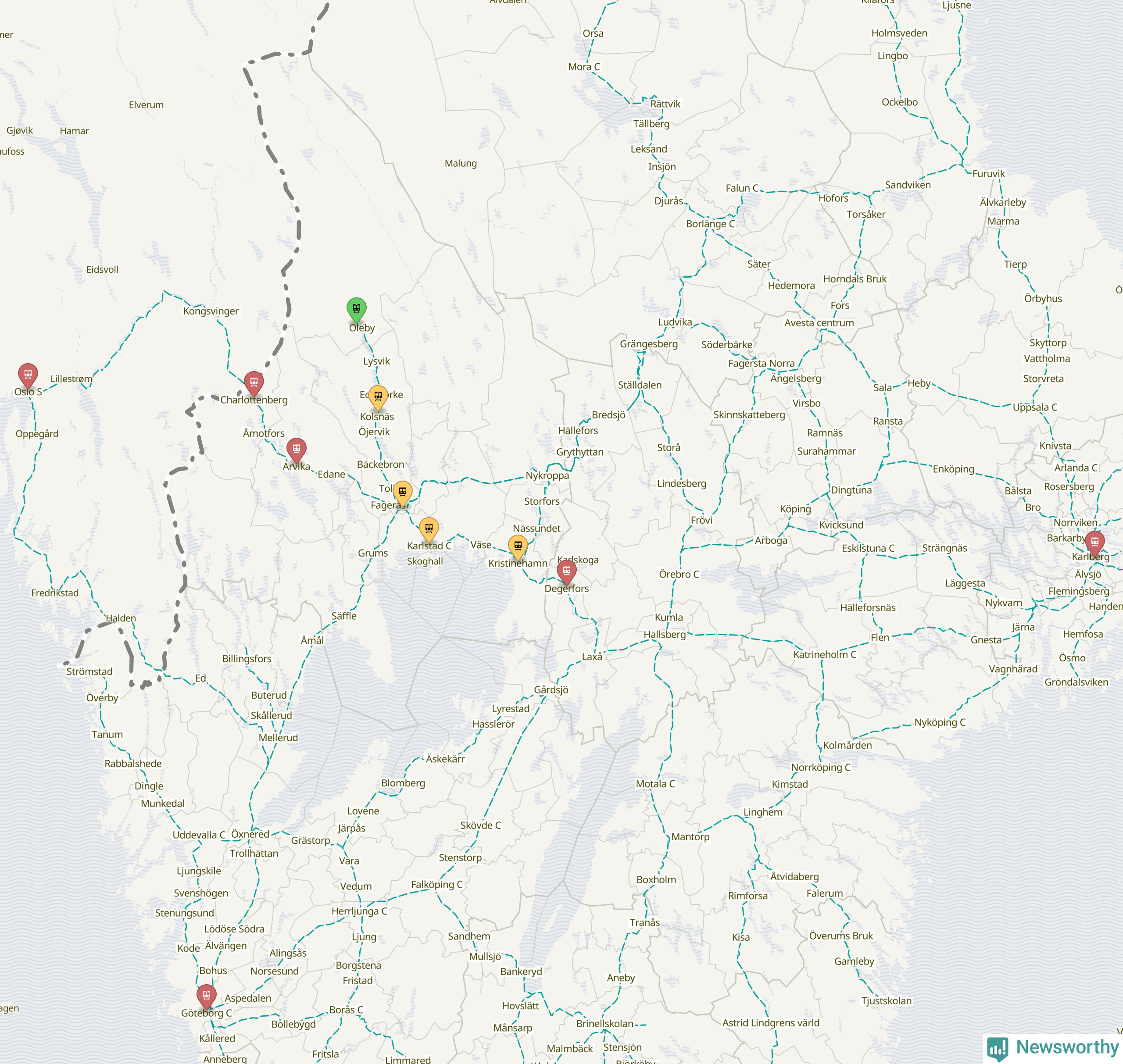 Kartdata från Mapbox, Newsworthy, OpenStreetMap och Trafikverket. Uppgifter om sträckor med passagerartrafik från jarnvag.net.