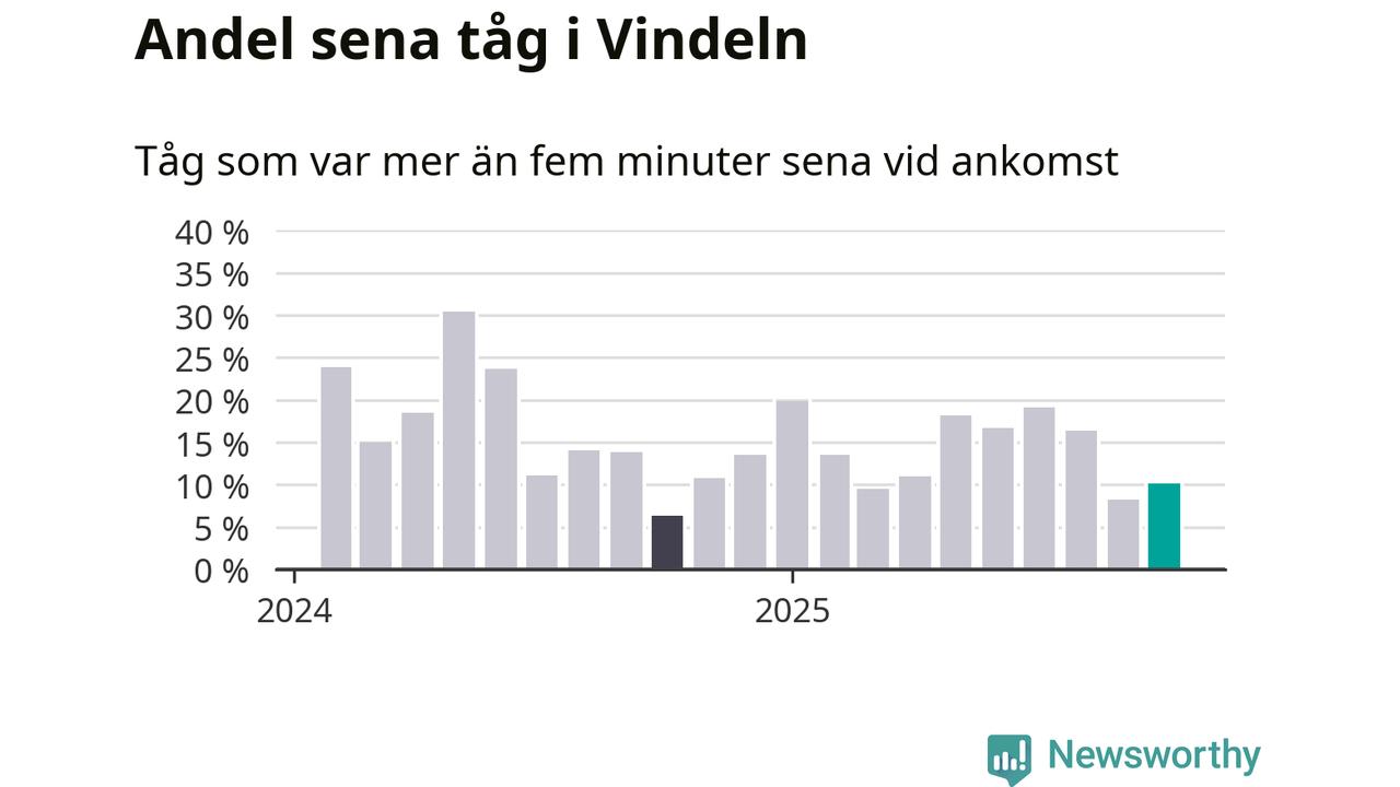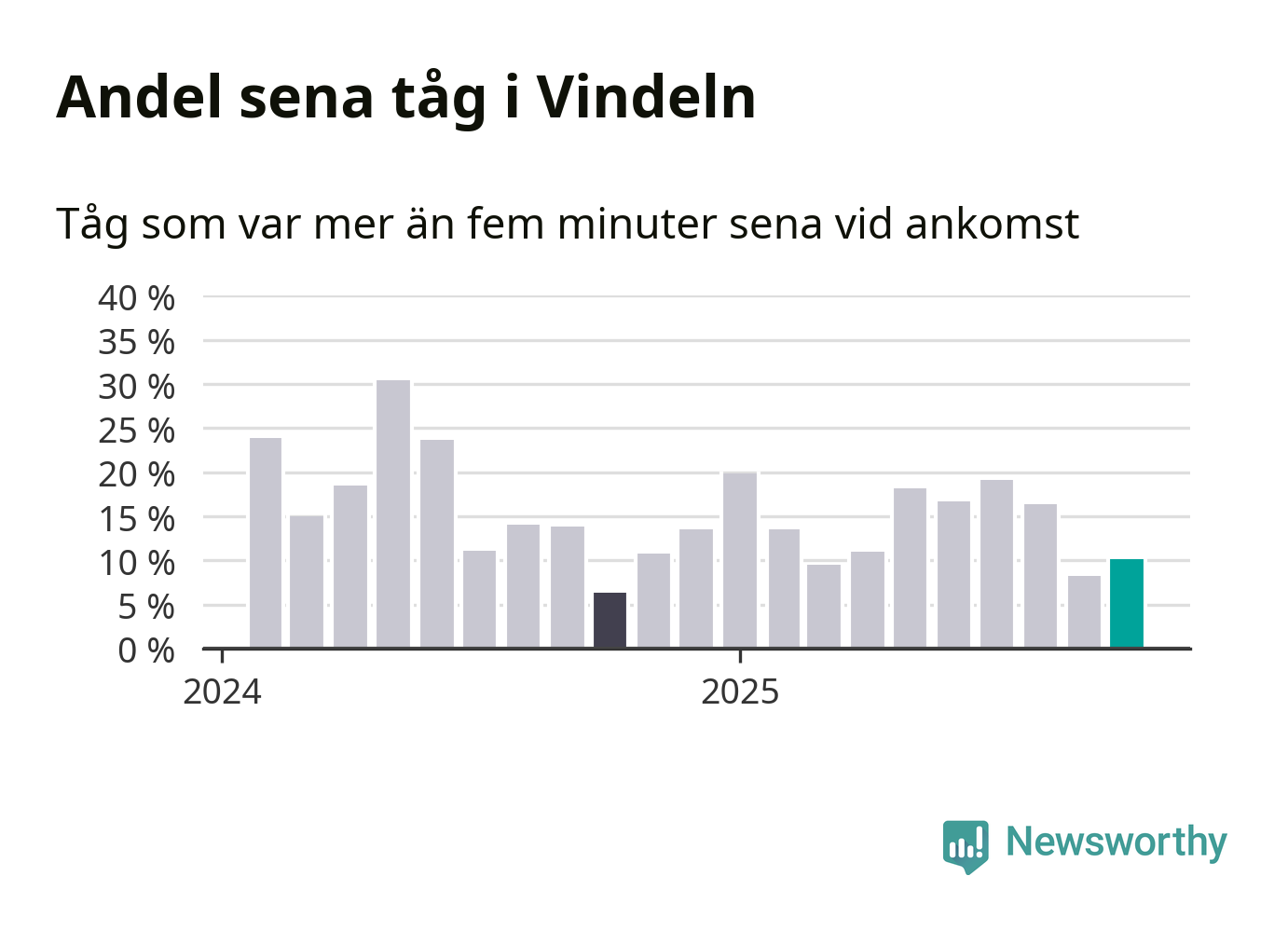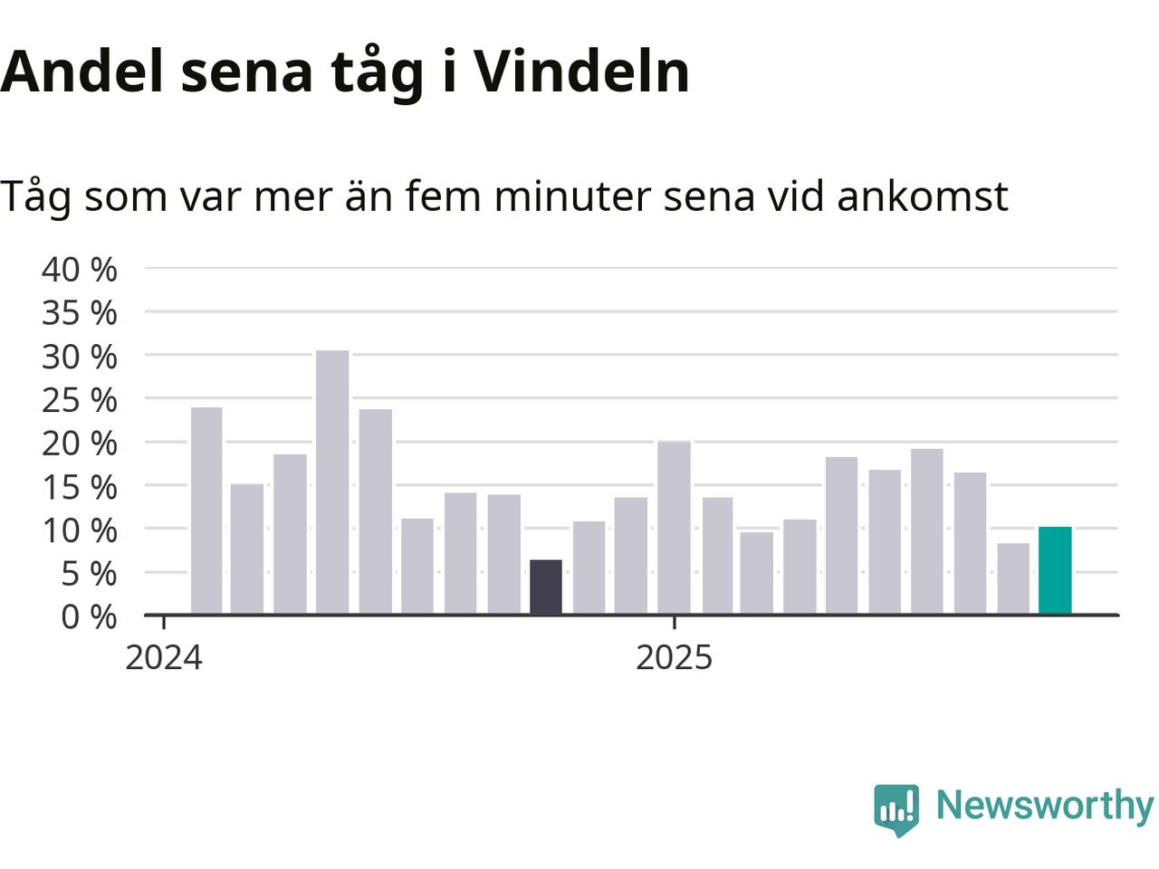 Tio procent kan jämföras med åtta procent månaden innan, och sex procent i oktober 2024. Siffrorna bygger på realtidsinformation om tågavgångar och ankomster från Trafikverket, som Newsworthy löpande samlar in.