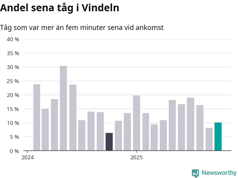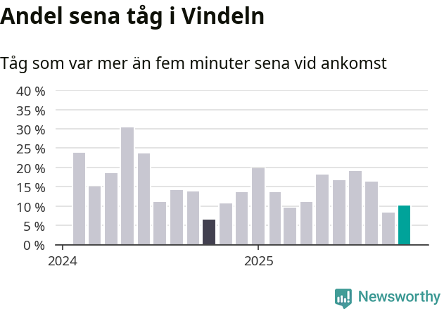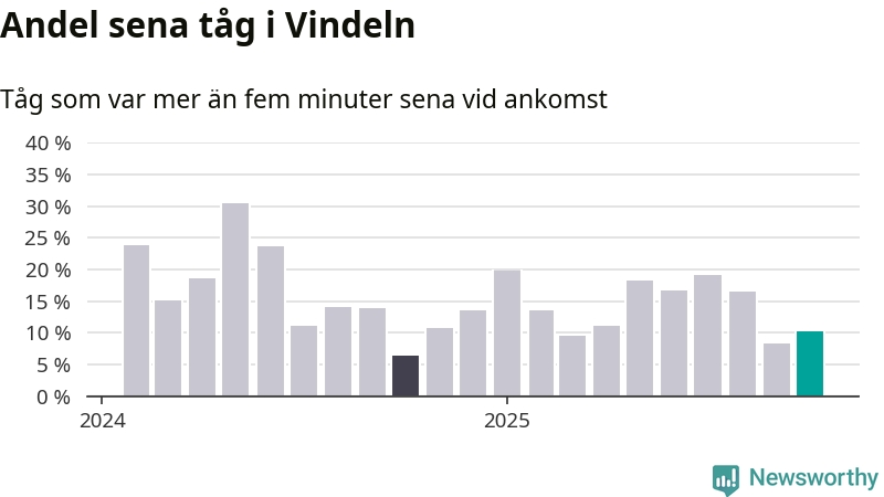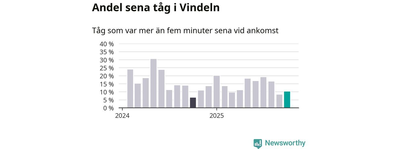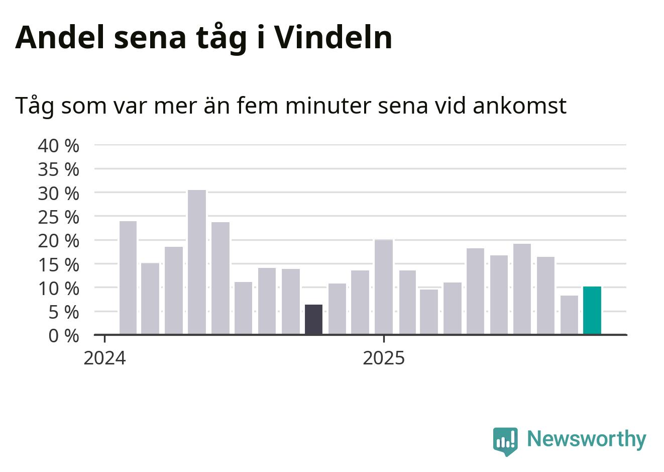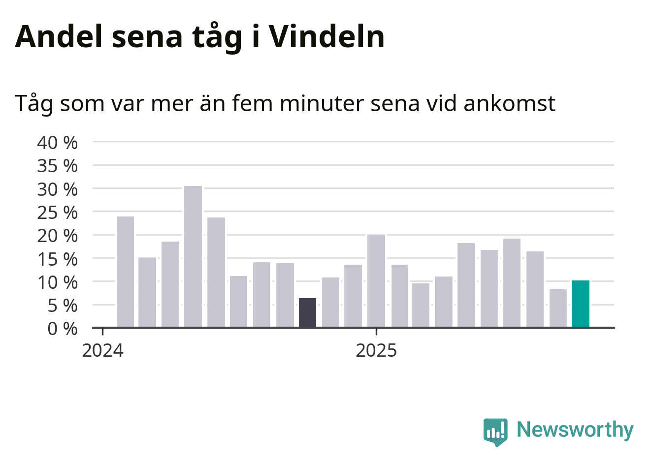 Tio procent kan jämföras med åtta procent månaden innan, och sex procent i oktober 2024. Siffrorna bygger på realtidsinformation om tågavgångar och ankomster från Trafikverket, som Newsworthy löpande samlar in.