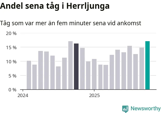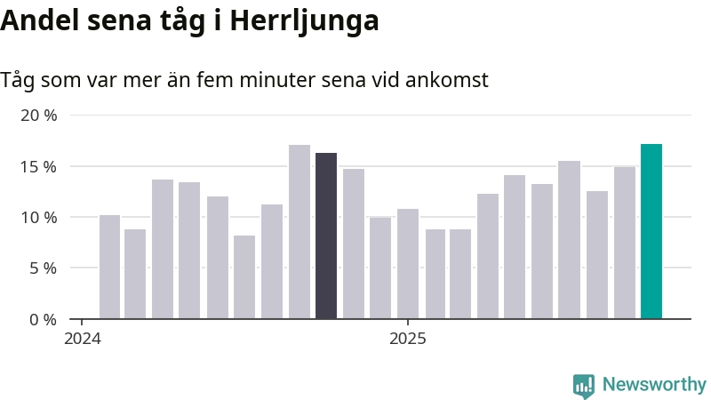 Andelen sena tåg vid stationerna i Herrljunga kommun steg förra månaden, till den högsta noteringen sedan åtminstone förra årsskiftet.