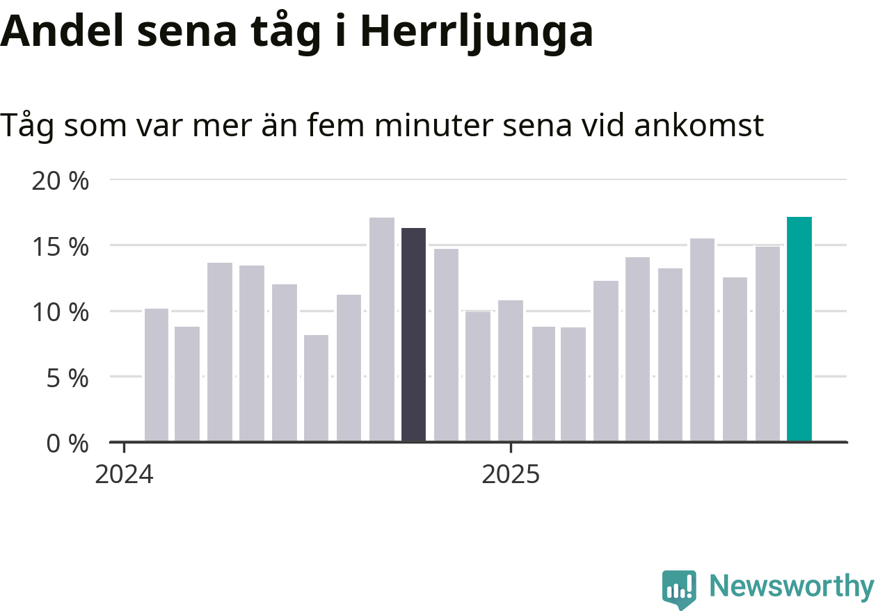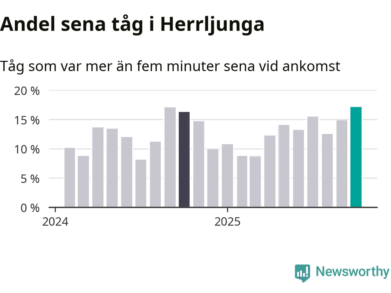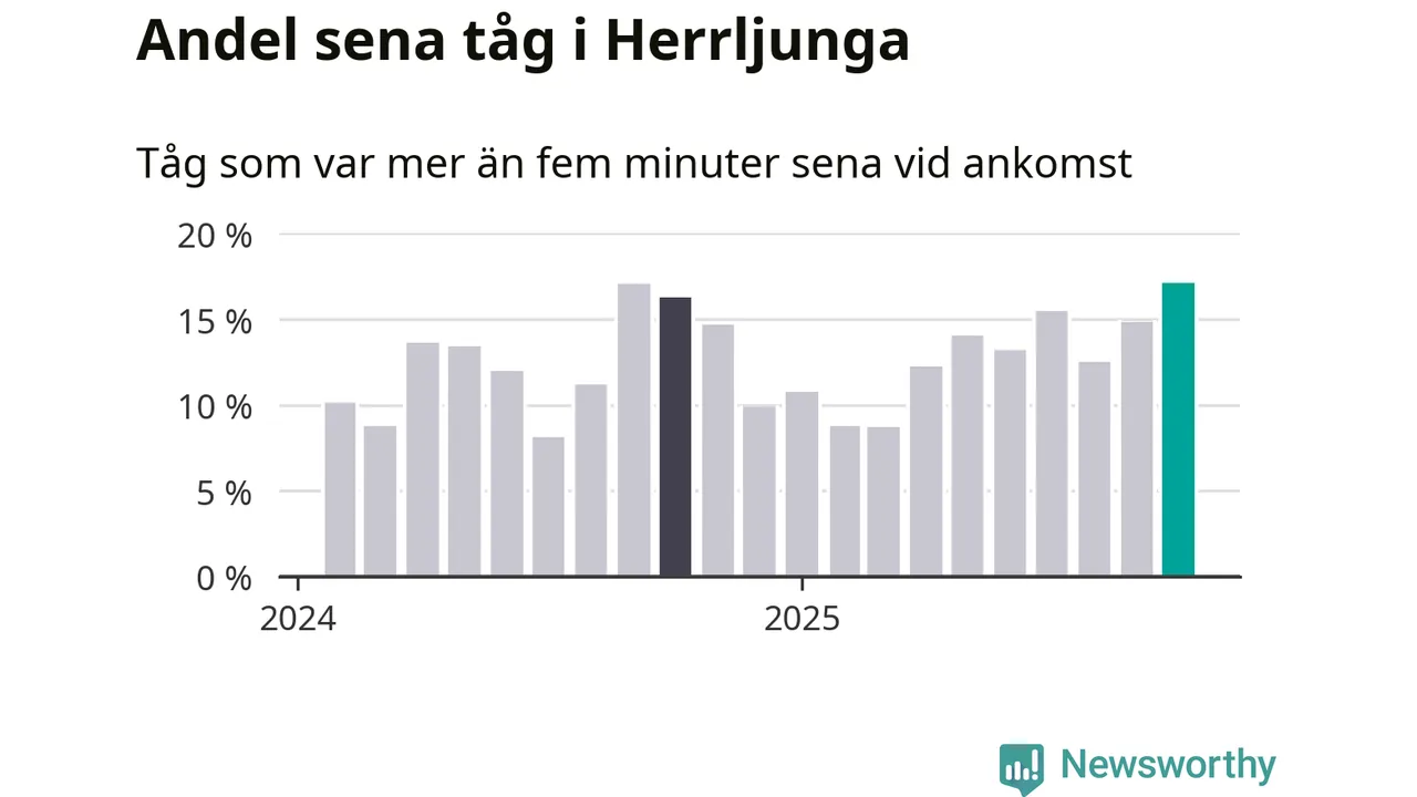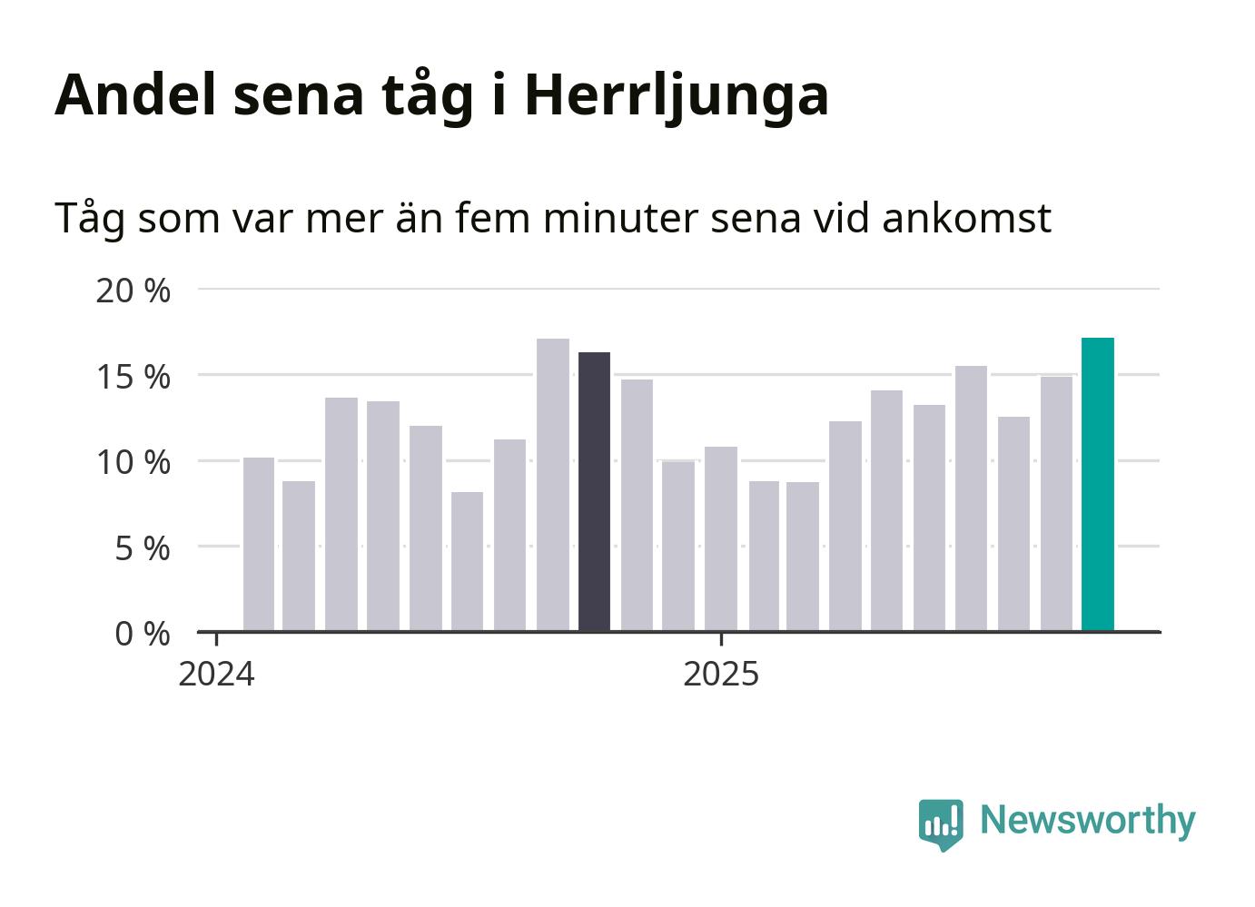 17 procent är den högsta andelen sena tåg sedan åtminstone den hårt förseningsdrabbade vintern 2023/24. Siffrorna bygger på realtidsinformation om tågavgångar och ankomster från Trafikverket, som Newsworthy löpande samlar in.