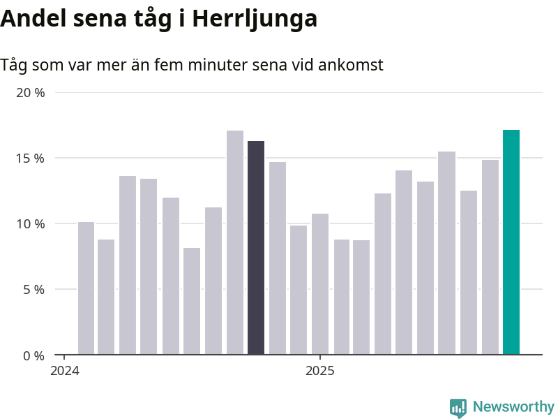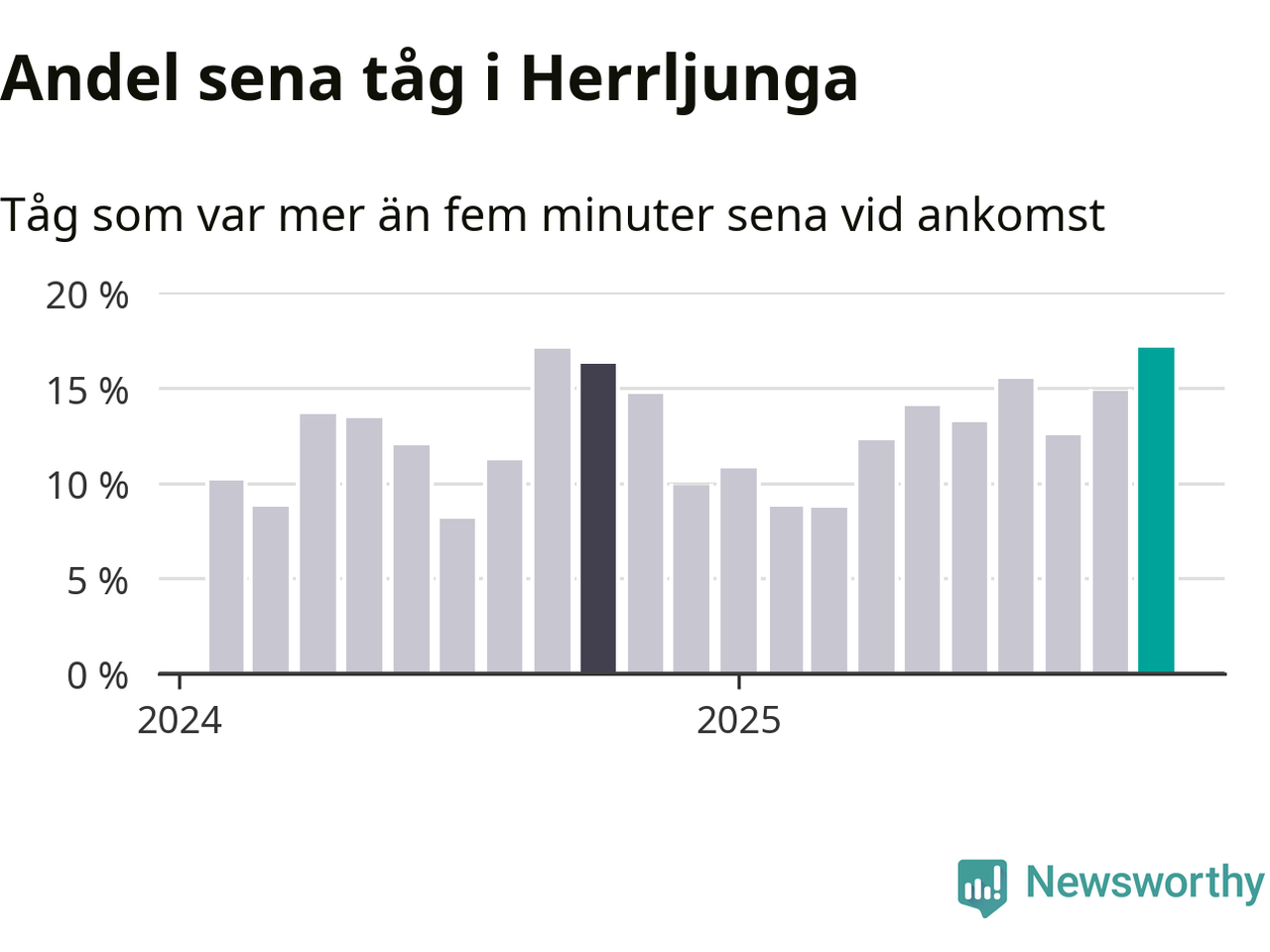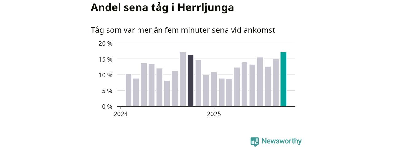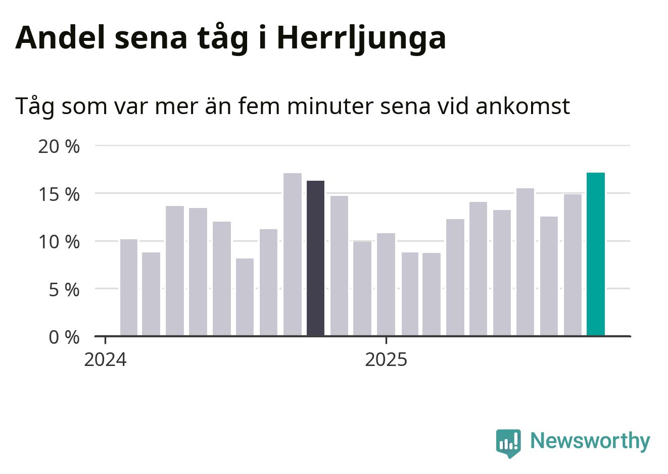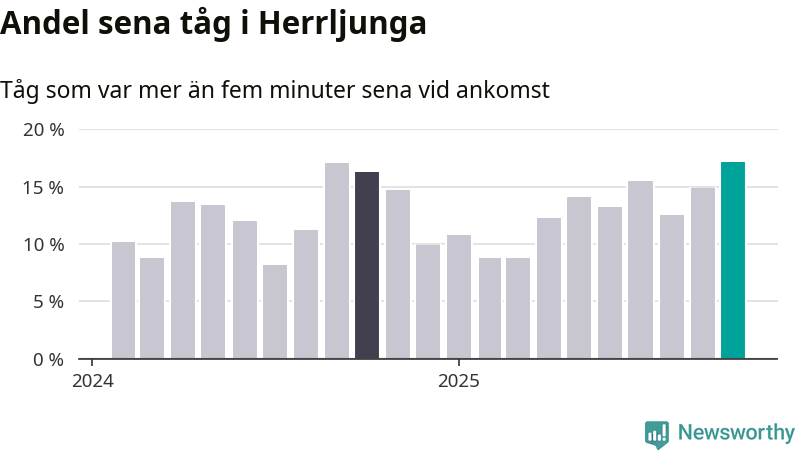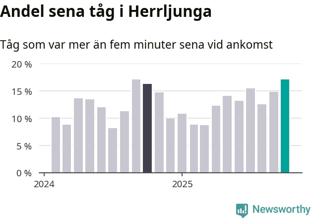 17 procent är den högsta andelen sena tåg sedan åtminstone den hårt förseningsdrabbade vintern 2023/24. Siffrorna bygger på realtidsinformation om tågavgångar och ankomster från Trafikverket, som Newsworthy löpande samlar in.