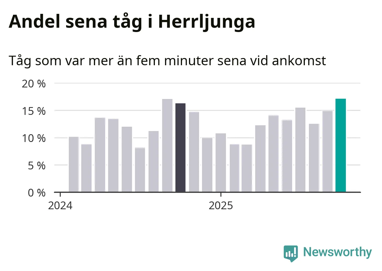 Av omkring 3 400 tåg som passerade någon av stationerna i Herrljunga kommun i oktober var 575 mer än fem minuter sena. Det motsvarar 17 procent, en bra bit över den nationella målsättningen som säger att inte mer än fem procent av tågen ska vara sena.