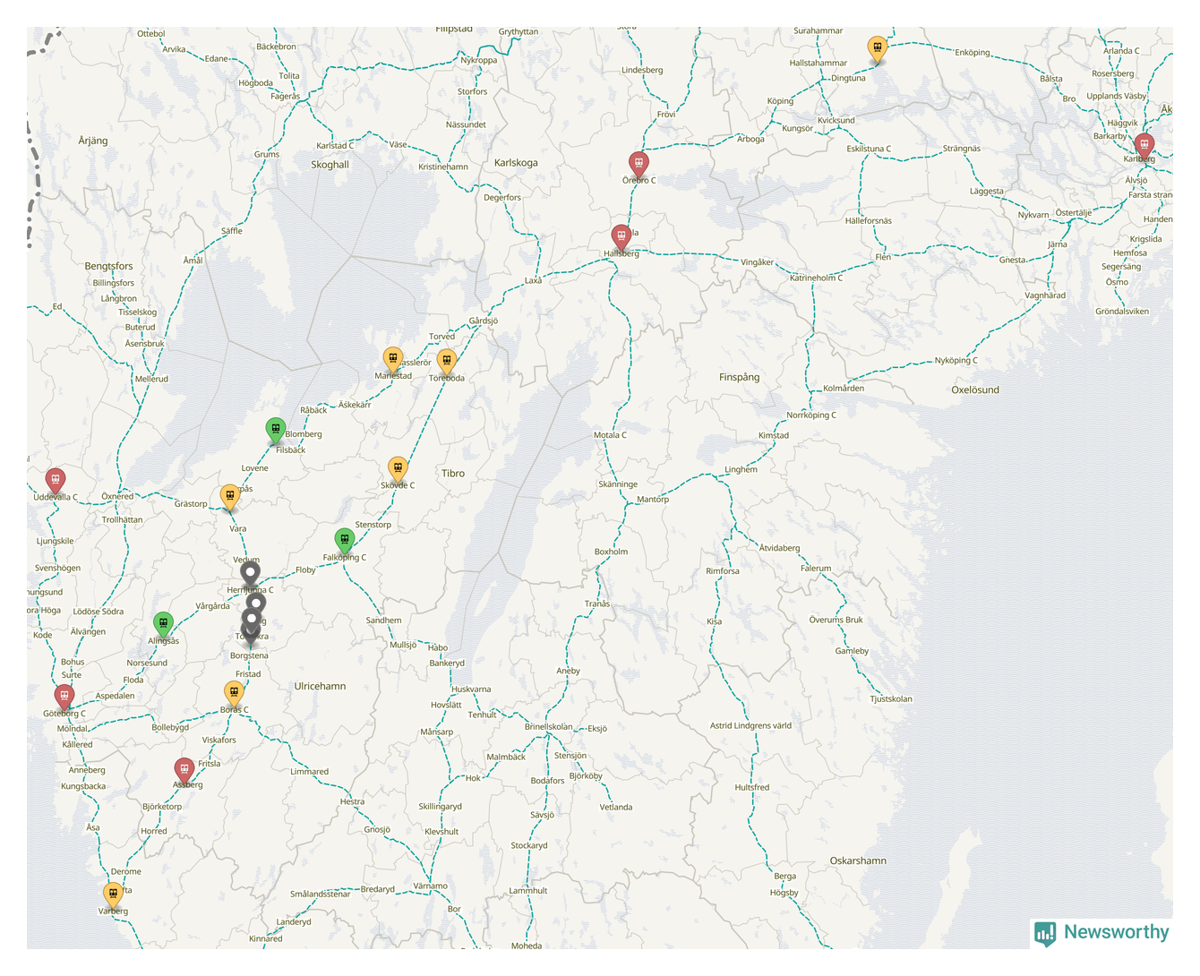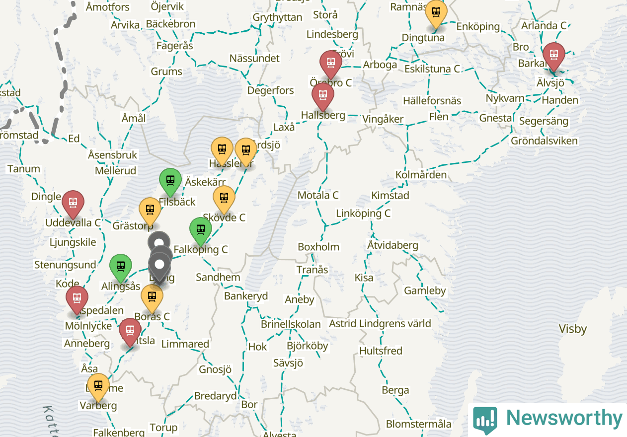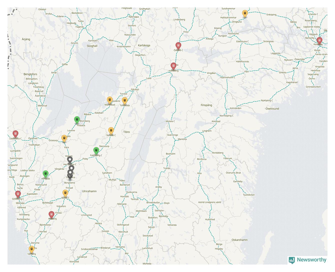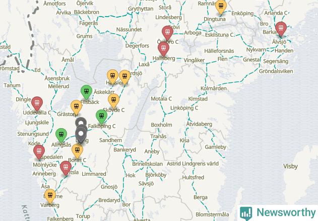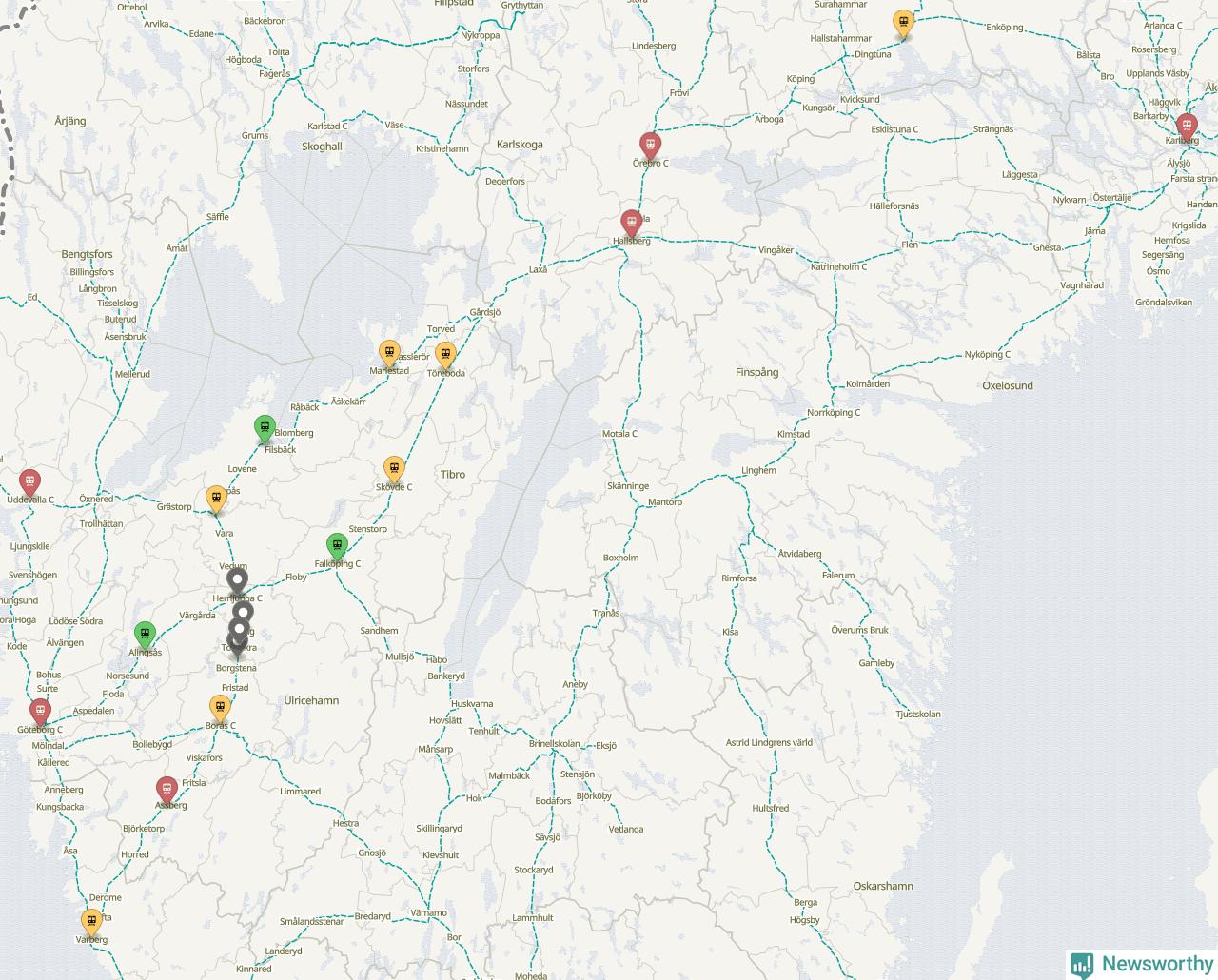 Kartdata från Mapbox, Newsworthy, OpenStreetMap och Trafikverket. Uppgifter om sträckor med passagerartrafik från jarnvag.net.