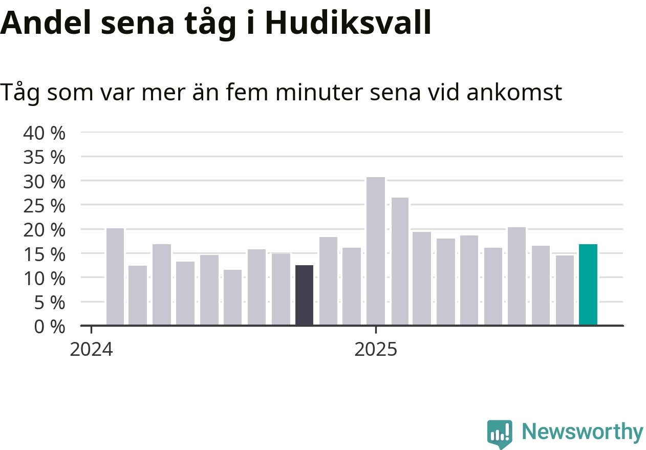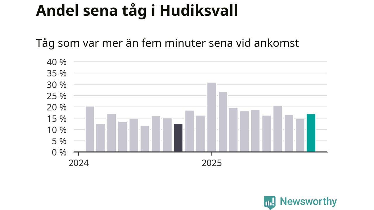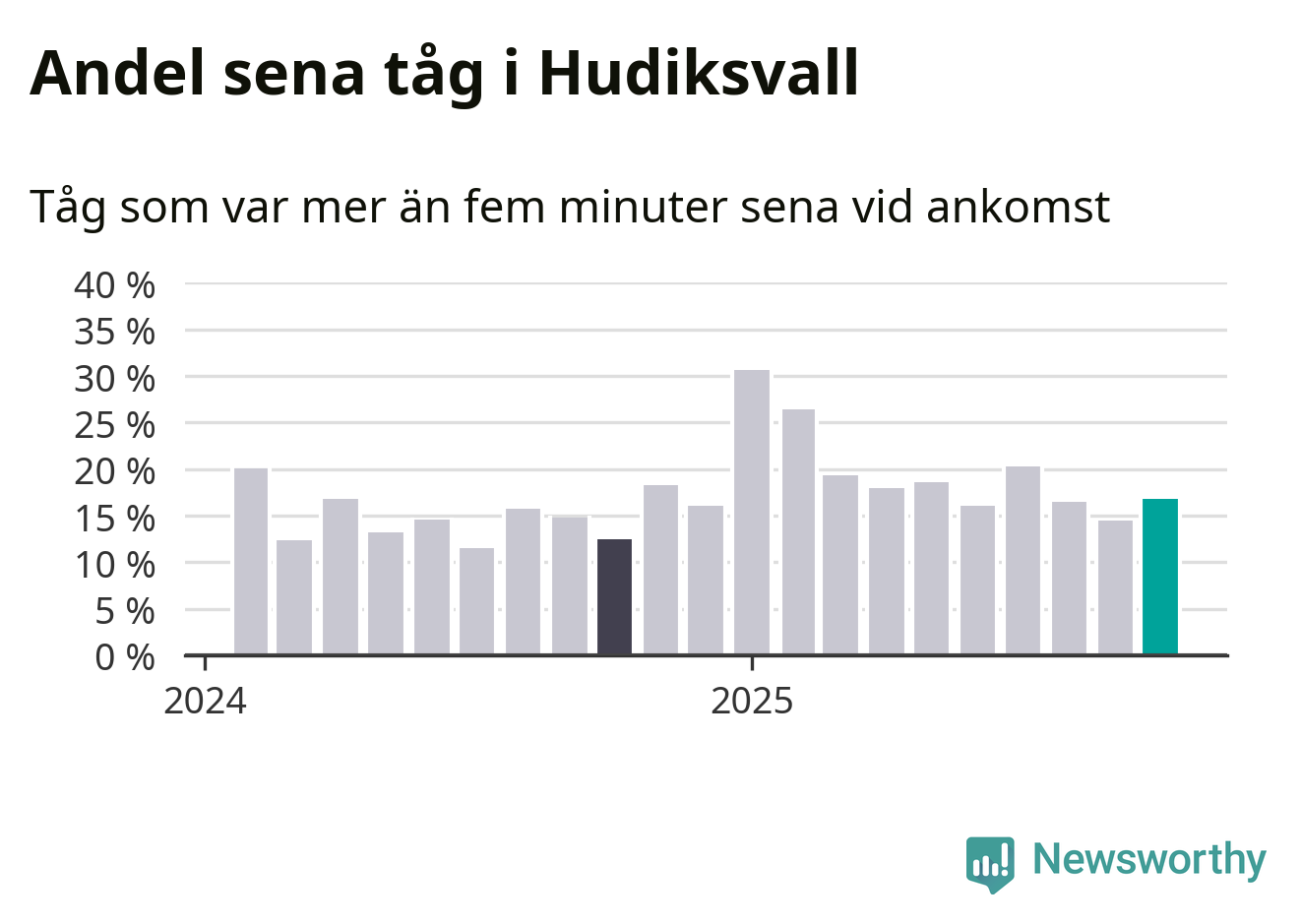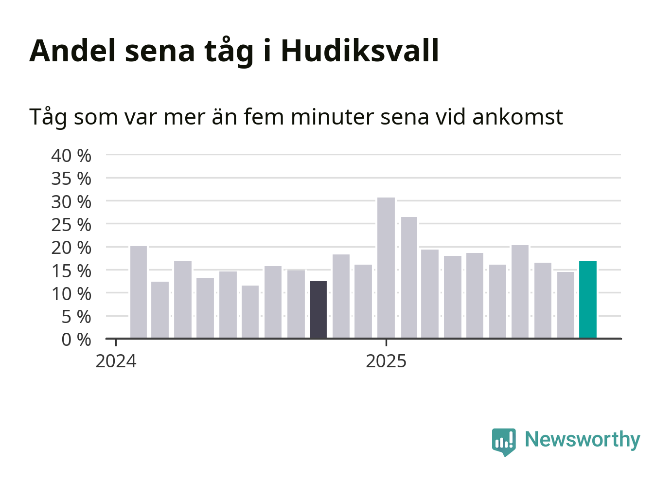 17 procent kan jämföras med 14 procent månaden innan, och tolv procent i oktober 2024. Siffrorna bygger på realtidsinformation om tågavgångar och ankomster från Trafikverket, som Newsworthy löpande samlar in.