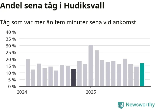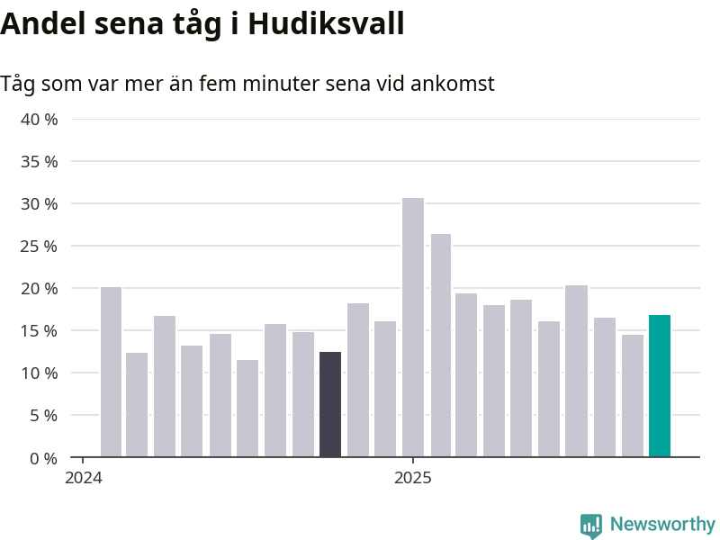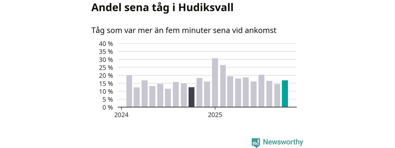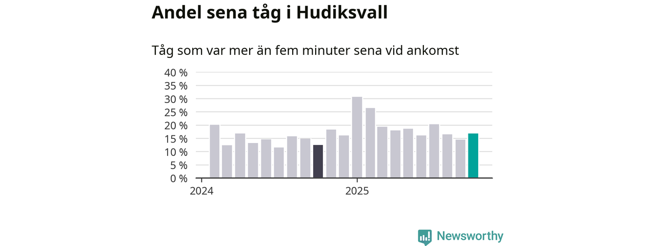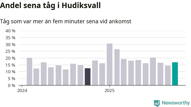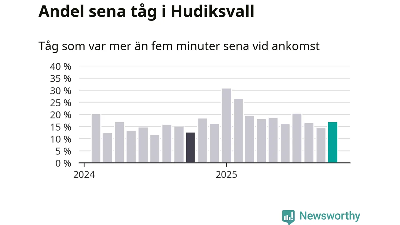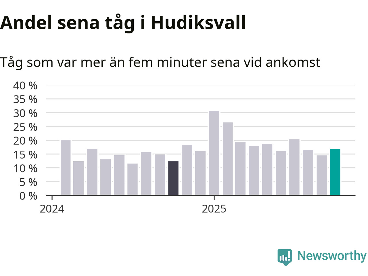 17 procent kan jämföras med 14 procent månaden innan, och tolv procent i oktober 2024. Siffrorna bygger på realtidsinformation om tågavgångar och ankomster från Trafikverket, som Newsworthy löpande samlar in.