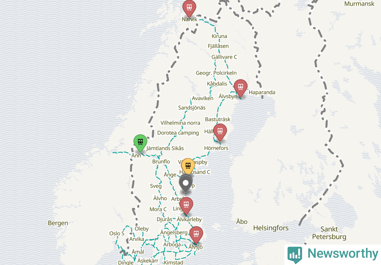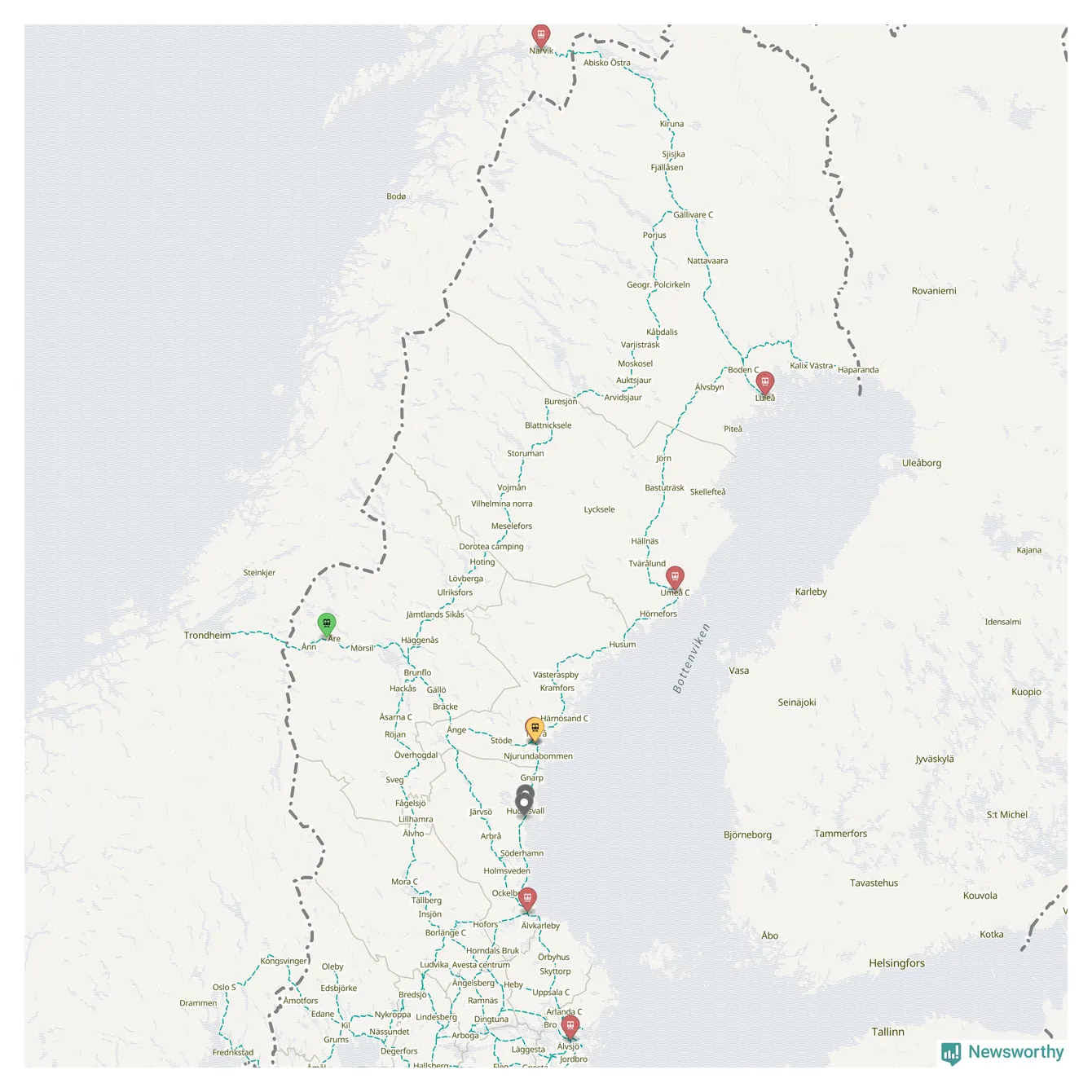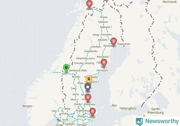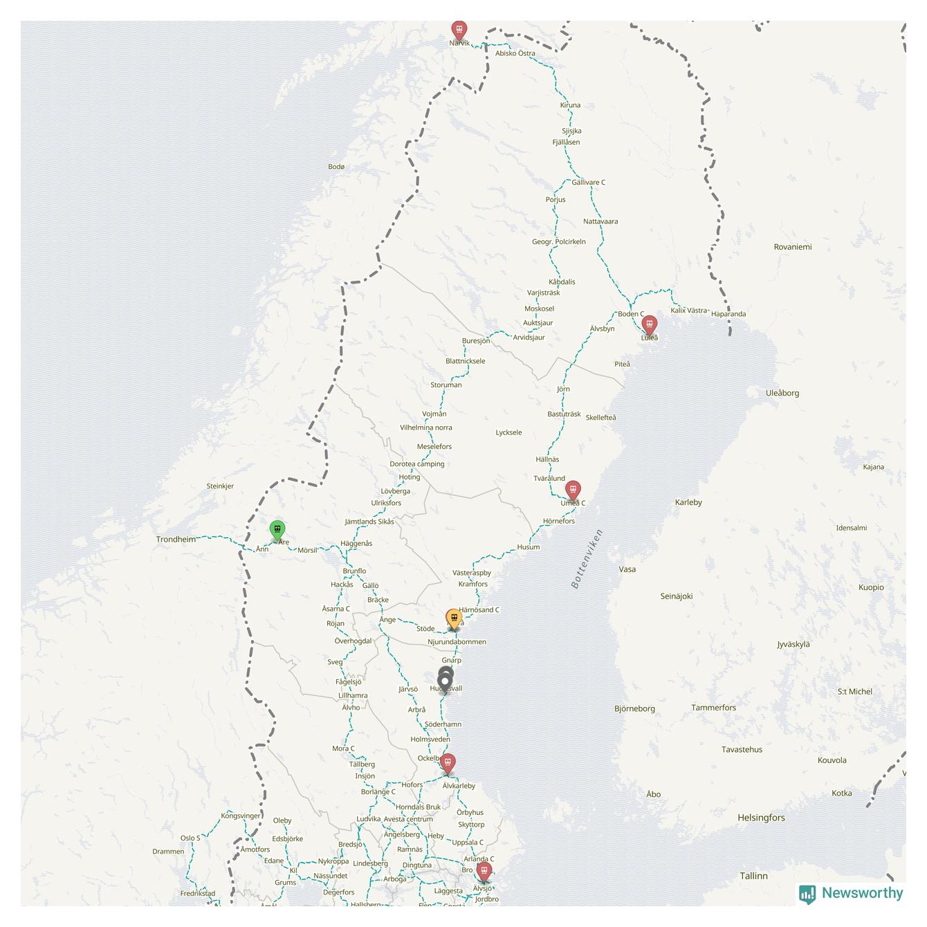 Kartdata från Mapbox, Newsworthy, OpenStreetMap och Trafikverket. Uppgifter om sträckor med passagerartrafik från jarnvag.net.