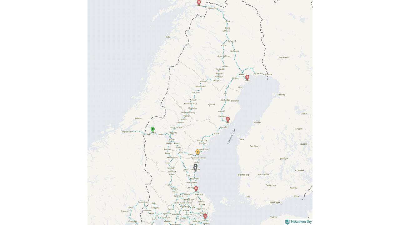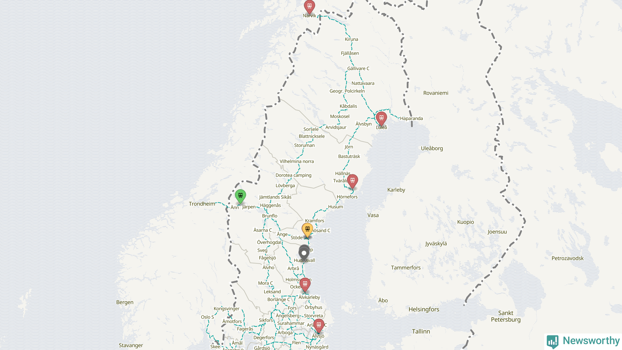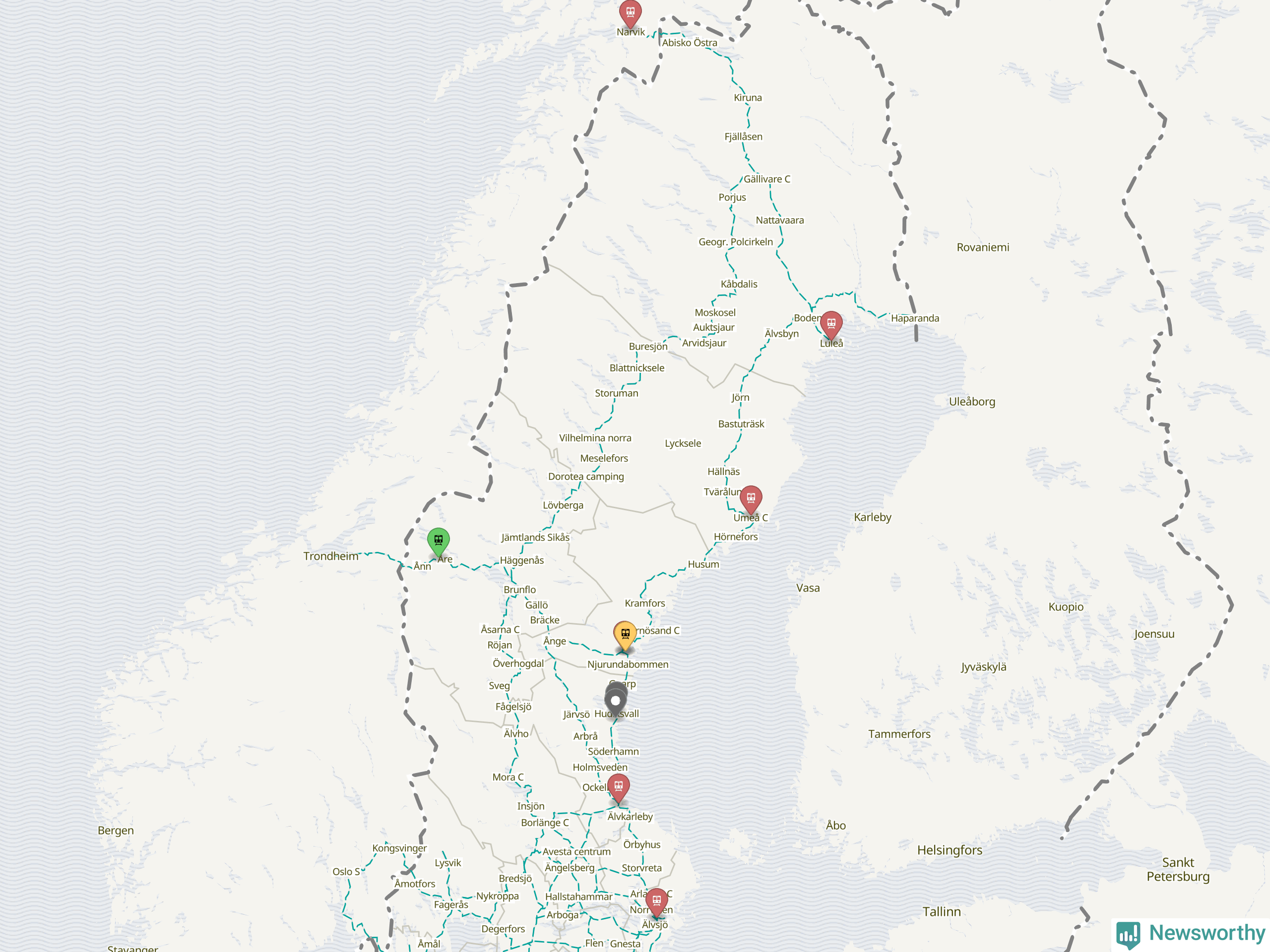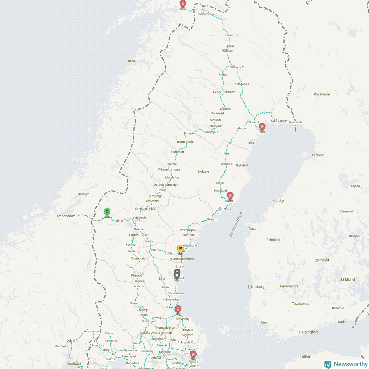 Kartdata från Mapbox, Newsworthy, OpenStreetMap och Trafikverket. Uppgifter om sträckor med passagerartrafik från jarnvag.net.