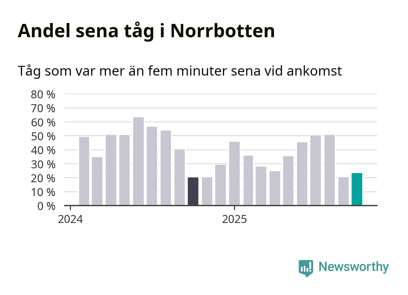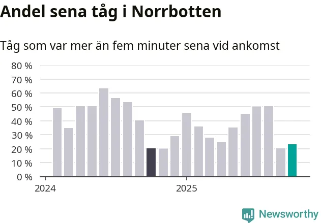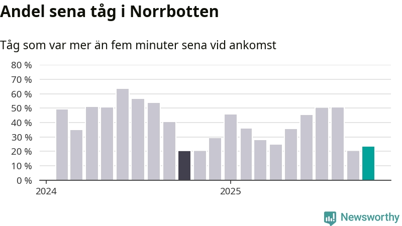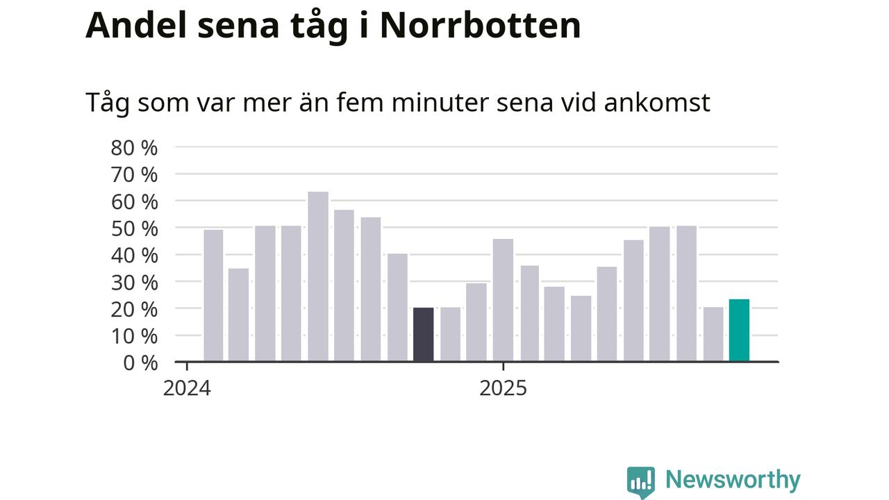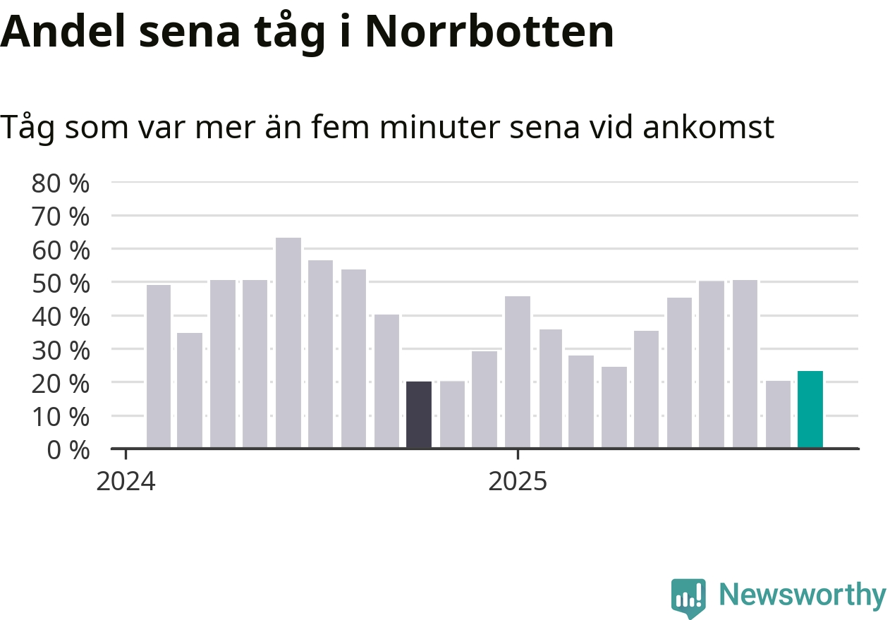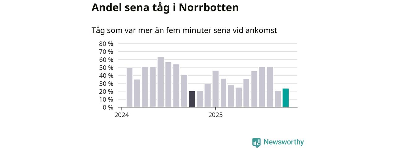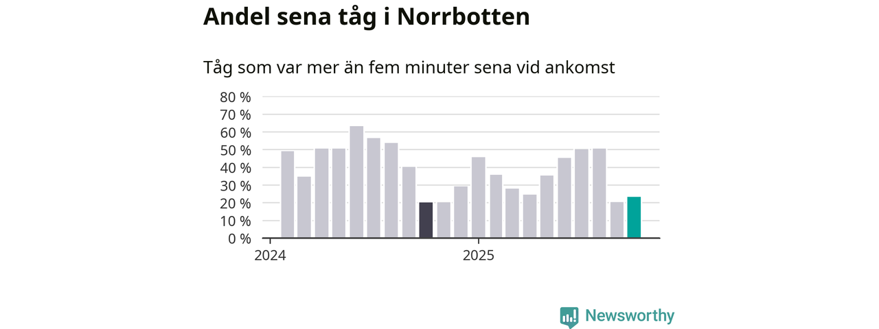 23 procent kan jämföras med 20 procent månaden innan, och 20 procent i oktober 2024. Siffrorna bygger på realtidsinformation om tågavgångar och ankomster från Trafikverket, som Newsworthy löpande samlar in.