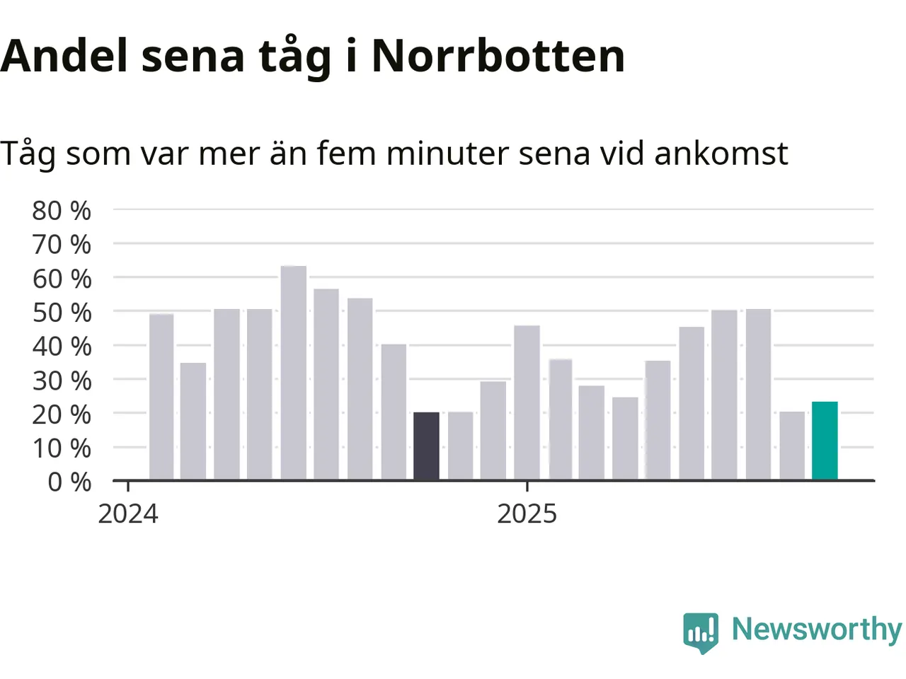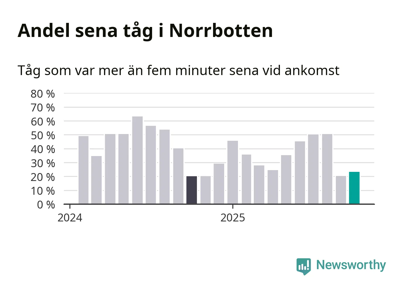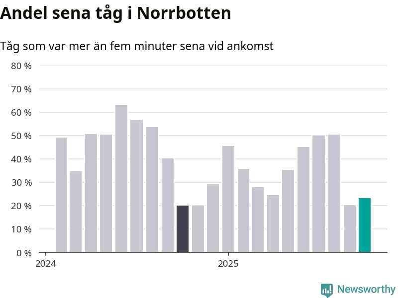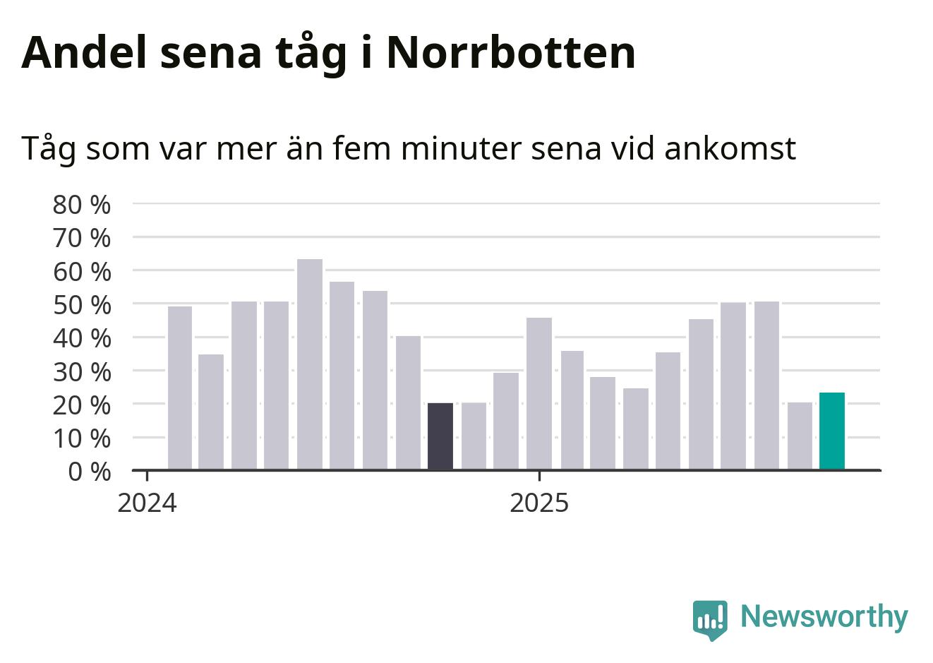 23 procent kan jämföras med 20 procent månaden innan, och 20 procent i oktober 2024. Siffrorna bygger på realtidsinformation om tågavgångar och ankomster från Trafikverket, som Newsworthy löpande samlar in.