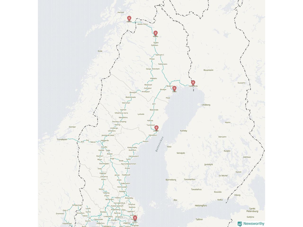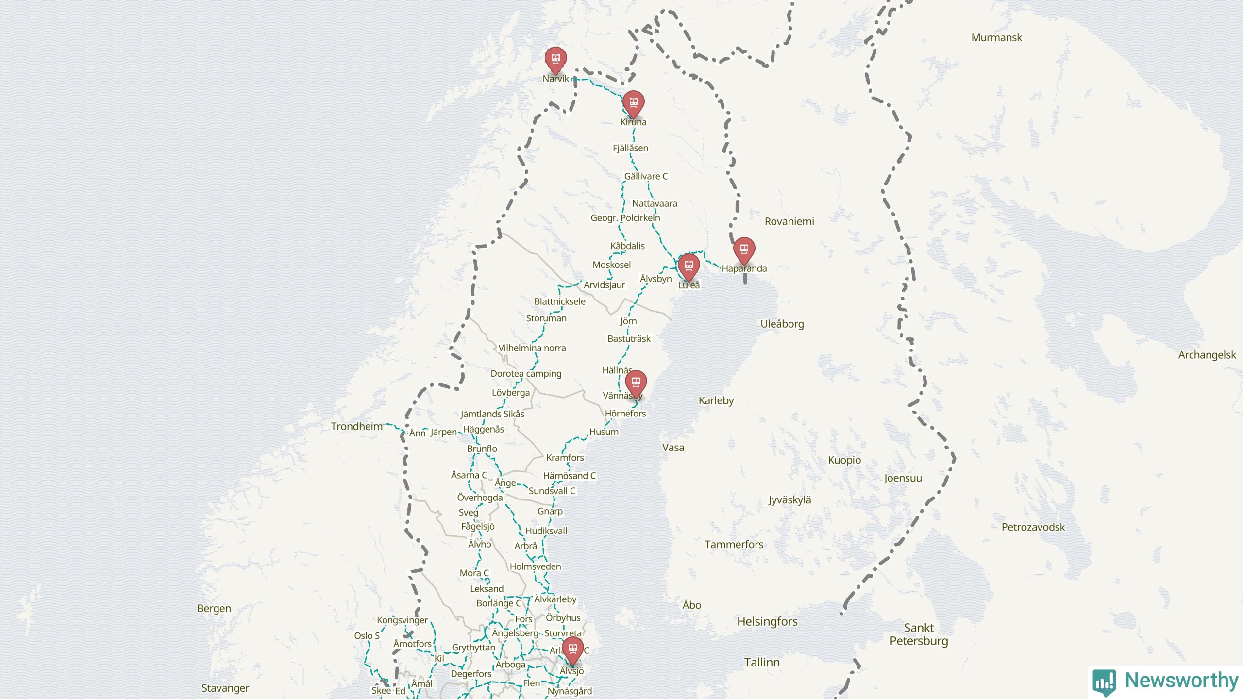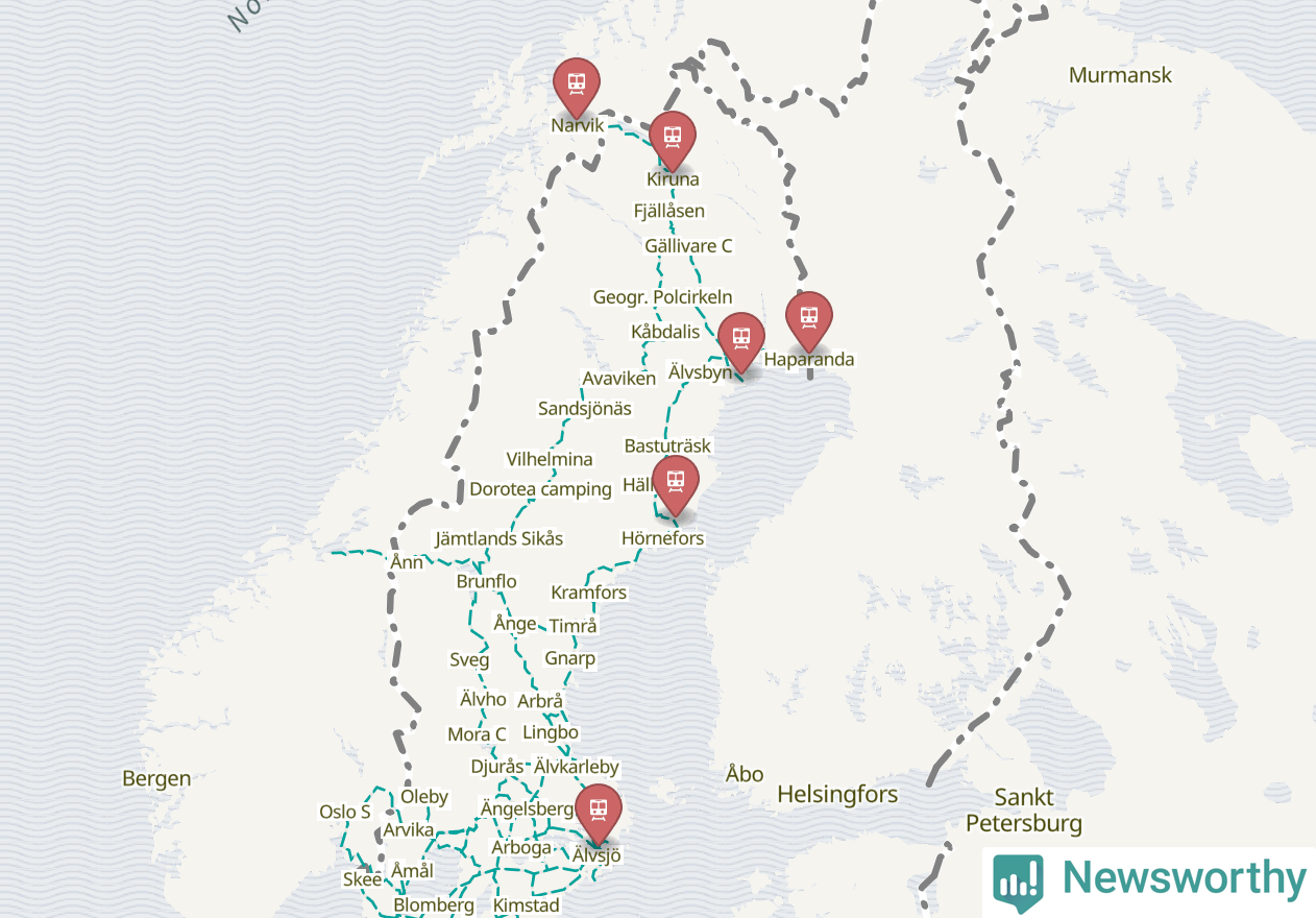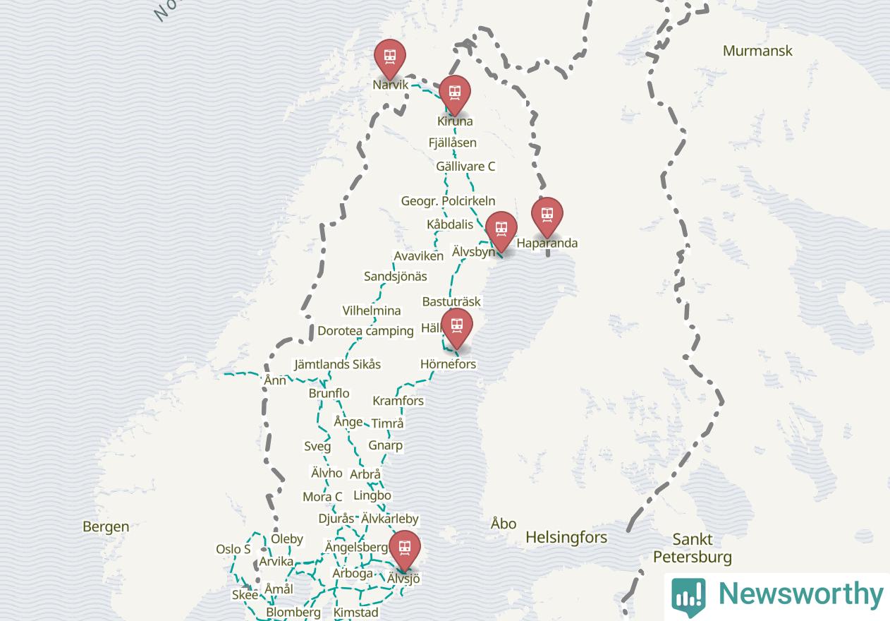 Kartdata från Mapbox, Newsworthy, OpenStreetMap och Trafikverket. Uppgifter om sträckor med passagerartrafik från jarnvag.net.