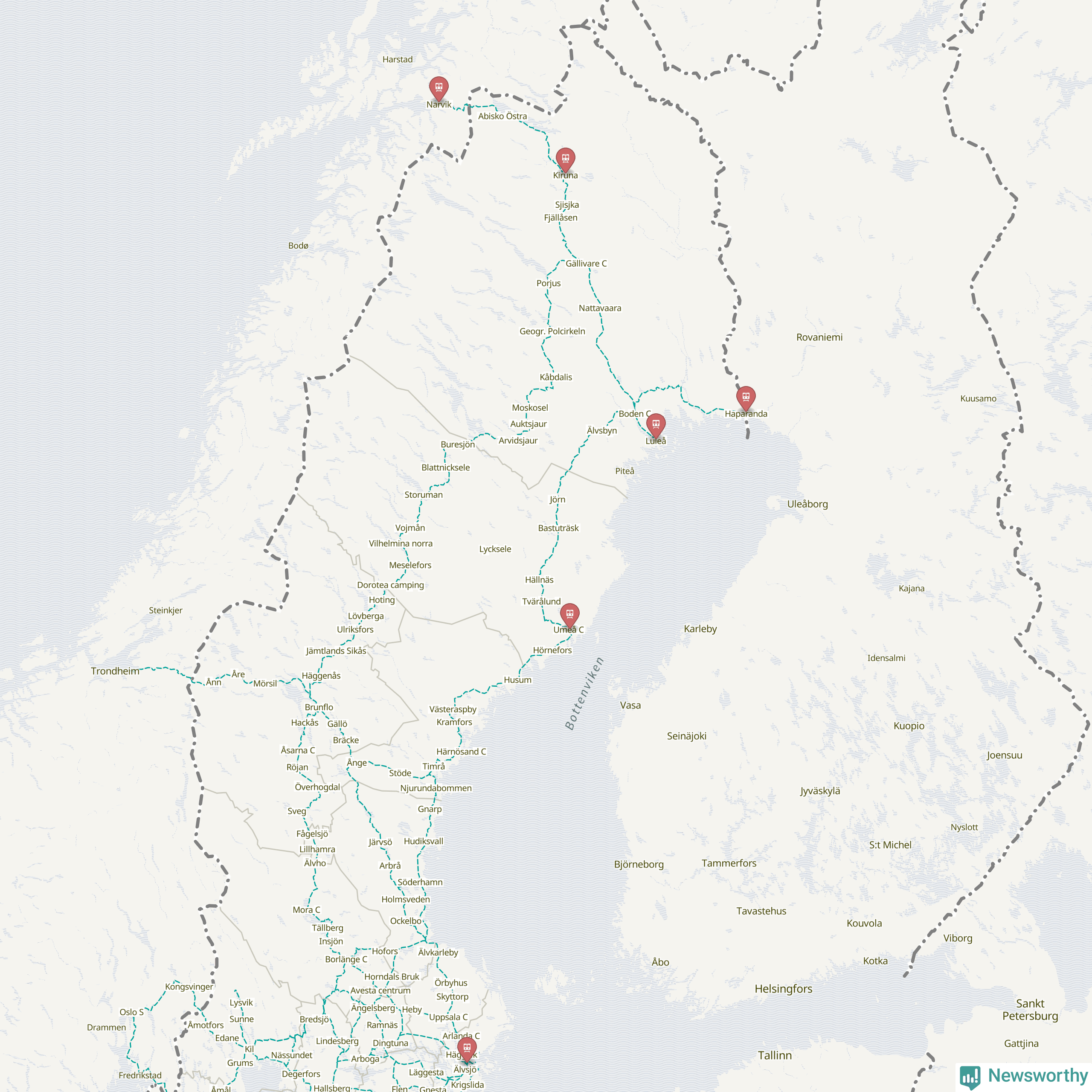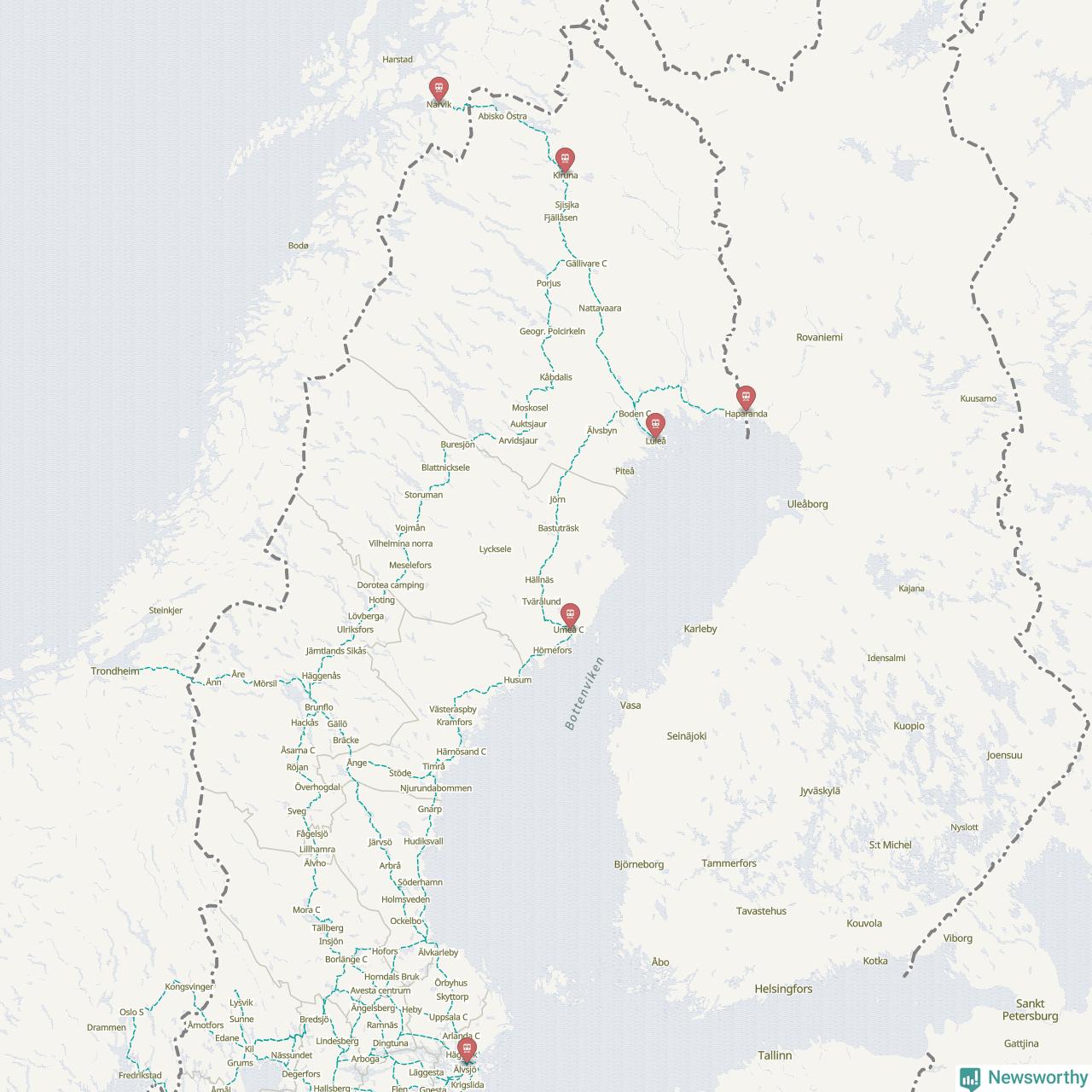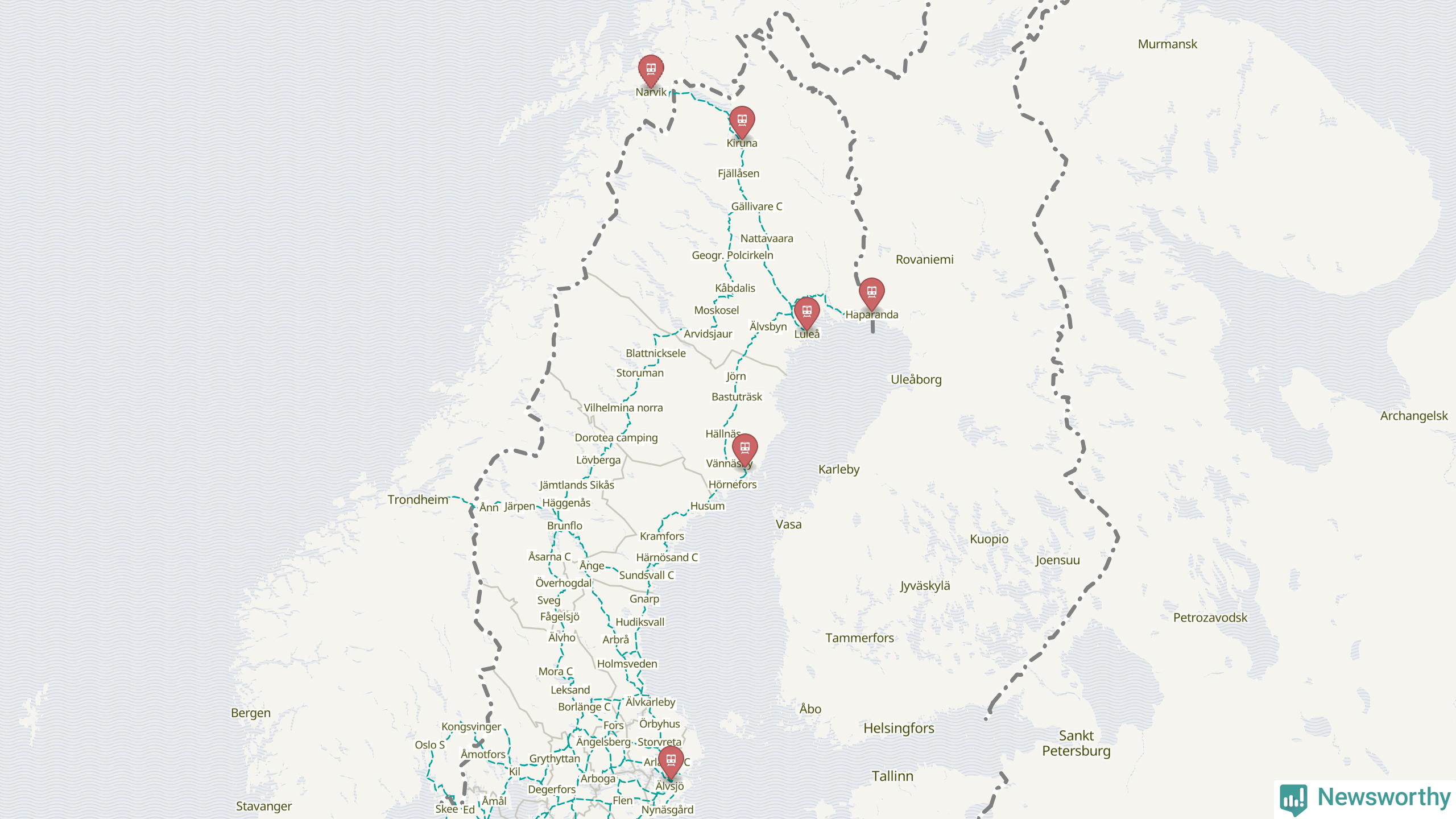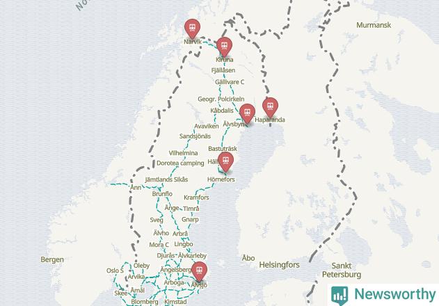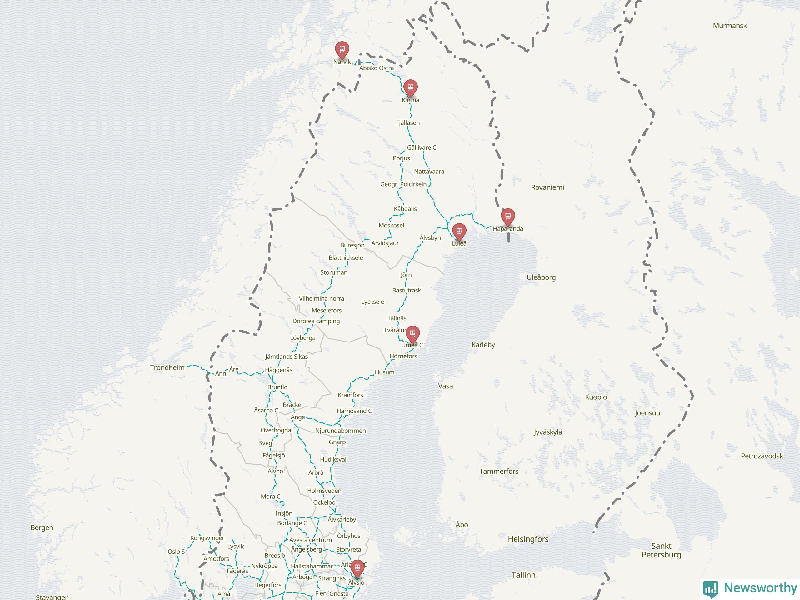 Kartdata från Mapbox, Newsworthy, OpenStreetMap och Trafikverket. Uppgifter om sträckor med passagerartrafik från jarnvag.net.