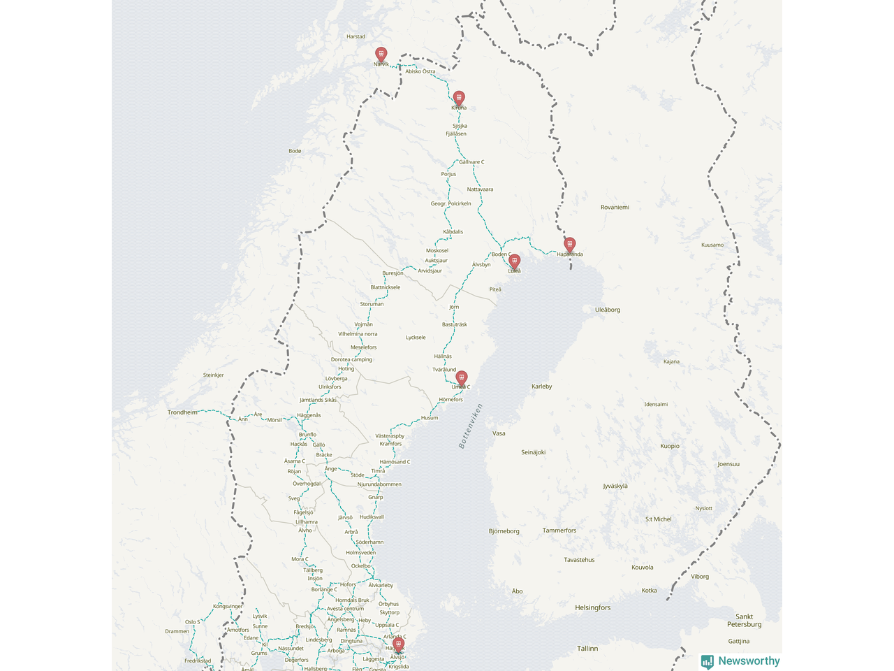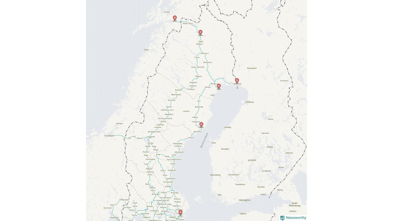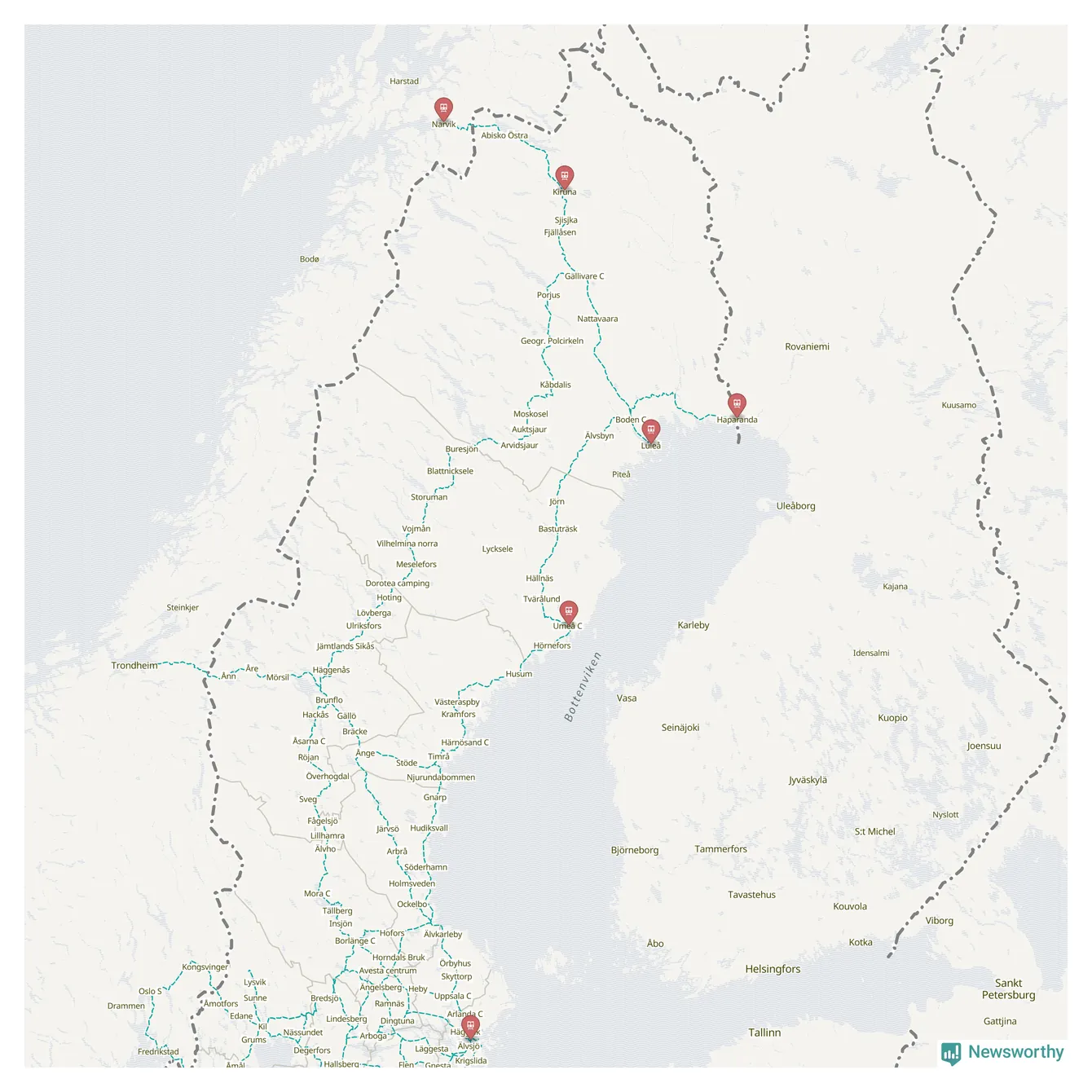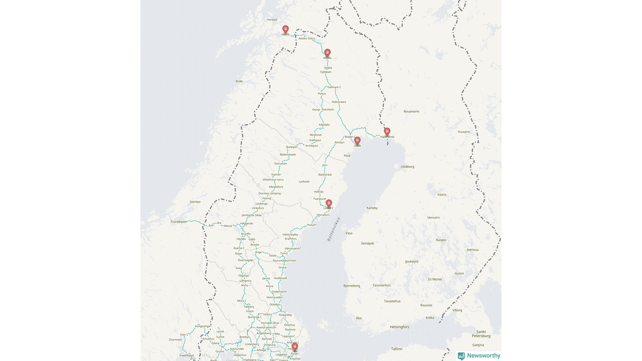 Kartdata från Mapbox, Newsworthy, OpenStreetMap och Trafikverket. Uppgifter om sträckor med passagerartrafik från jarnvag.net.