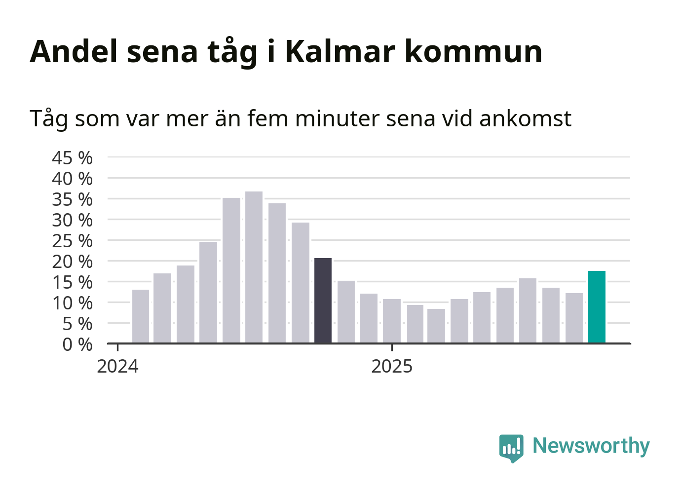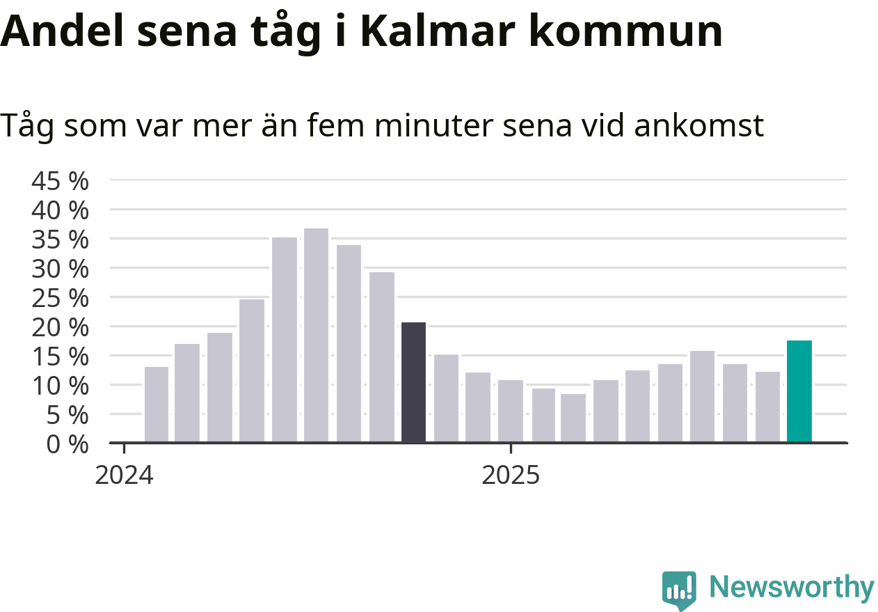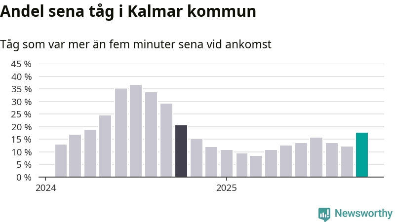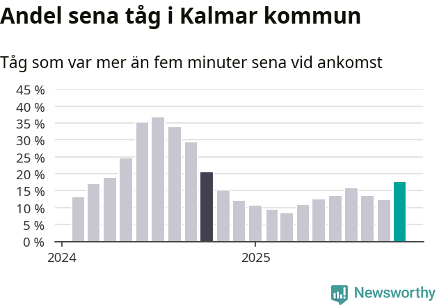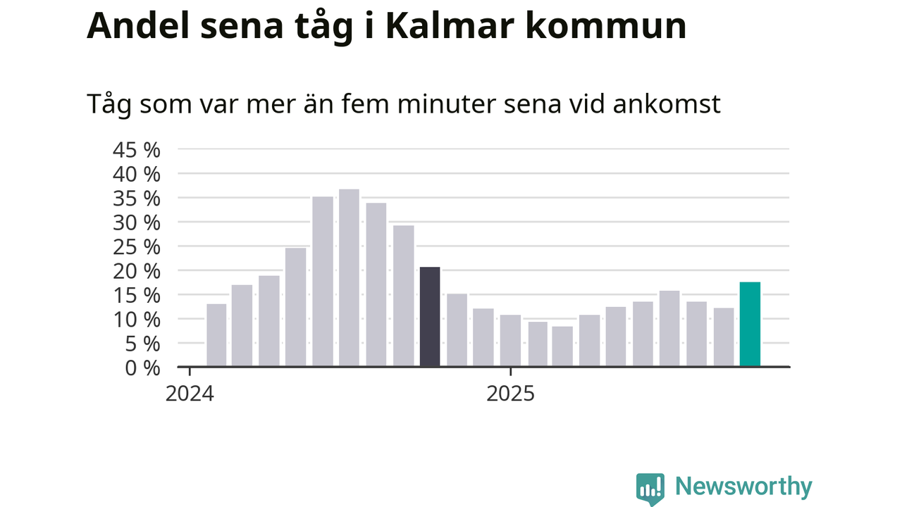 Så hög har andelen förseningar inte varit sedan oktober 2024. Siffrorna bygger på realtidsinformation om tågavgångar och ankomster från Trafikverket, som Newsworthy löpande samlar in.