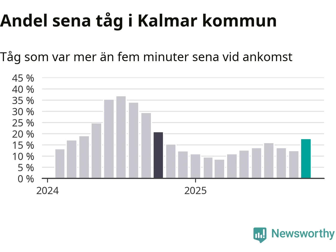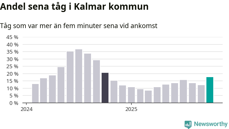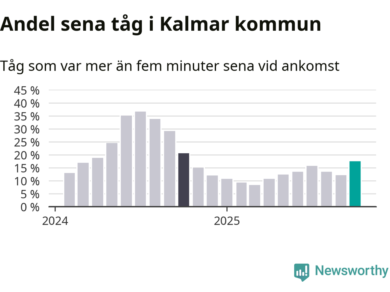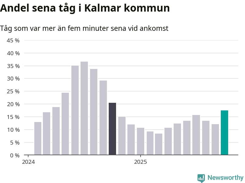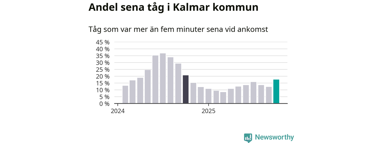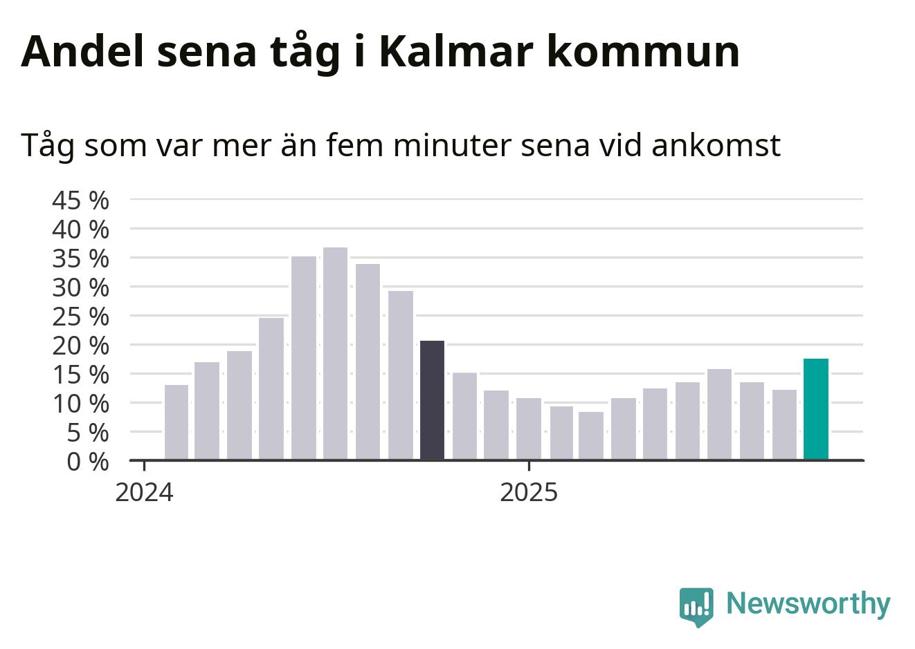Så hög har andelen förseningar inte varit sedan oktober 2024. Siffrorna bygger på realtidsinformation om tågavgångar och ankomster från Trafikverket, som Newsworthy löpande samlar in.