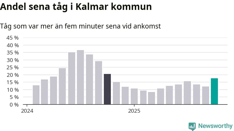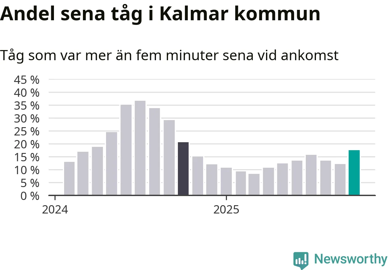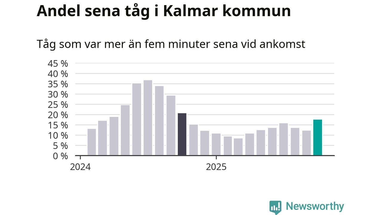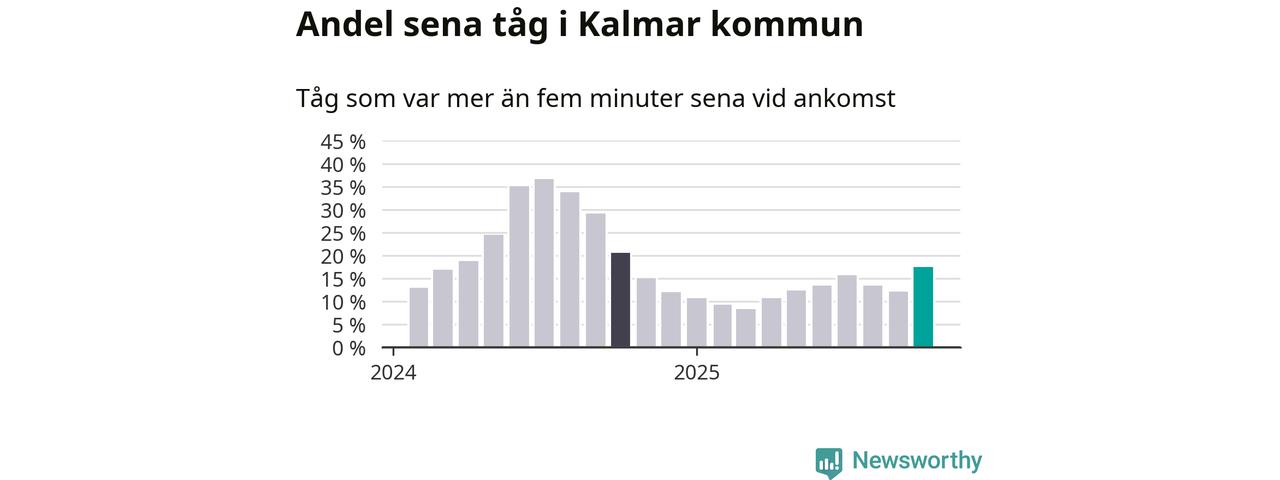 Av knappt 1 200 tåg som passerade någon av stationerna i Kalmar kommun i oktober var 202 mer än fem minuter sena. Det motsvarar 17 procent, en bra bit över den nationella målsättningen som säger att inte mer än fem procent av tågen ska vara sena.