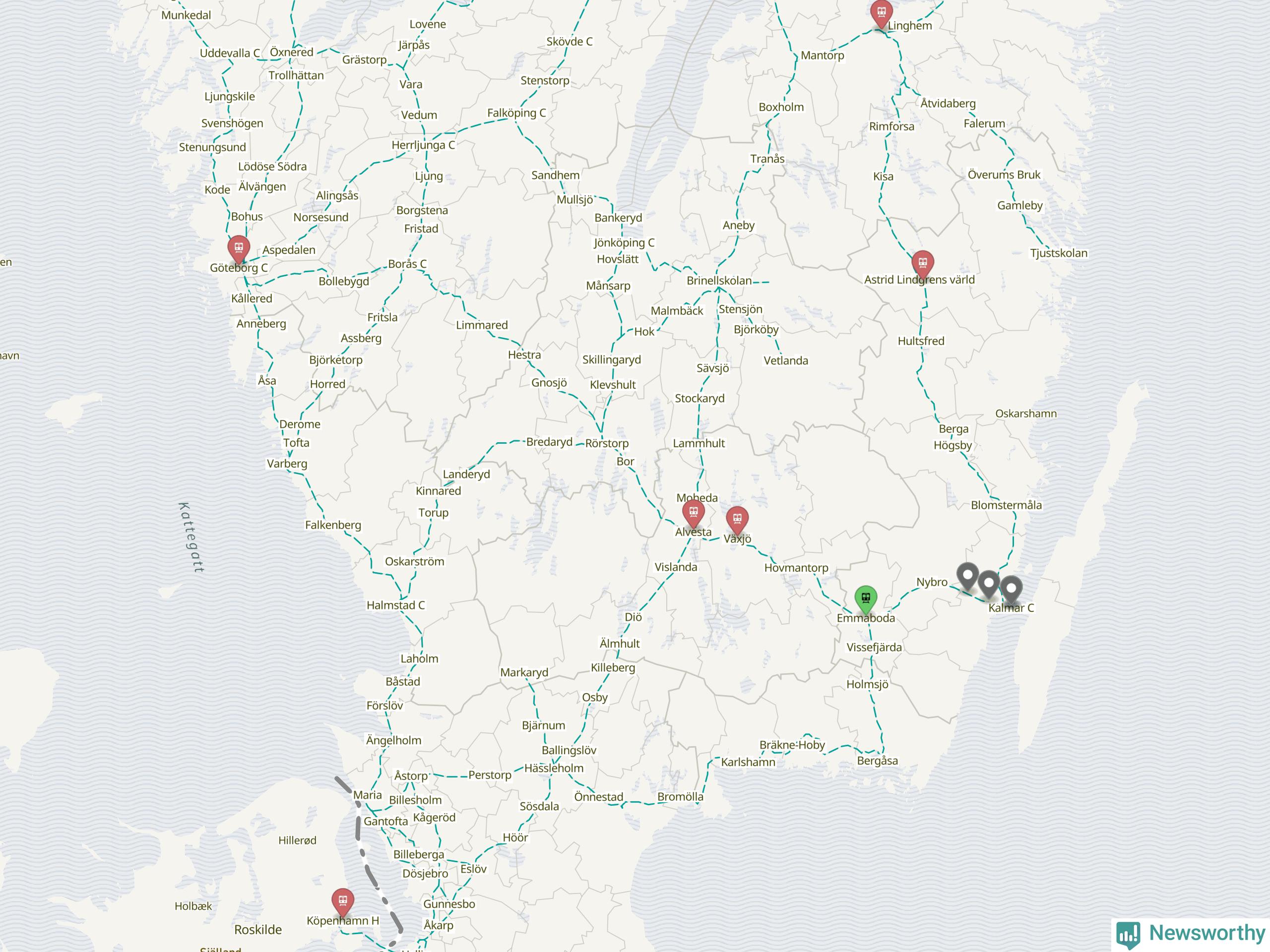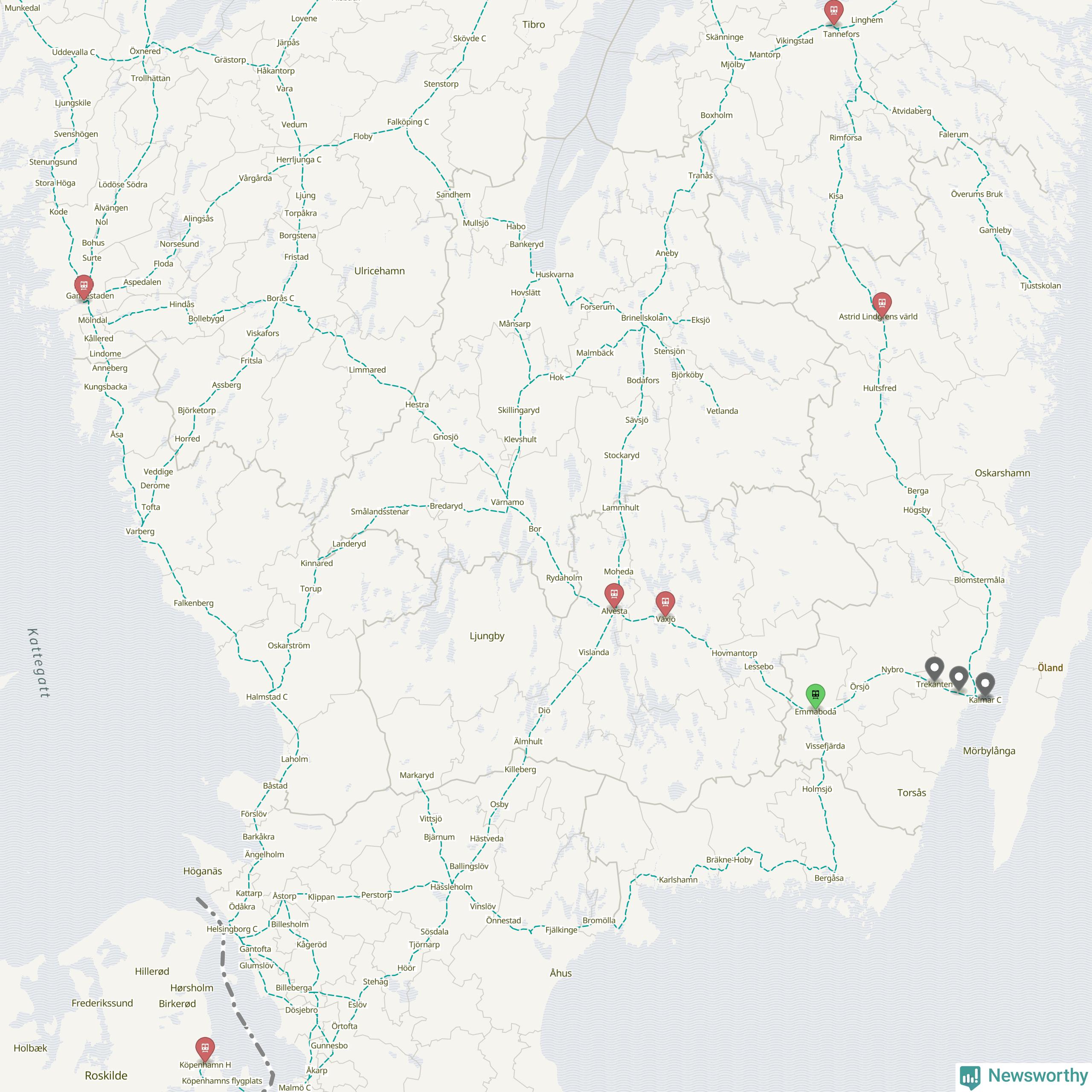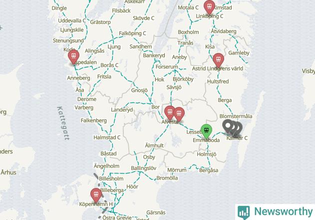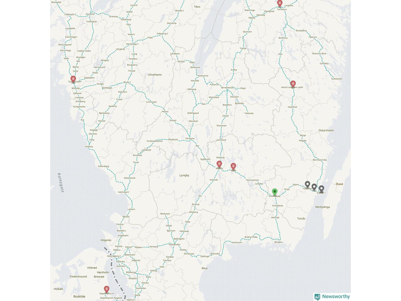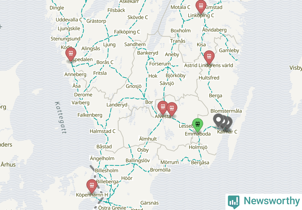 Kartdata från Mapbox, Newsworthy, OpenStreetMap och Trafikverket. Uppgifter om sträckor med passagerartrafik från jarnvag.net.