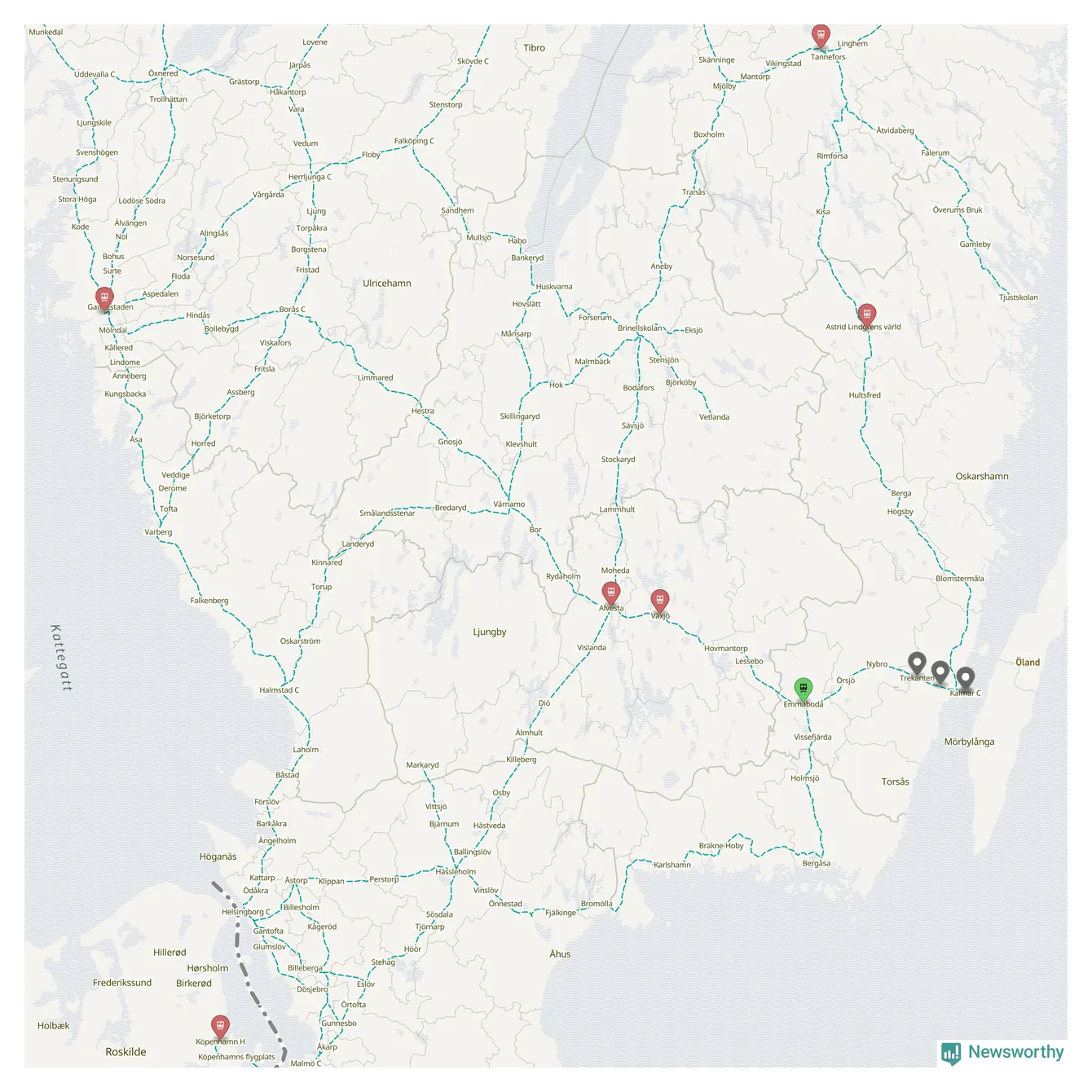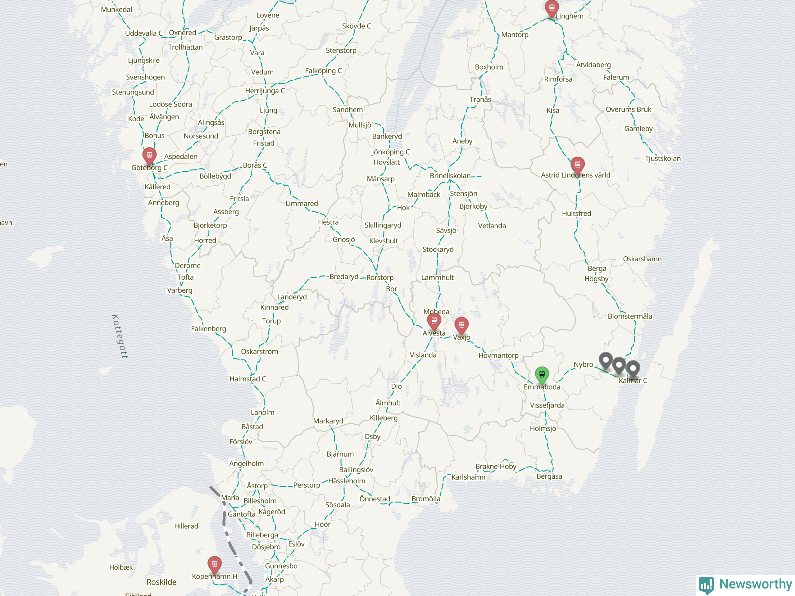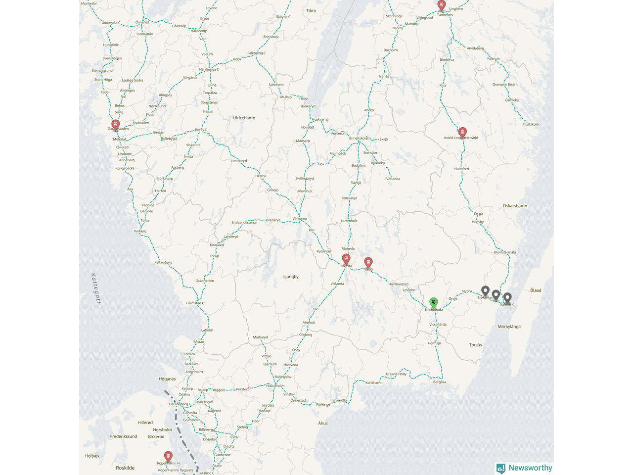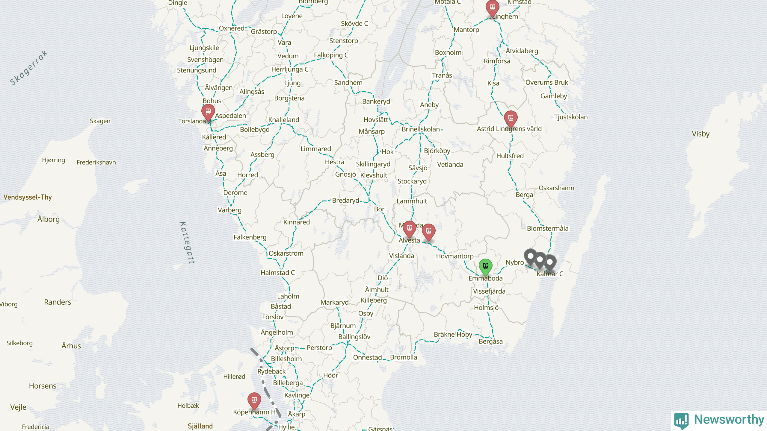 Kartdata från Mapbox, Newsworthy, OpenStreetMap och Trafikverket. Uppgifter om sträckor med passagerartrafik från jarnvag.net.