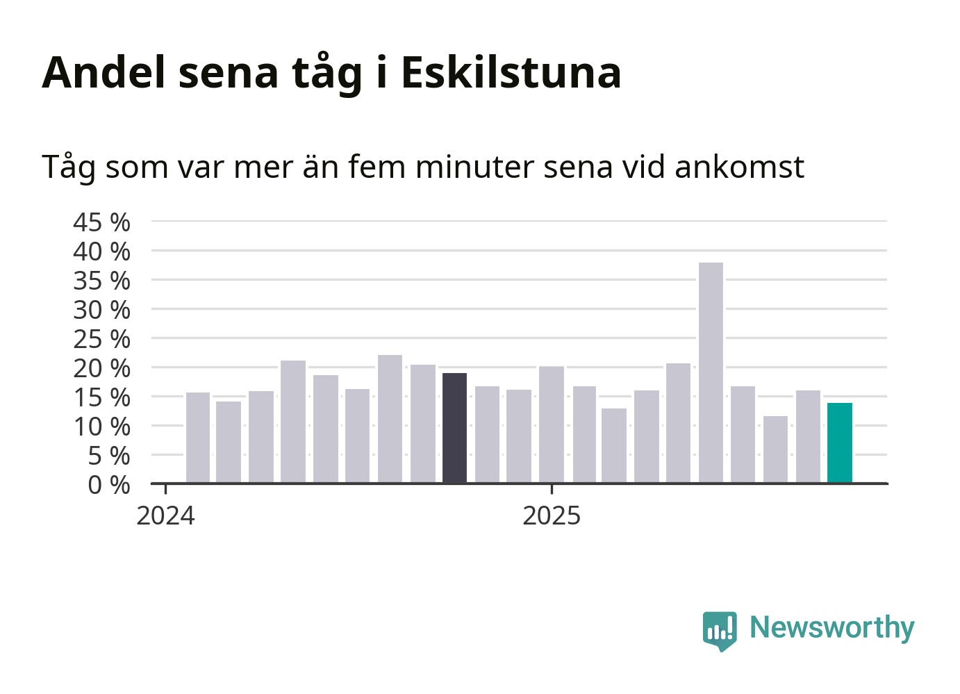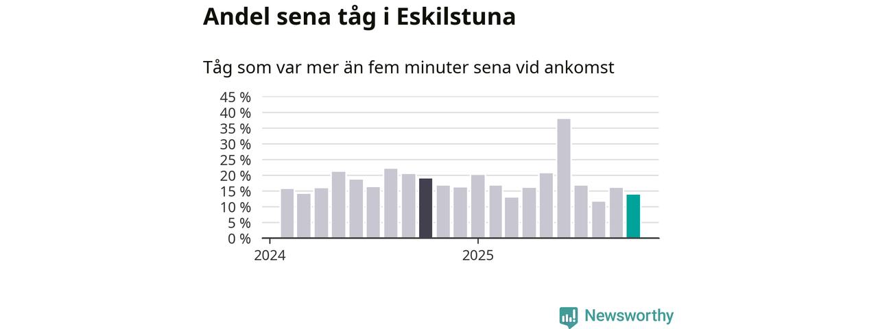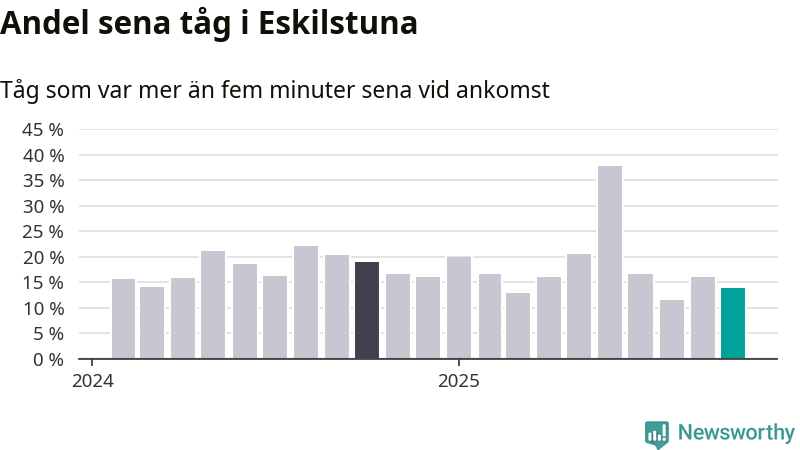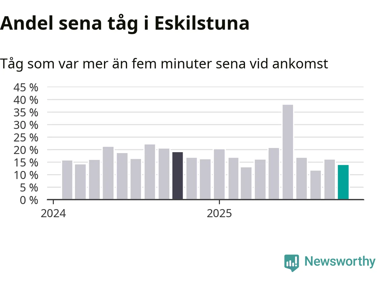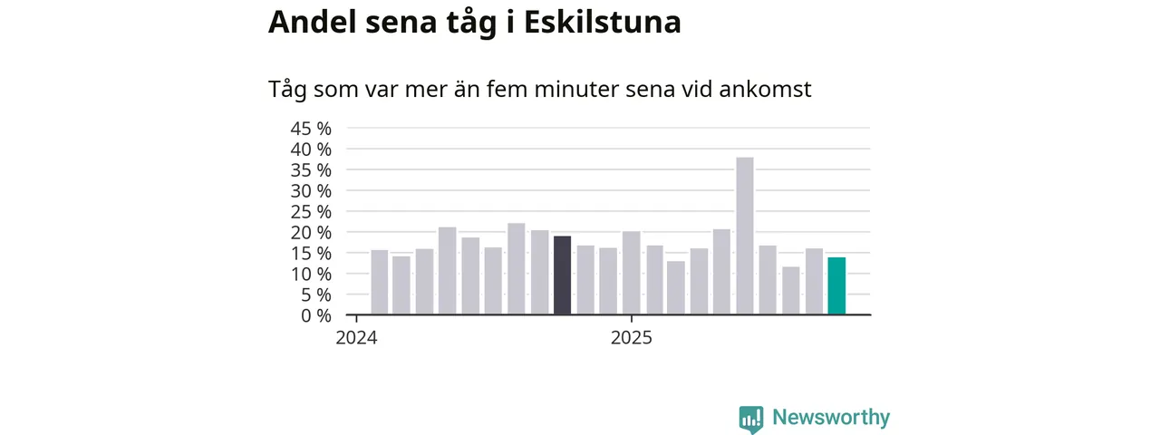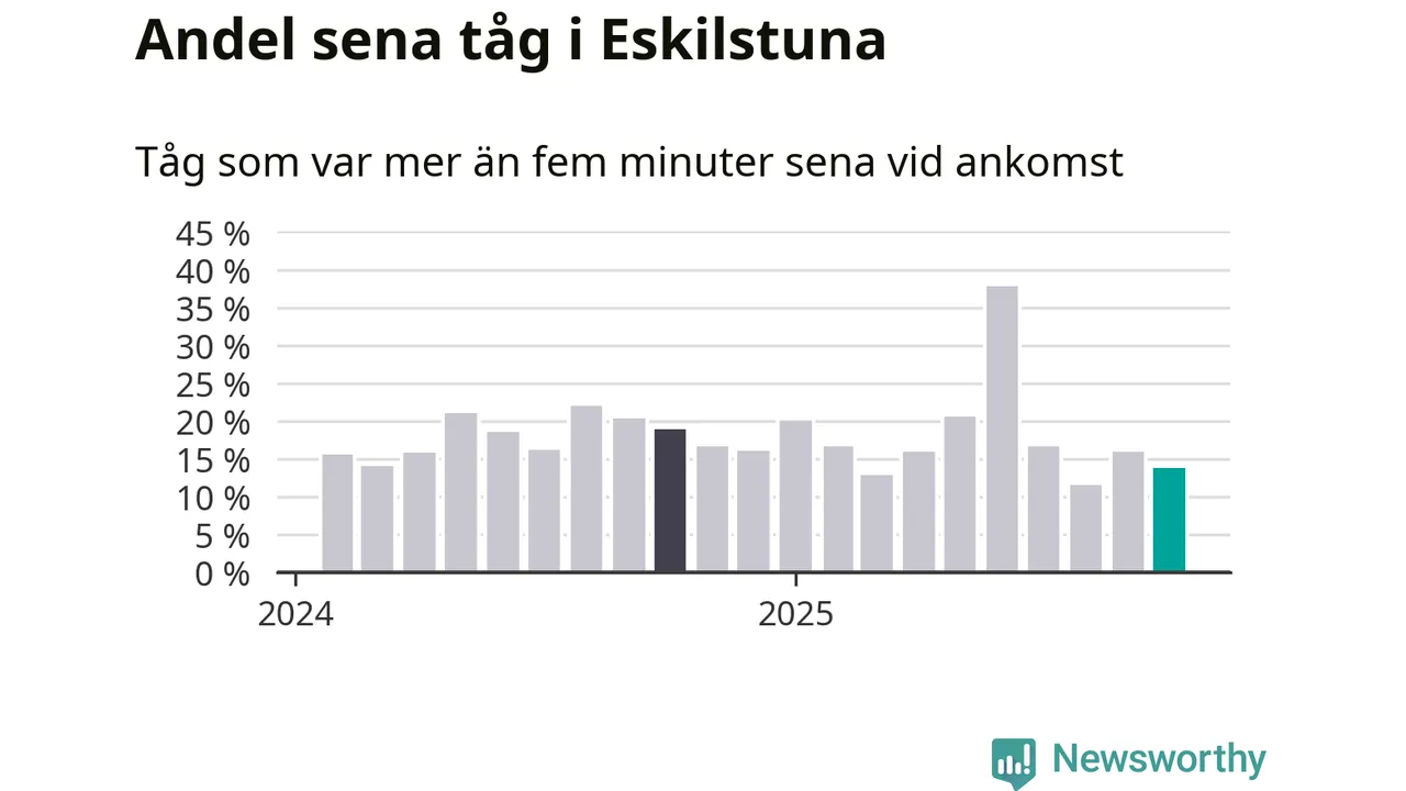 14 procent kan jämföras med 16 procent månaden innan, och 19 procent i oktober 2024. Siffrorna bygger på realtidsinformation om tågavgångar och ankomster från Trafikverket, som Newsworthy löpande samlar in.